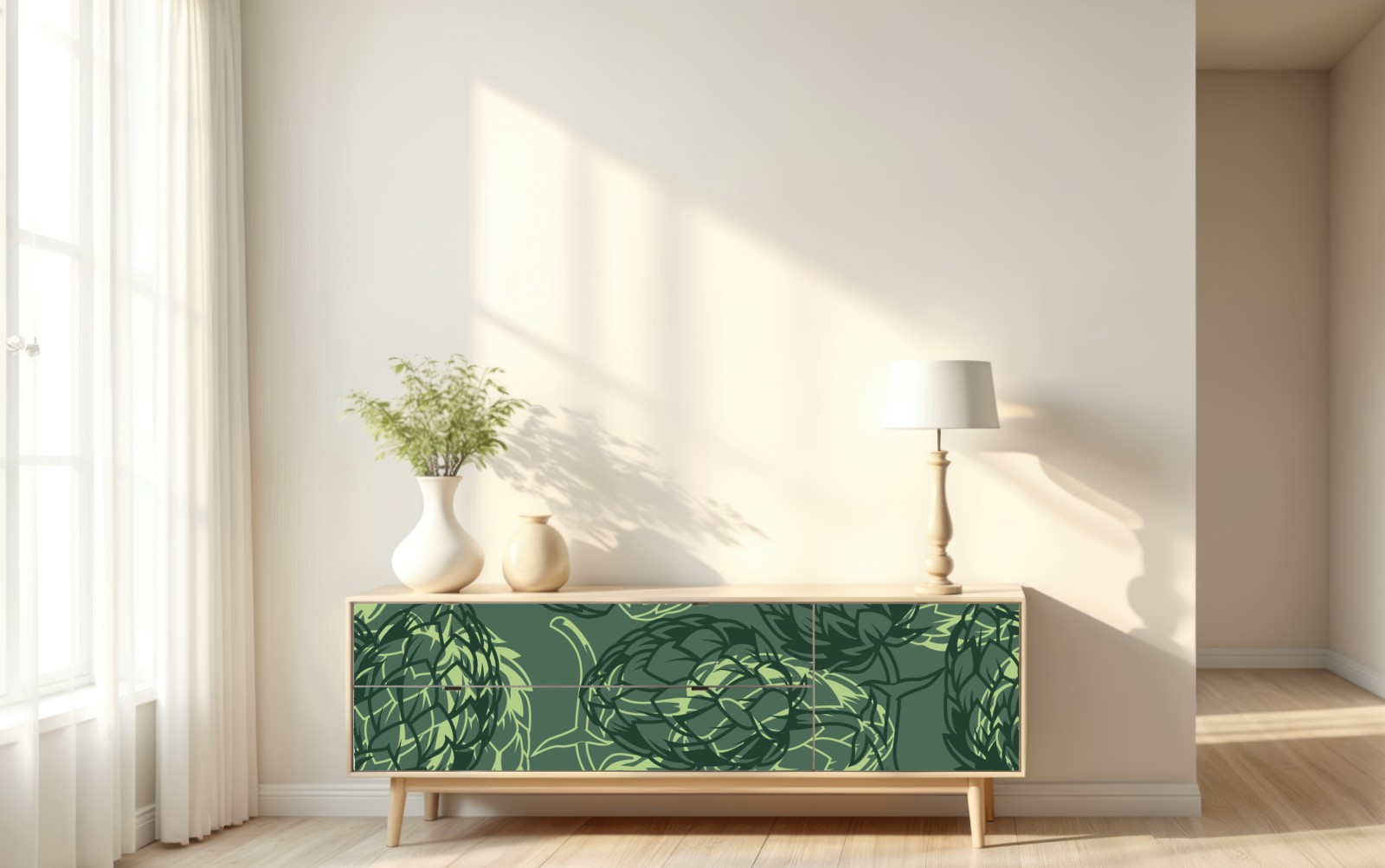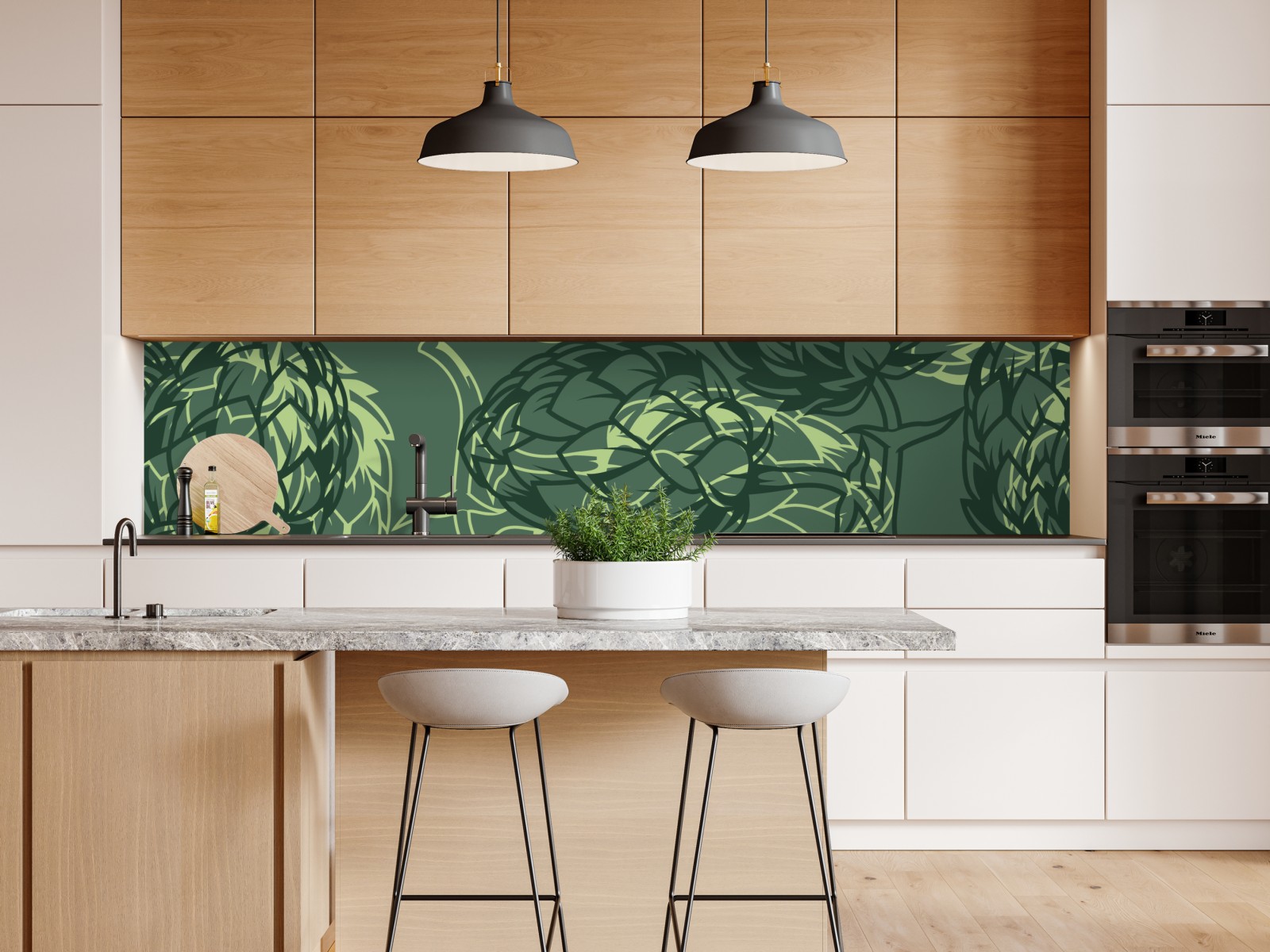 Ein mehrschichtiges Hopfenmuster in grünen Tönen, das rustikales Brauereiflair und botanische Textur in jeden Raum bringt.