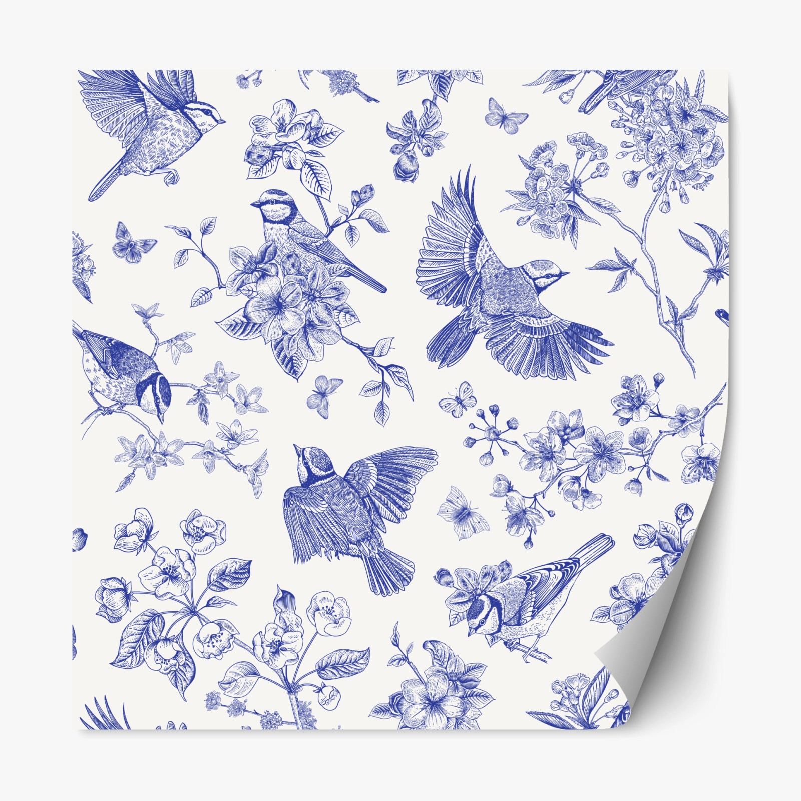 Repositionierbarer Aufkleber Blaues muster mit vögeln und blüten im vintage-stil