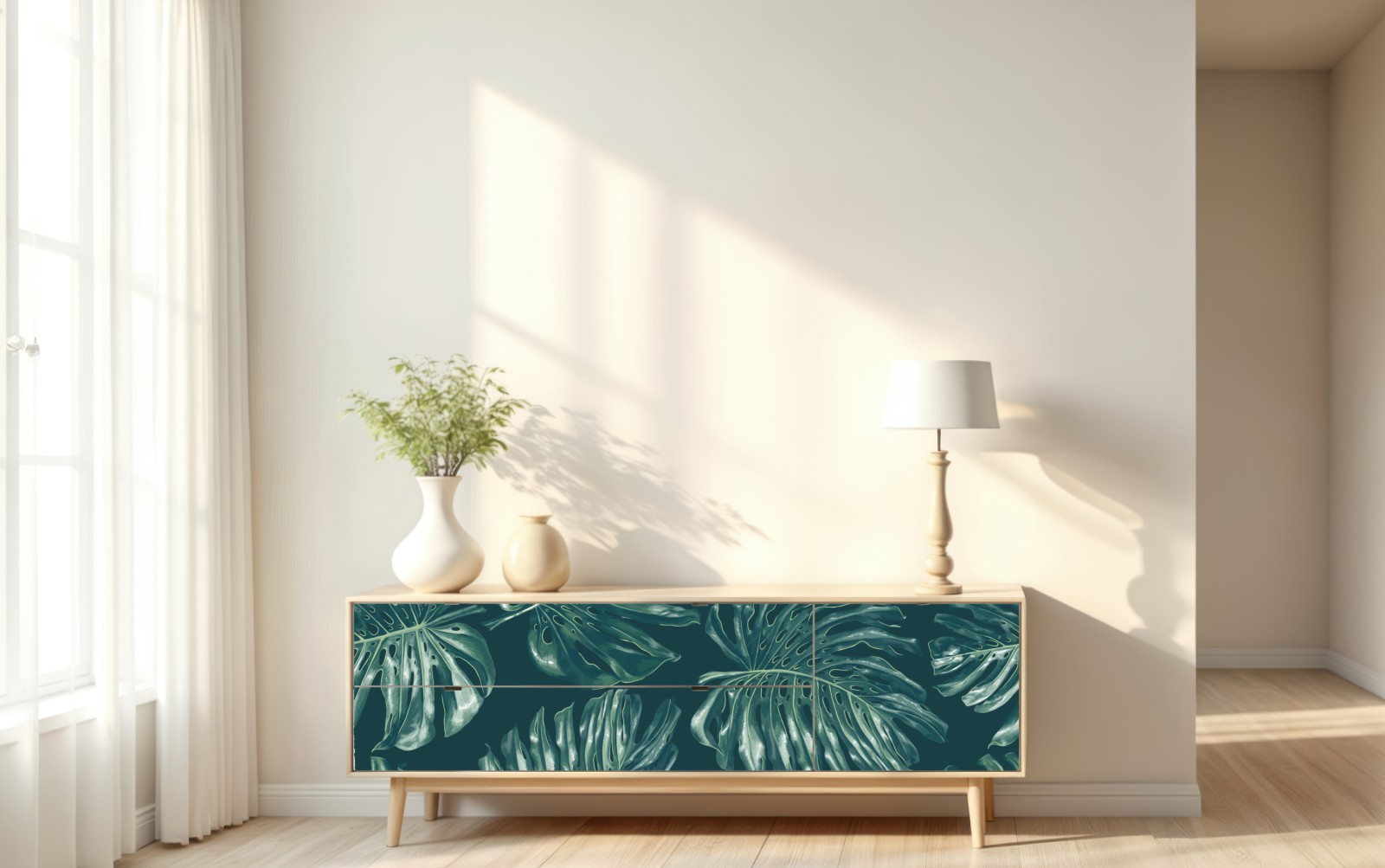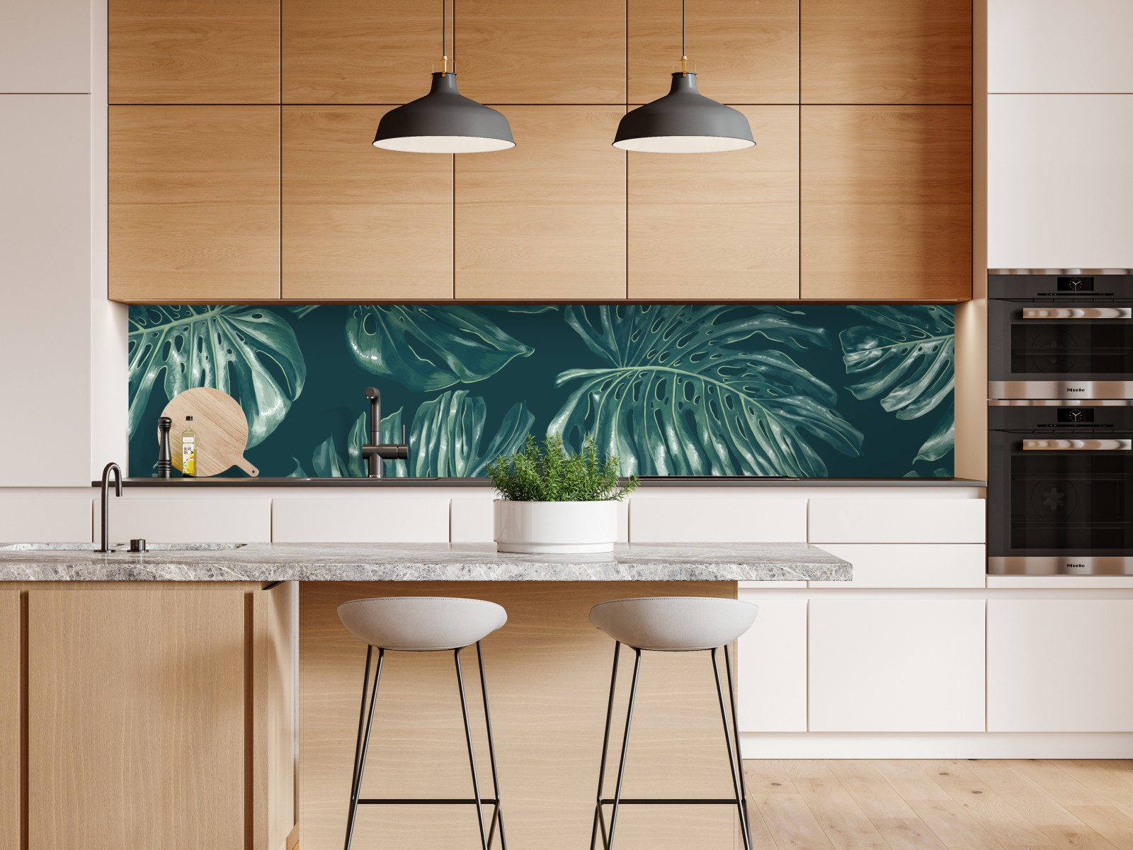 Üppige tropische Monstera-Blätter in einem handgemalten Aquarellmuster bringen beruhigendes Grün und natürliche Atmosphäre in jeden Raum.