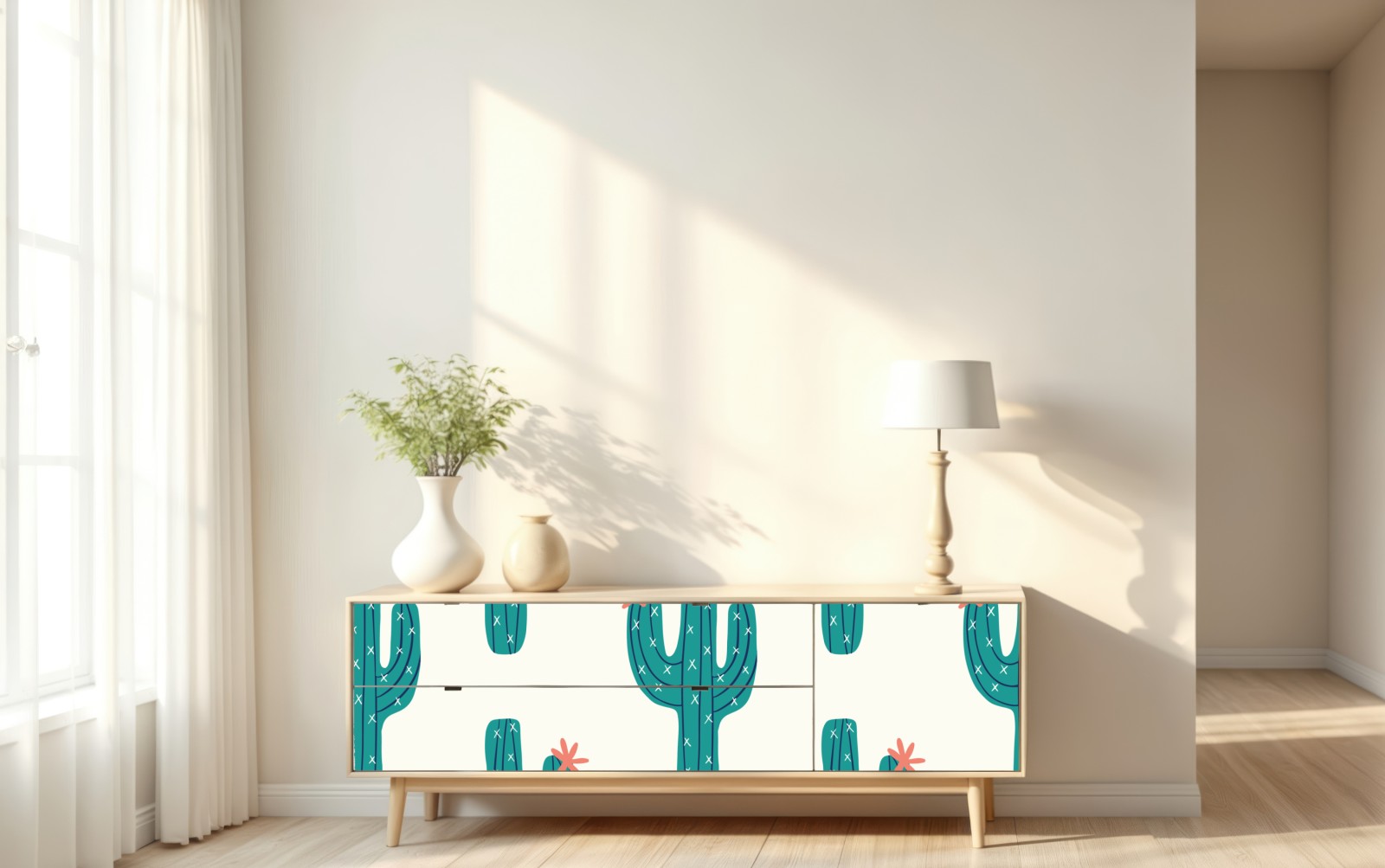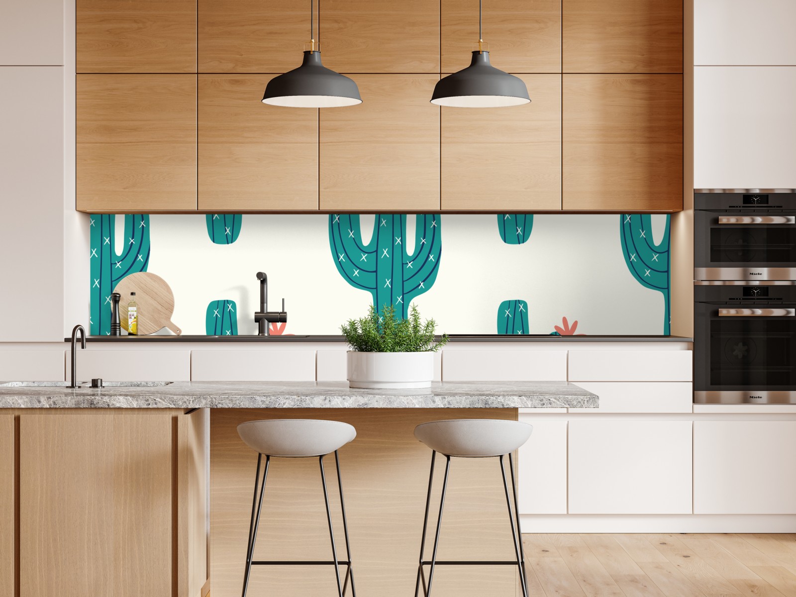fröhliches wiederholendes kaktusmuster in türkis mit korallenakzenten auf cremigem hintergrund, ideal um jedem raum einen boho-touch zu verleihen.