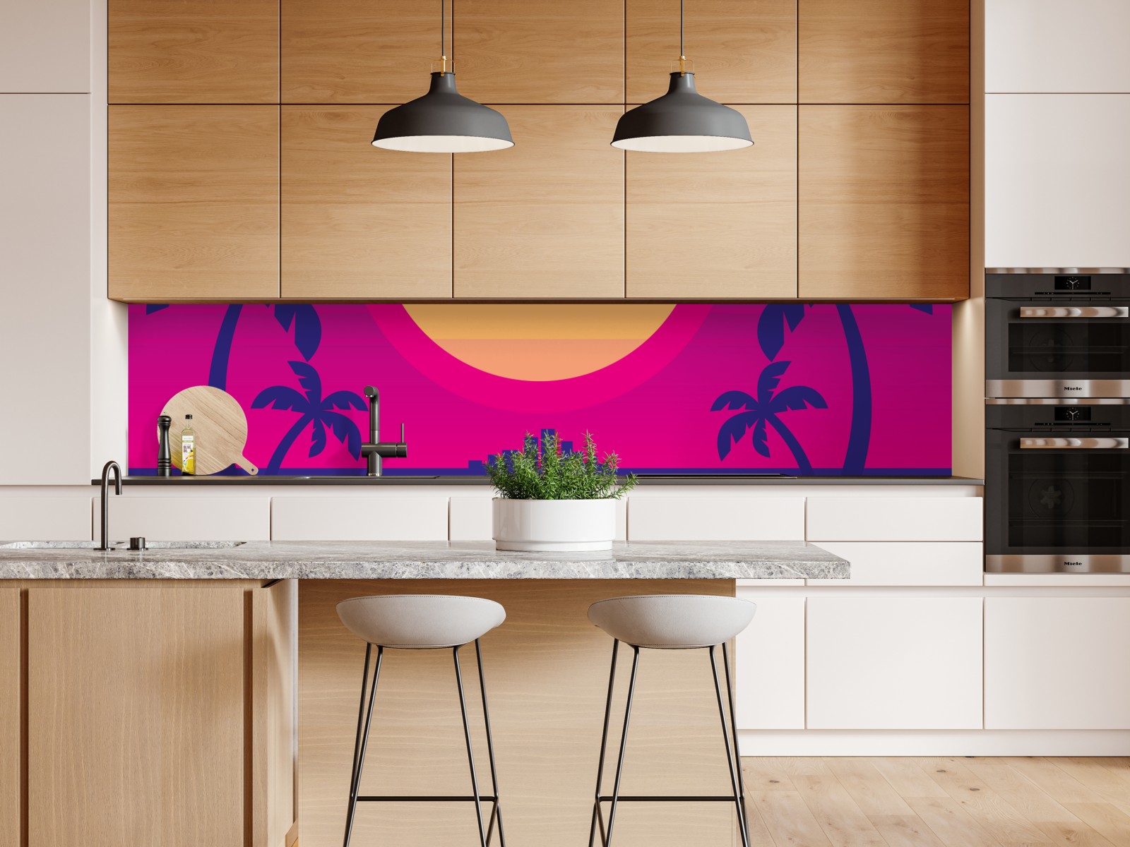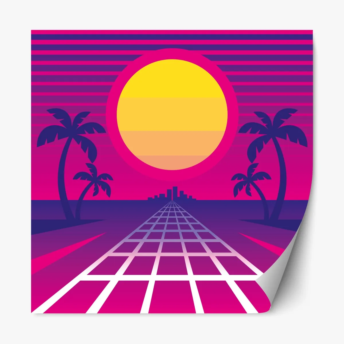 leuchtender retro-futuristischer sonnenuntergang mit neonfarben, palmensilhouetten und einem raster, das zu einer fernen stadtsilhouette führt — perfekt, um jedem raum einen 80er-synthwave-charme zu verleihen.