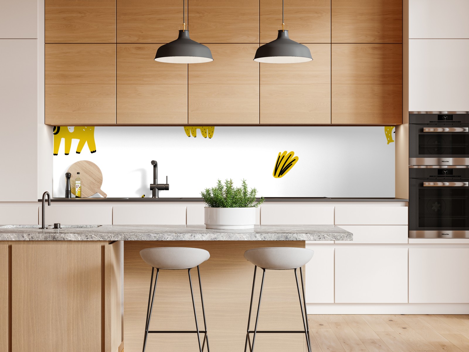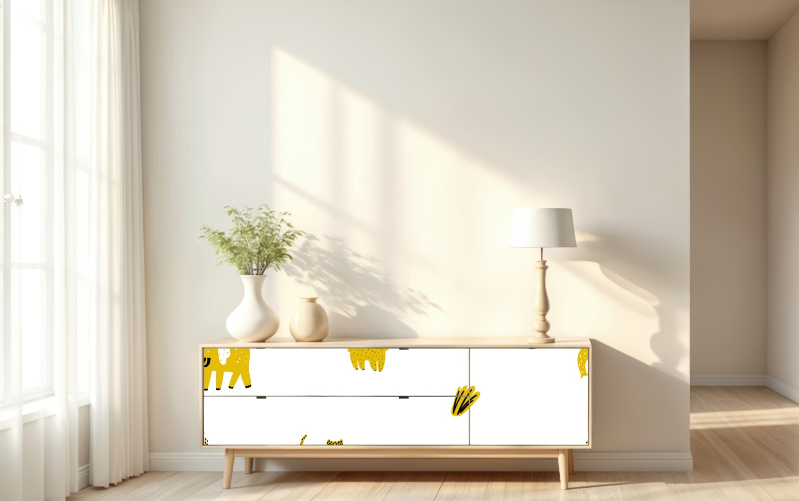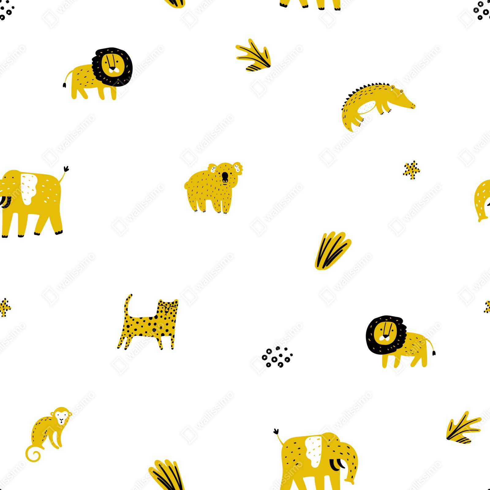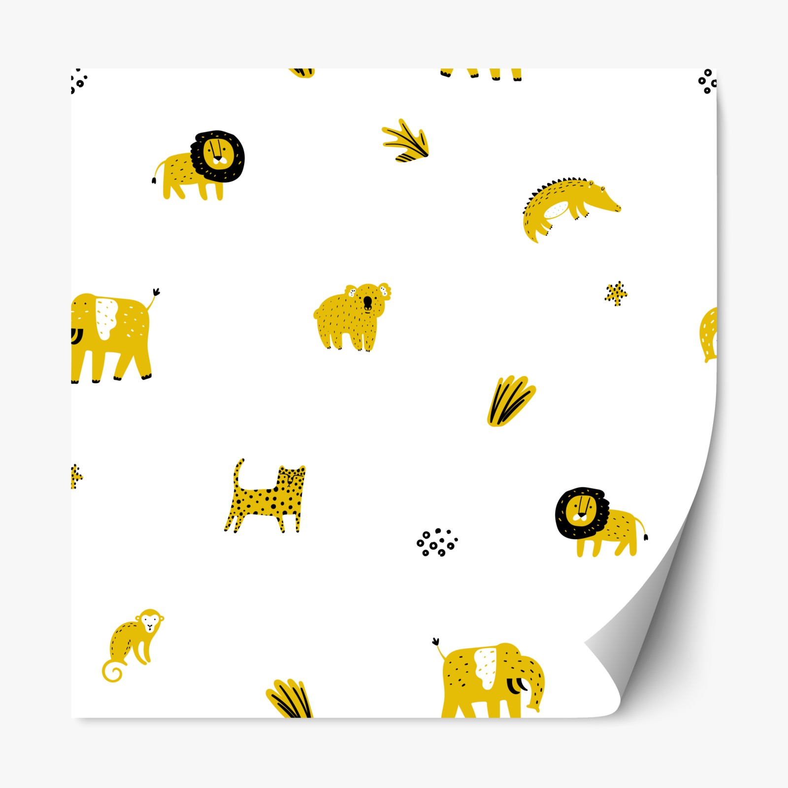 Charmante, handgezeichnete Safari-Tiere in warmem Gelb auf klarem Weiß bringen verspielte Energie in jedes Kinderzimmer.