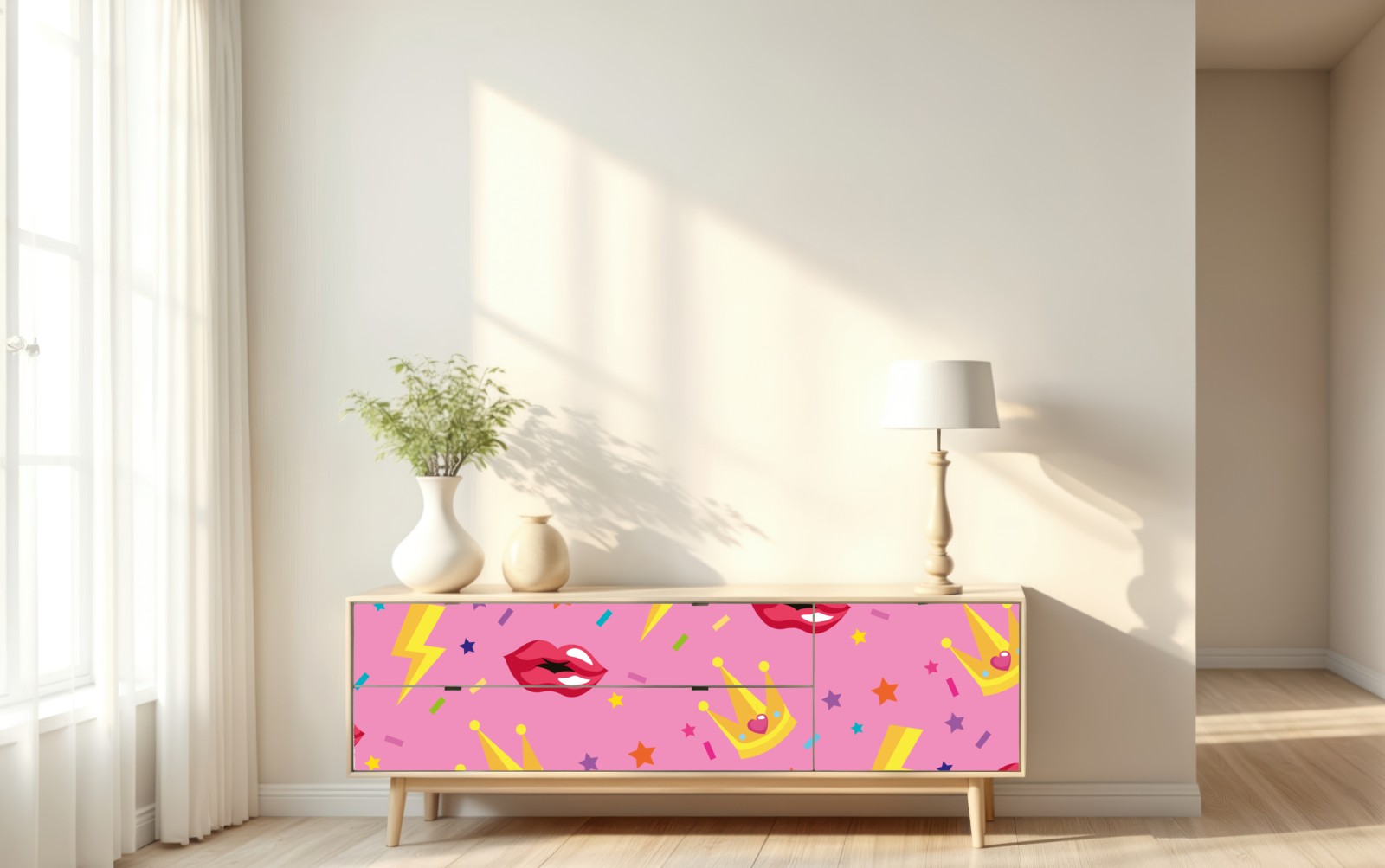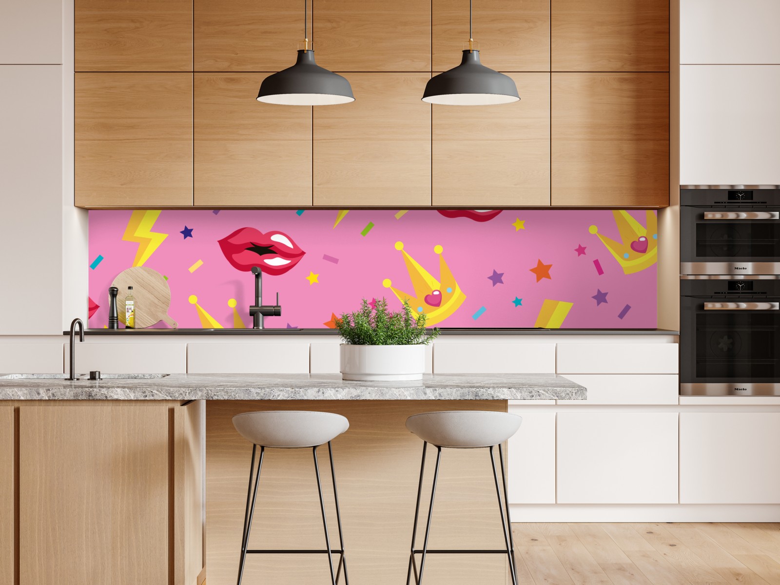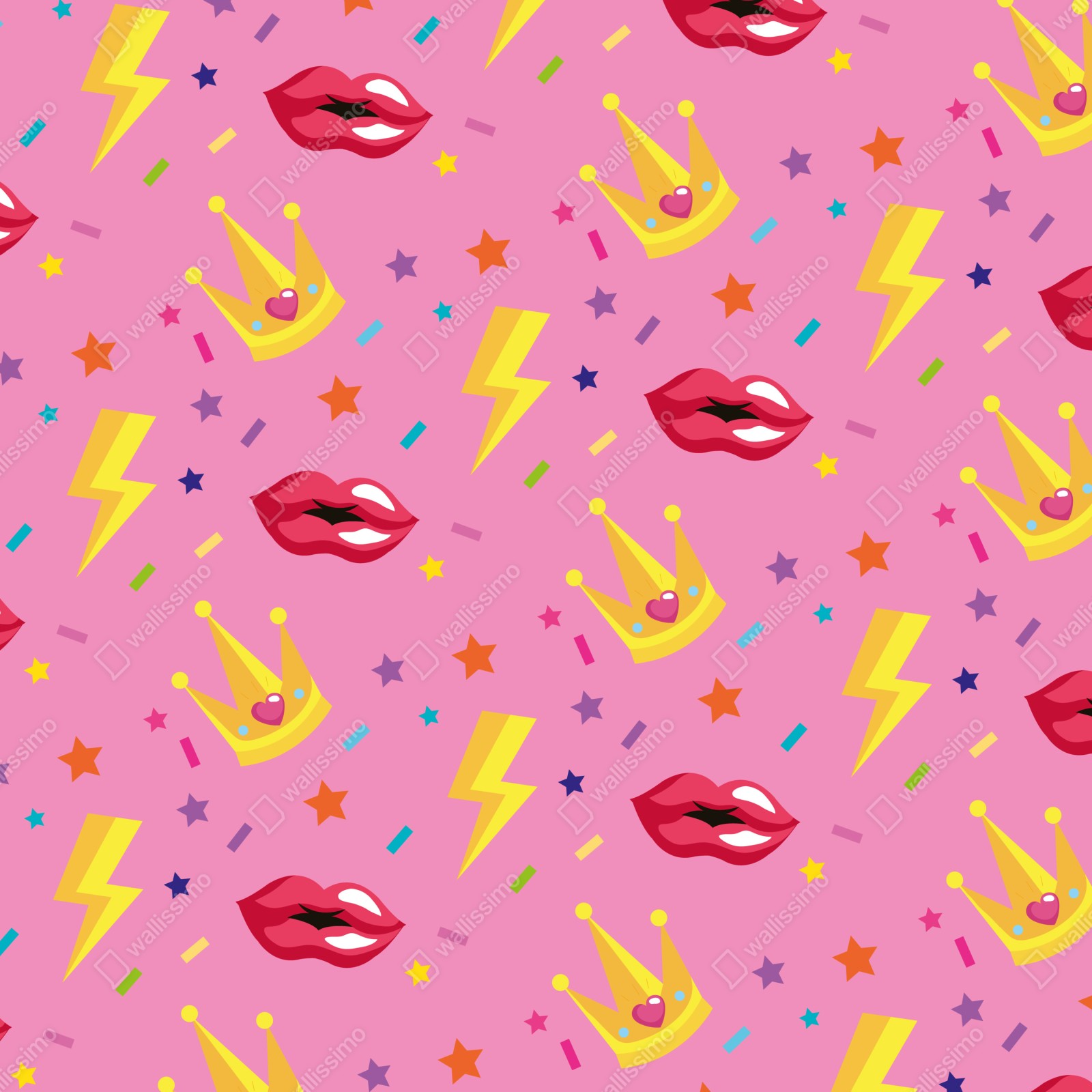 Lebendiges und verspieltes Muster mit Kronen, Lippen und Blitzsymbolen, ideal für Kinderzimmer und bunte Innenräume.