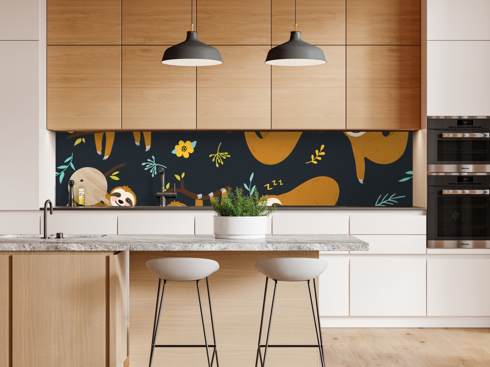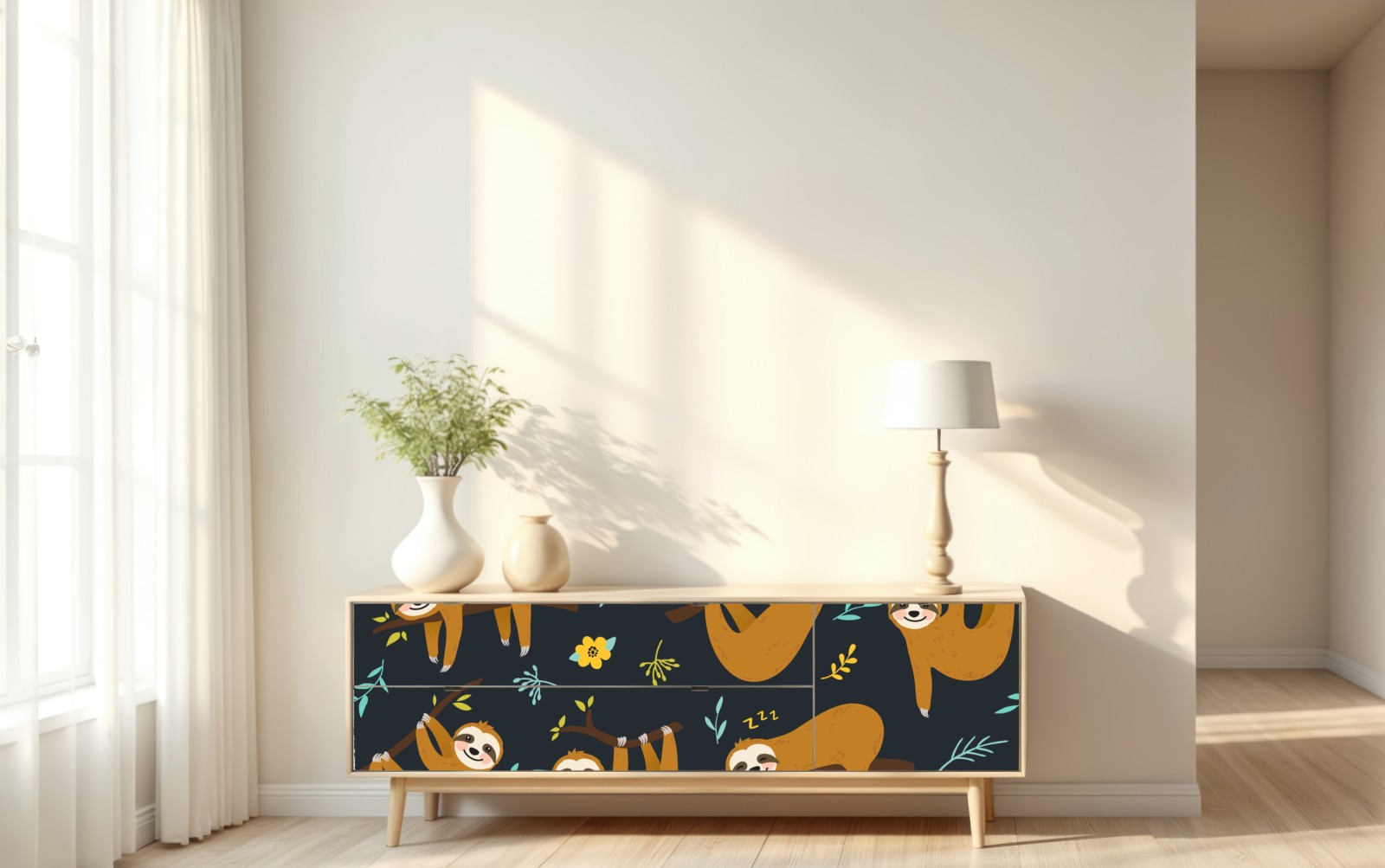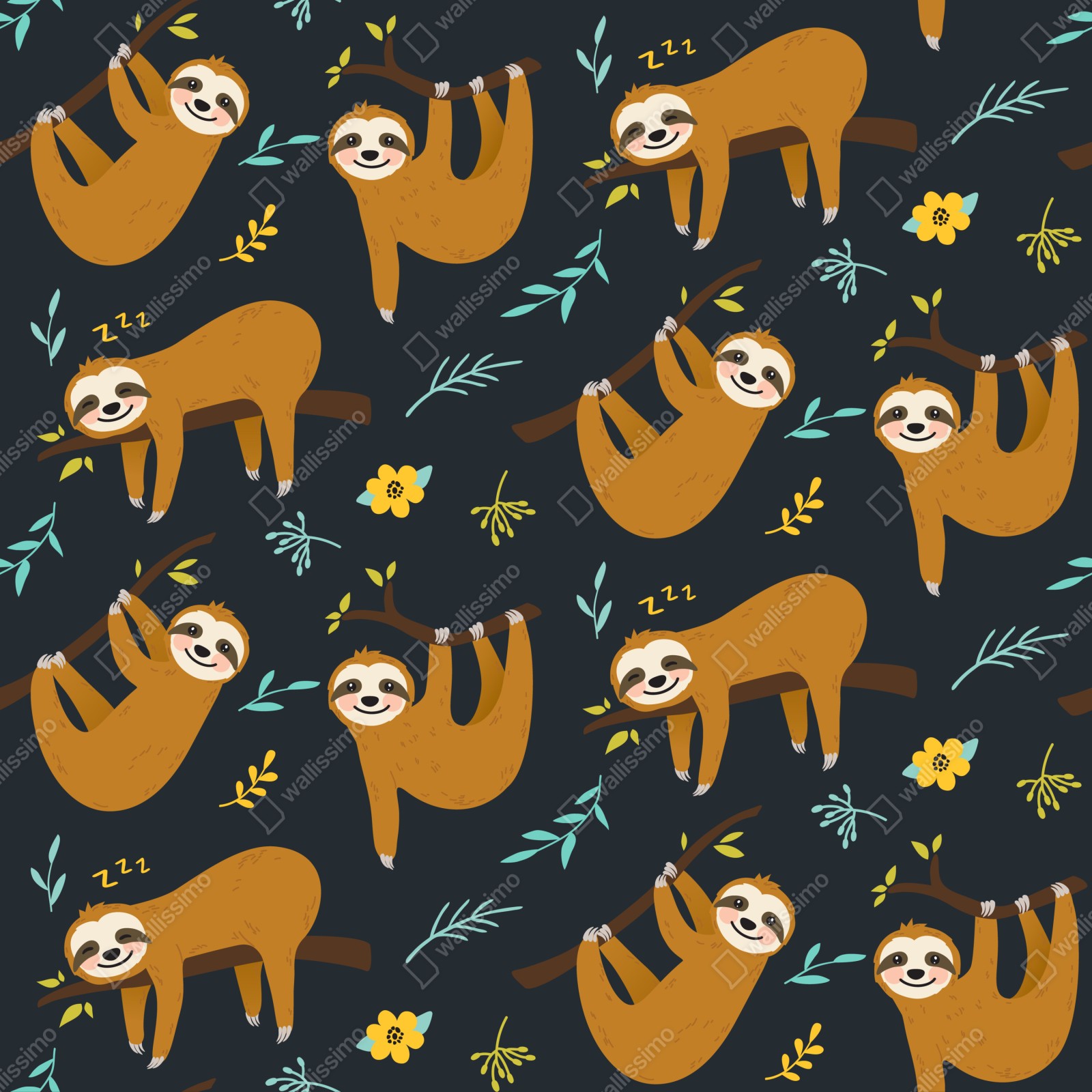 Charmante wiederholende Faultier-Illustration schafft eine verspielte und gemütliche Atmosphäre im Kinderzimmer.