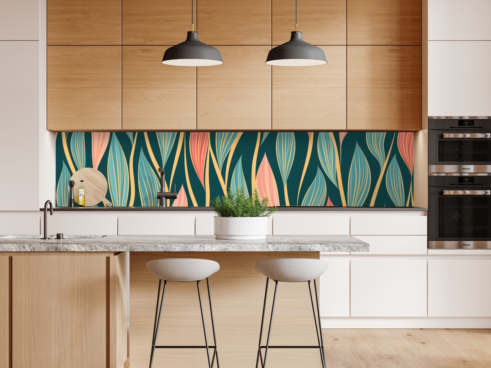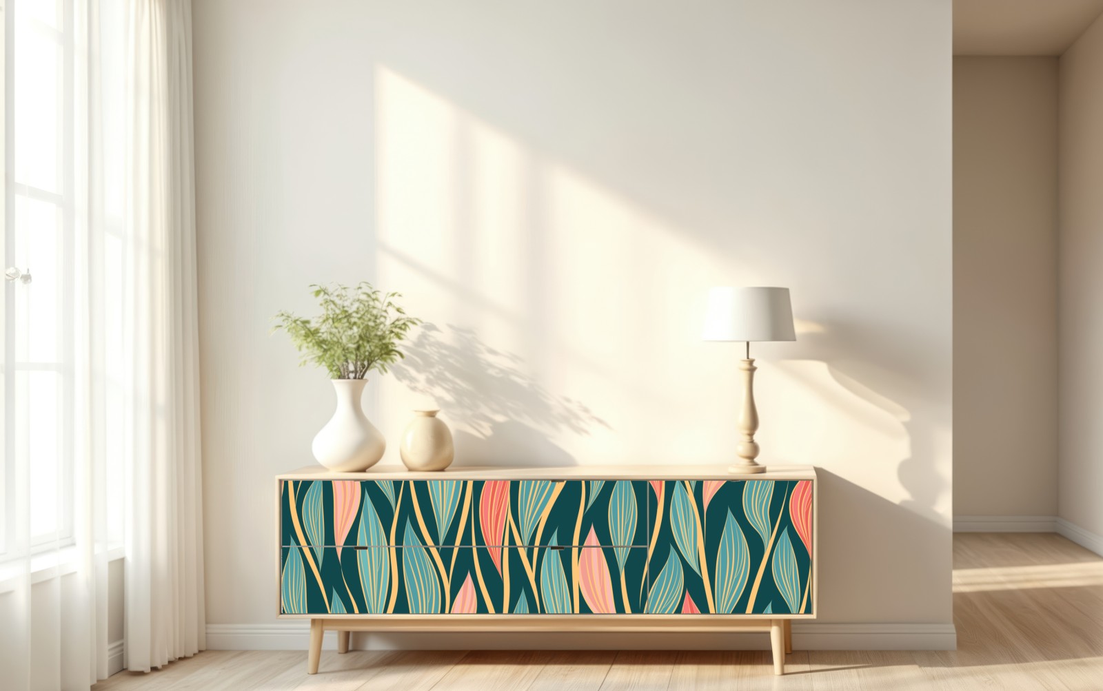 lebendiges botanisches muster mit fließenden blättern in türkis-, korallen- und goldtönen verleiht jedem raum einen modernen boho-touch.