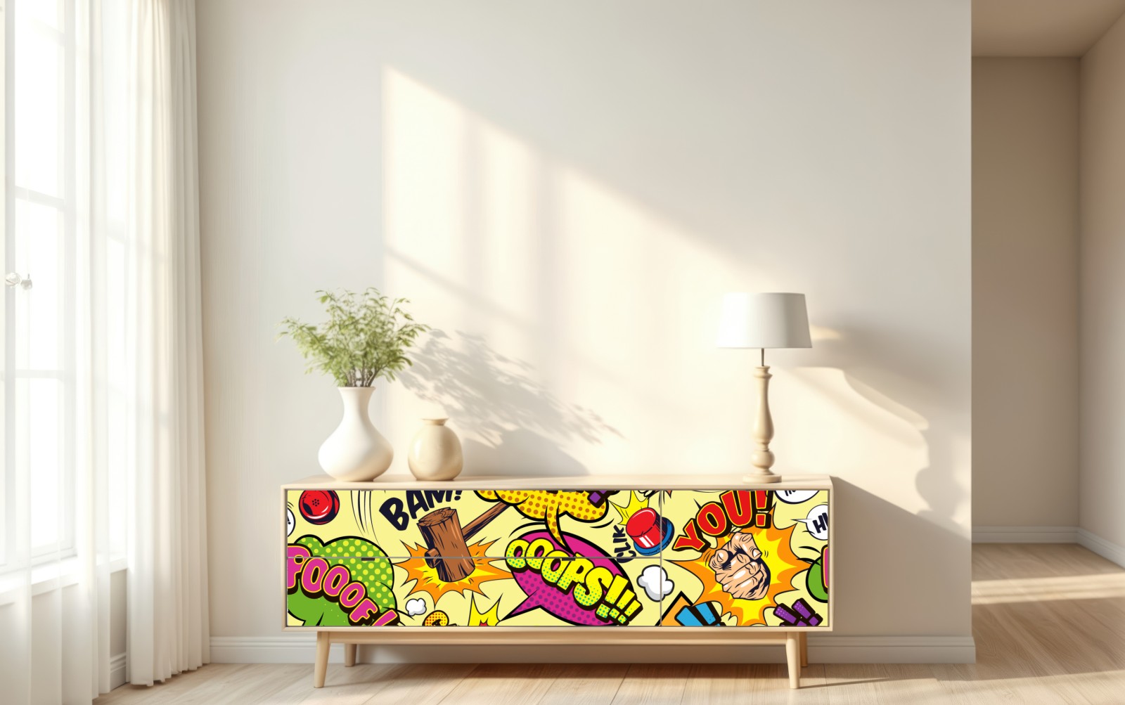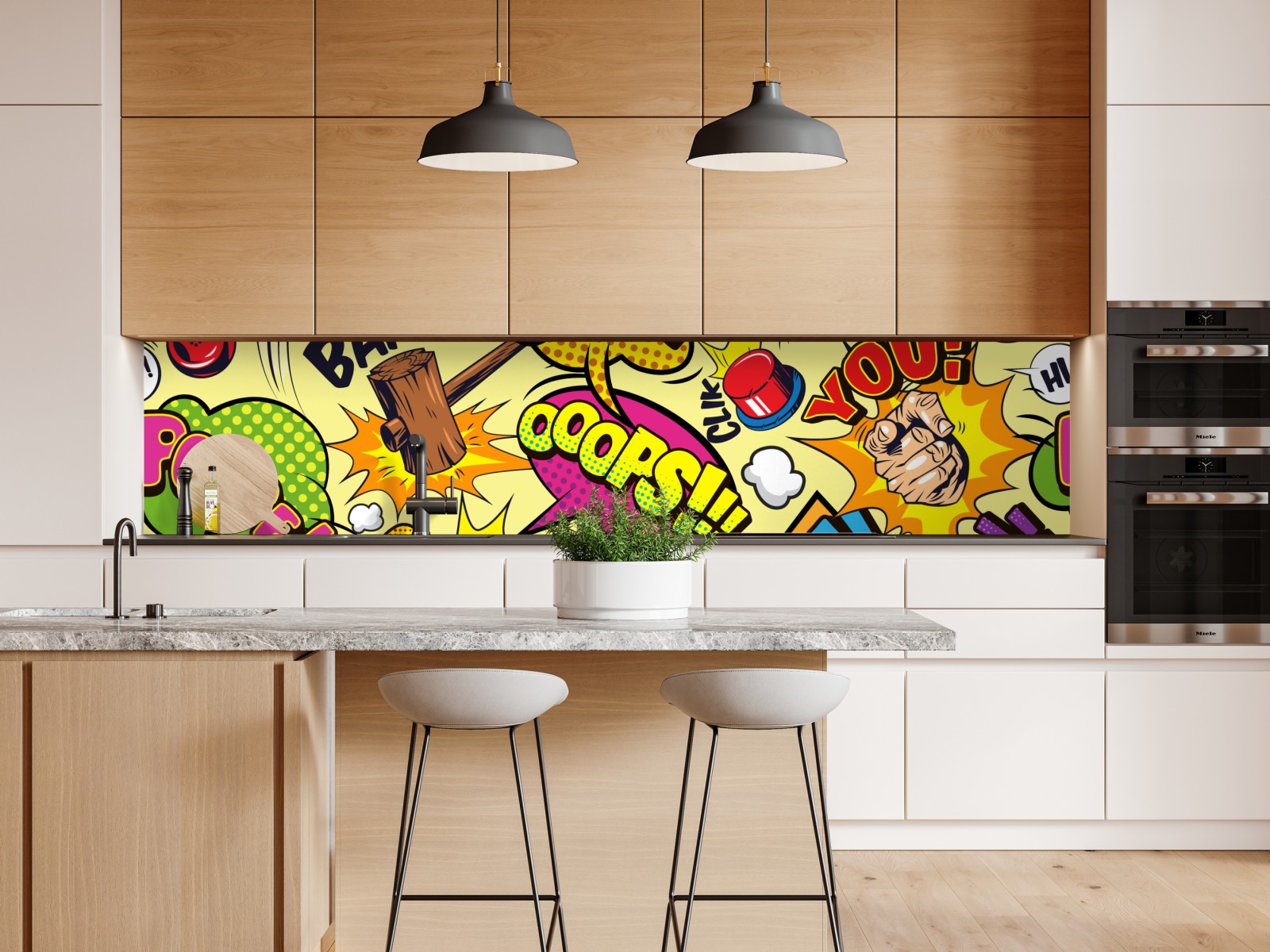 eine lebendige pop-art comic-collage voller energetischer sprechblasen und bunter lautmalereien, die jedem raum spielerische energie verleiht.
