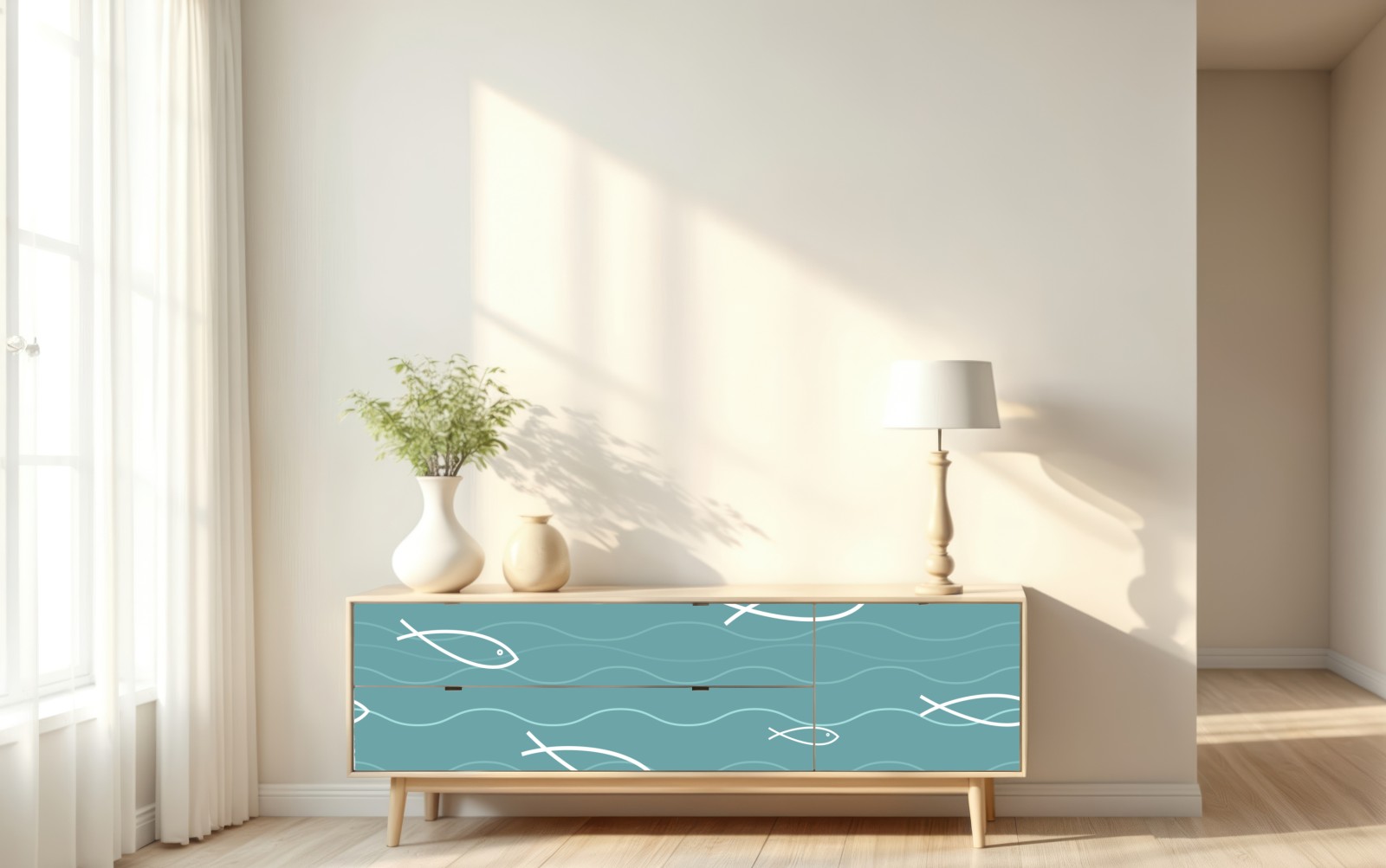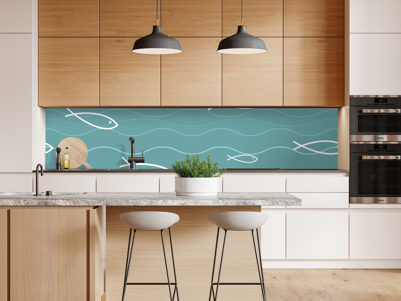 Beruhigendes, maritimes Fischmuster in sanften türkistönen, ideal für Badezimmer oder Kinderzimmer; verleiht jeder Wand einen minimalistischen, ozeanischen Touch.