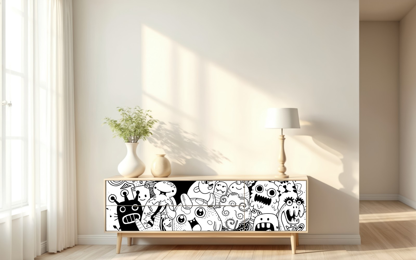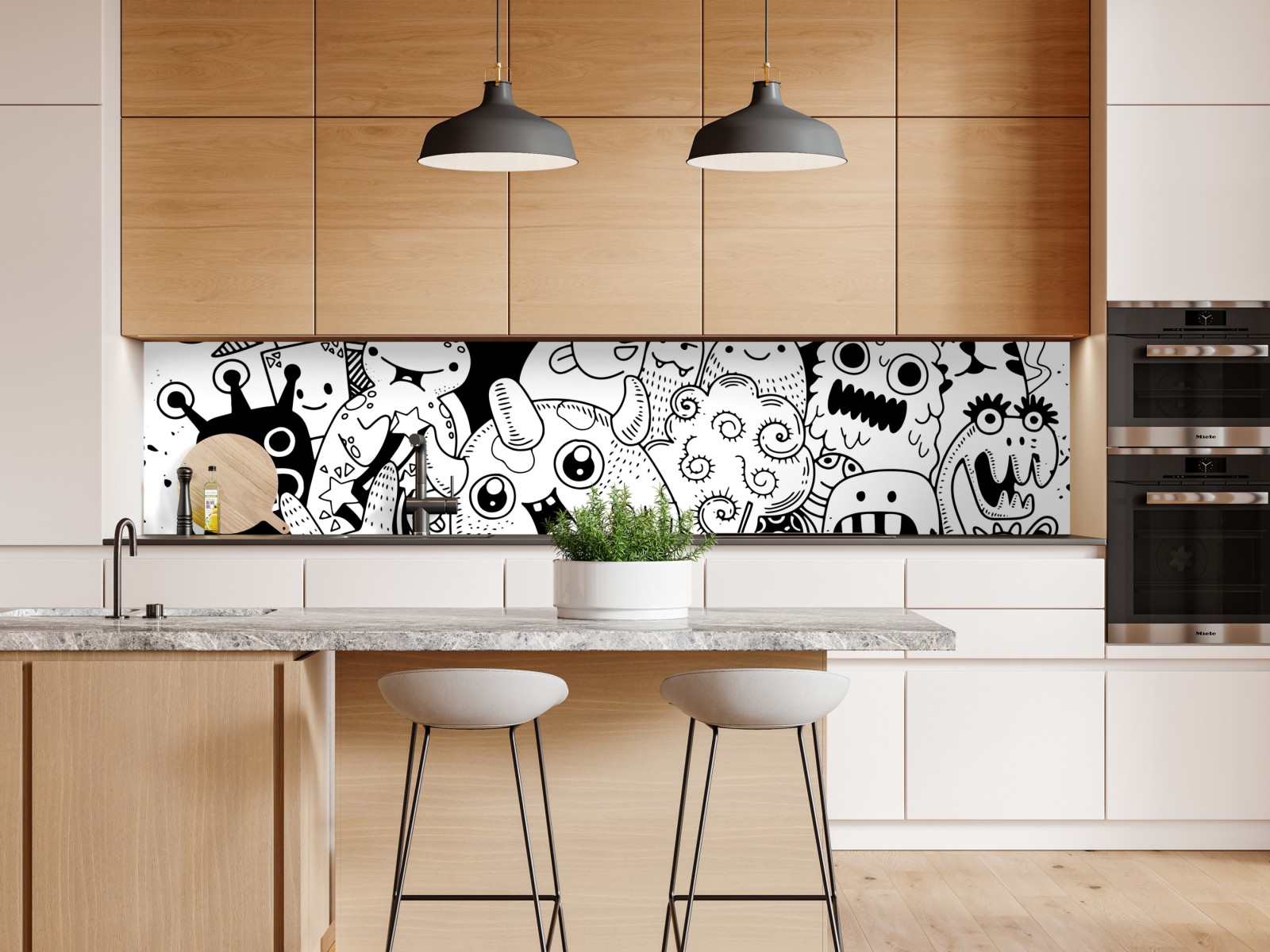 Lebhafte schwarz-weiße Kritzelei voller verspielter Monster und detailreicher Elemente, die jedes Kinderzimmer oder kreative Umfeld beleben.