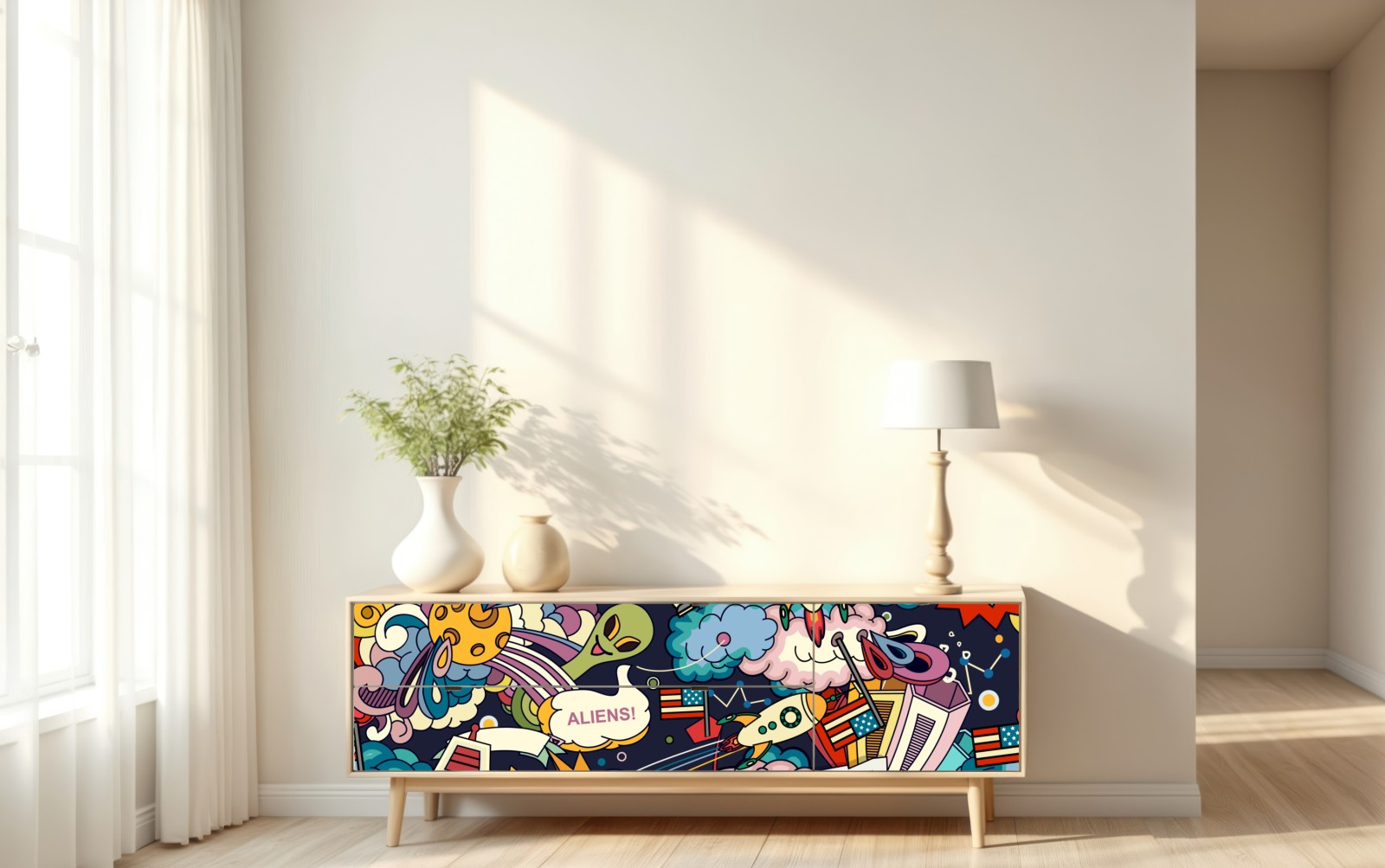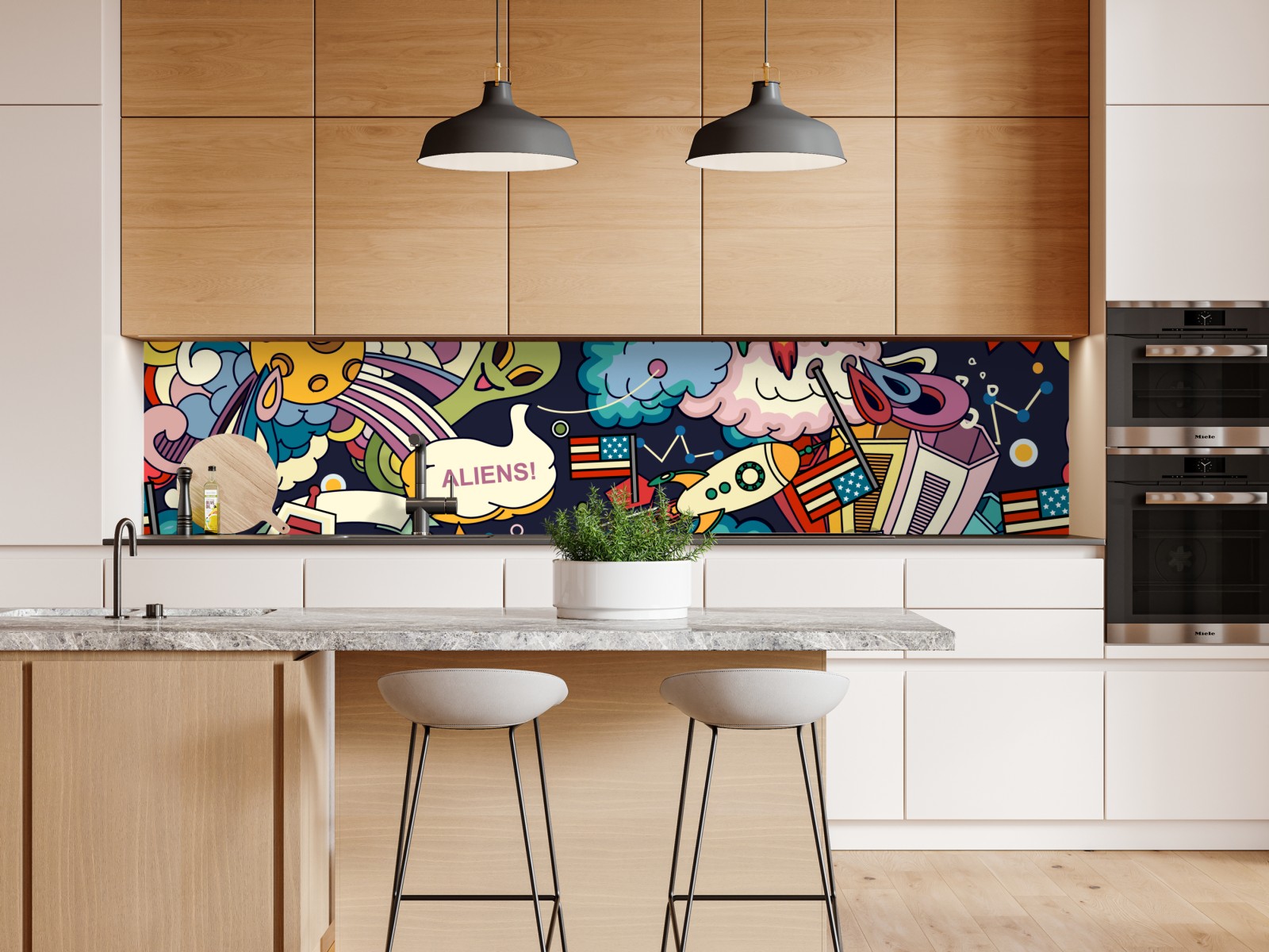 Bunte und verspielte Weltraumillustration mit Raketen, Astronauten und Planeten, die jedem Raum kosmische Energie verleiht.