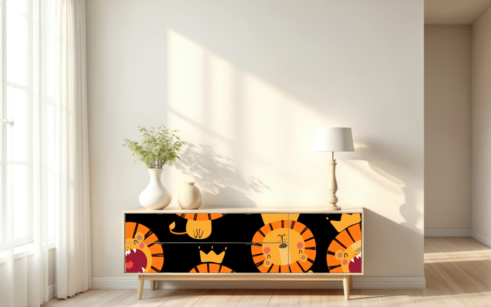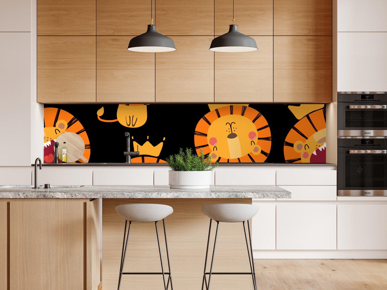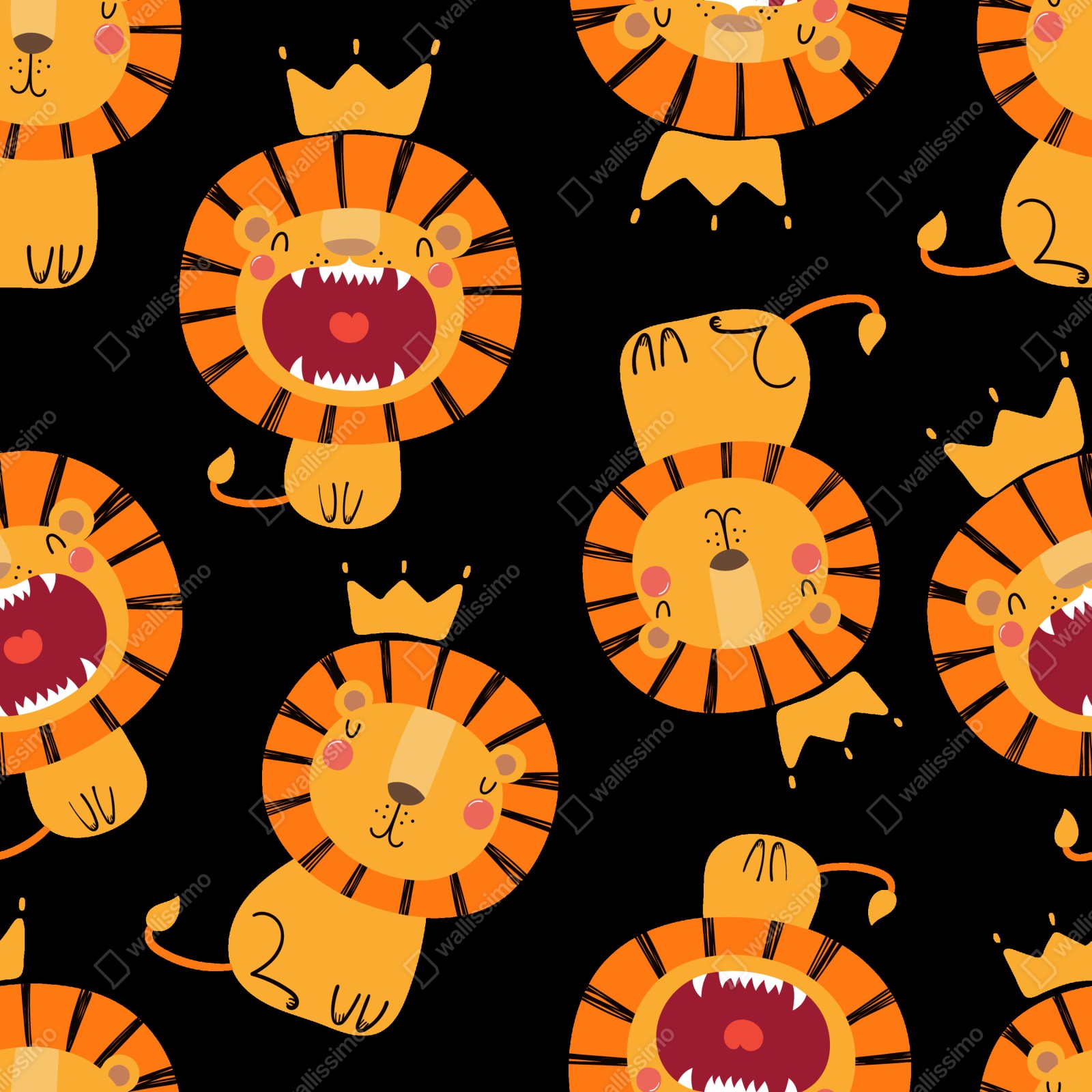 Bunte und verspielte Löwenillustration mit Kronen auf schwarzem Hintergrund, ideal um Kinderzimmer oder Krippen fröhlich zu gestalten.