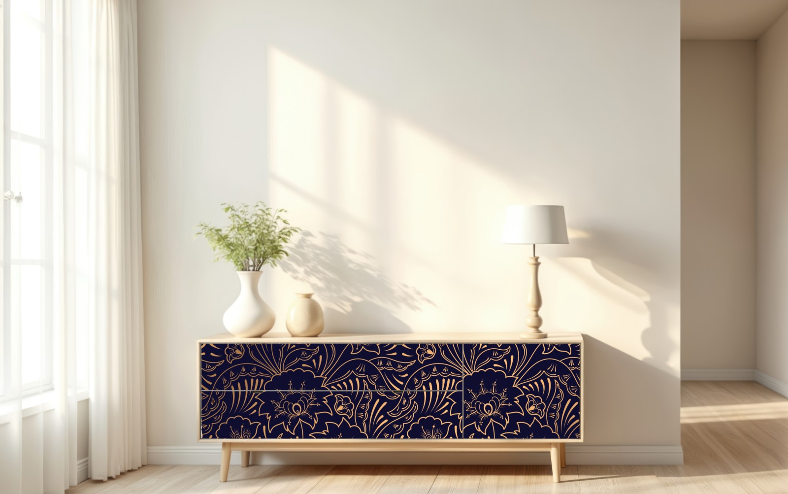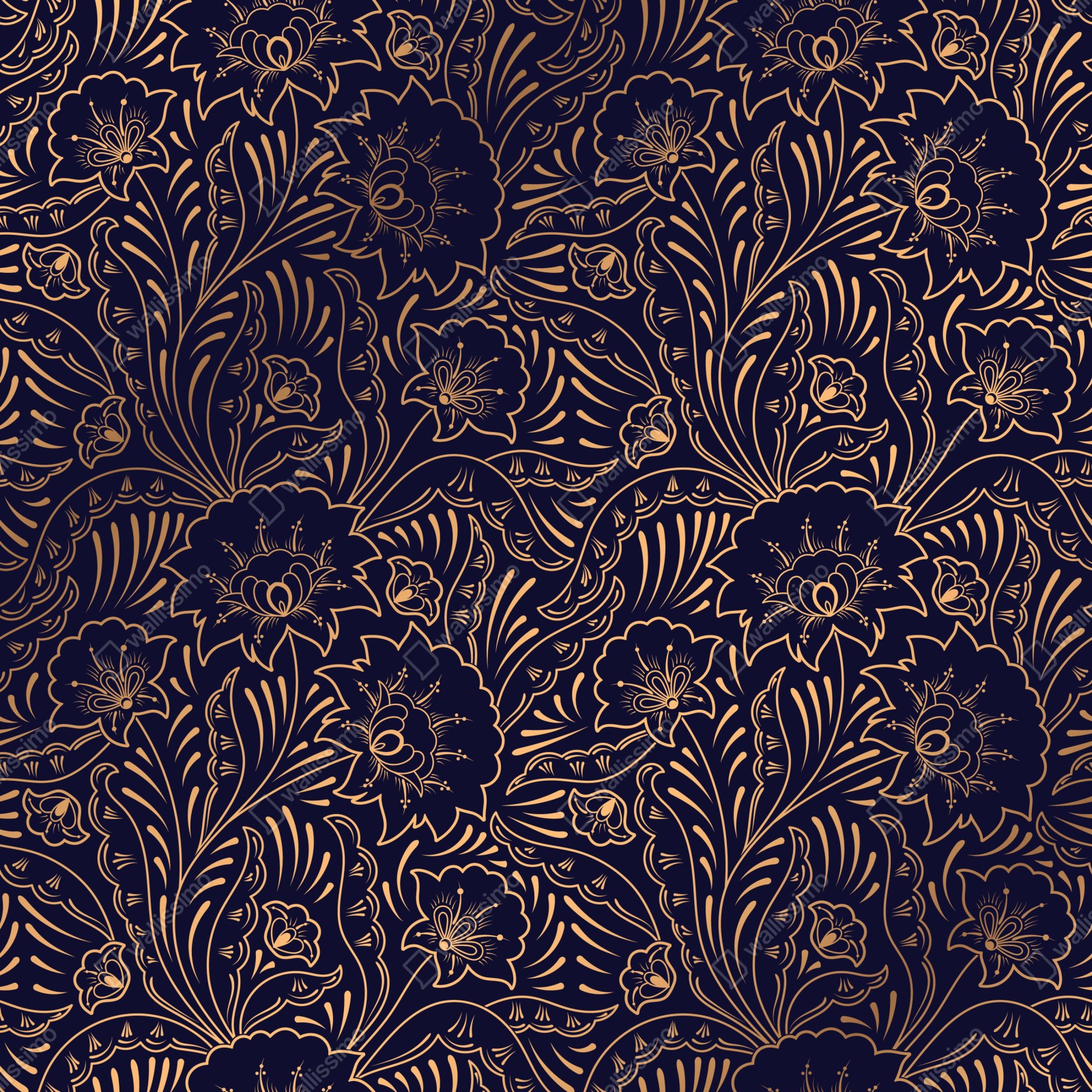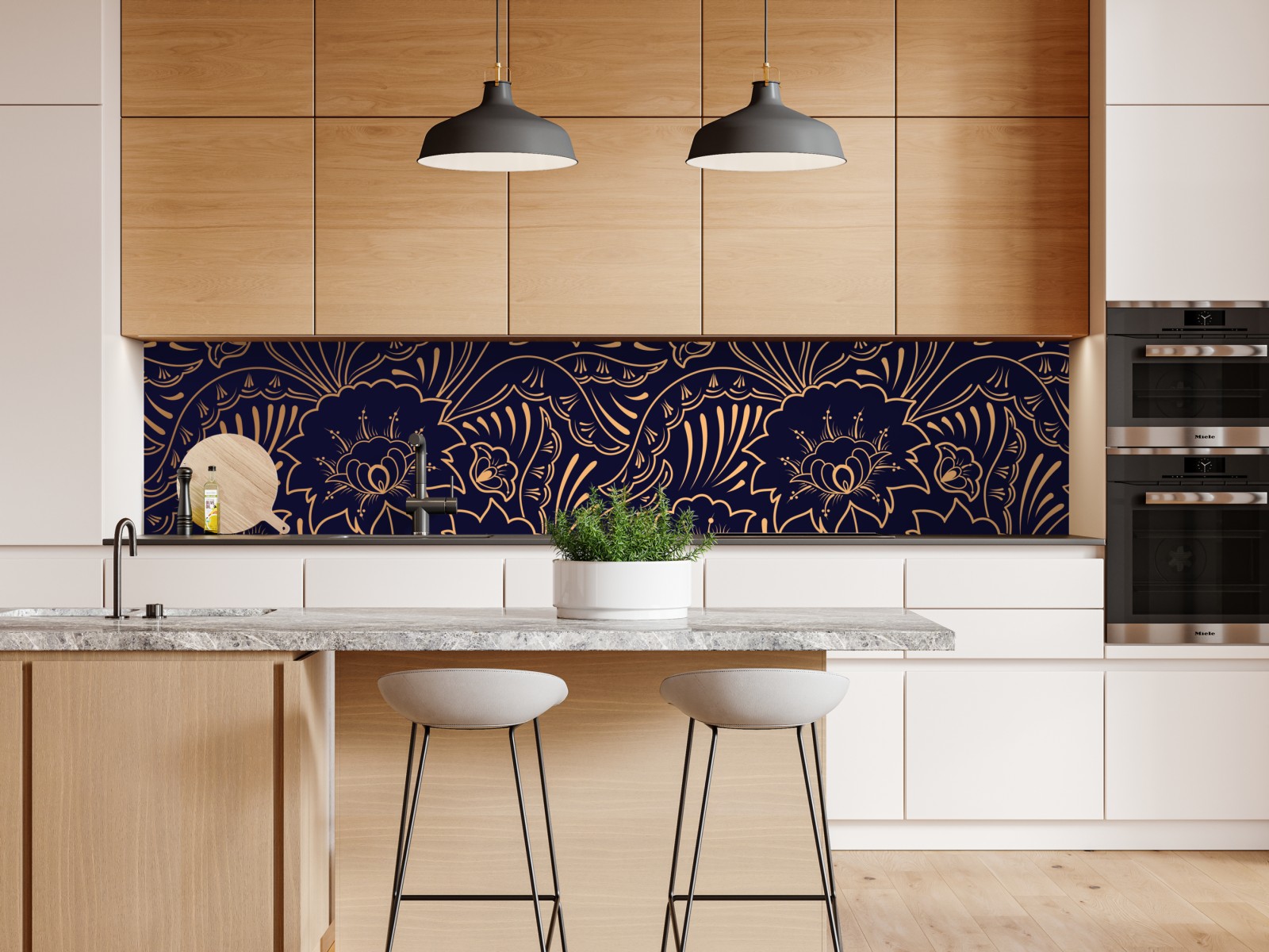 Elegantes goldenes Blumenornament auf einem tiefen nachtblauen Hintergrund verleiht jedem Raum Luxus und Raffinesse.