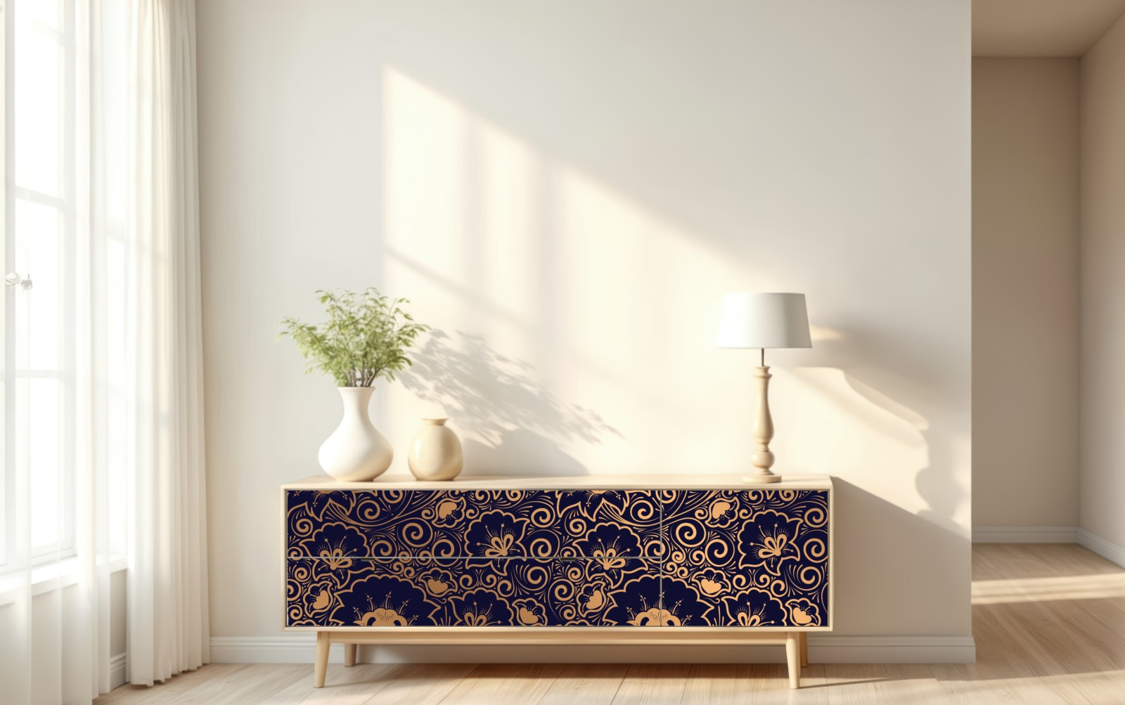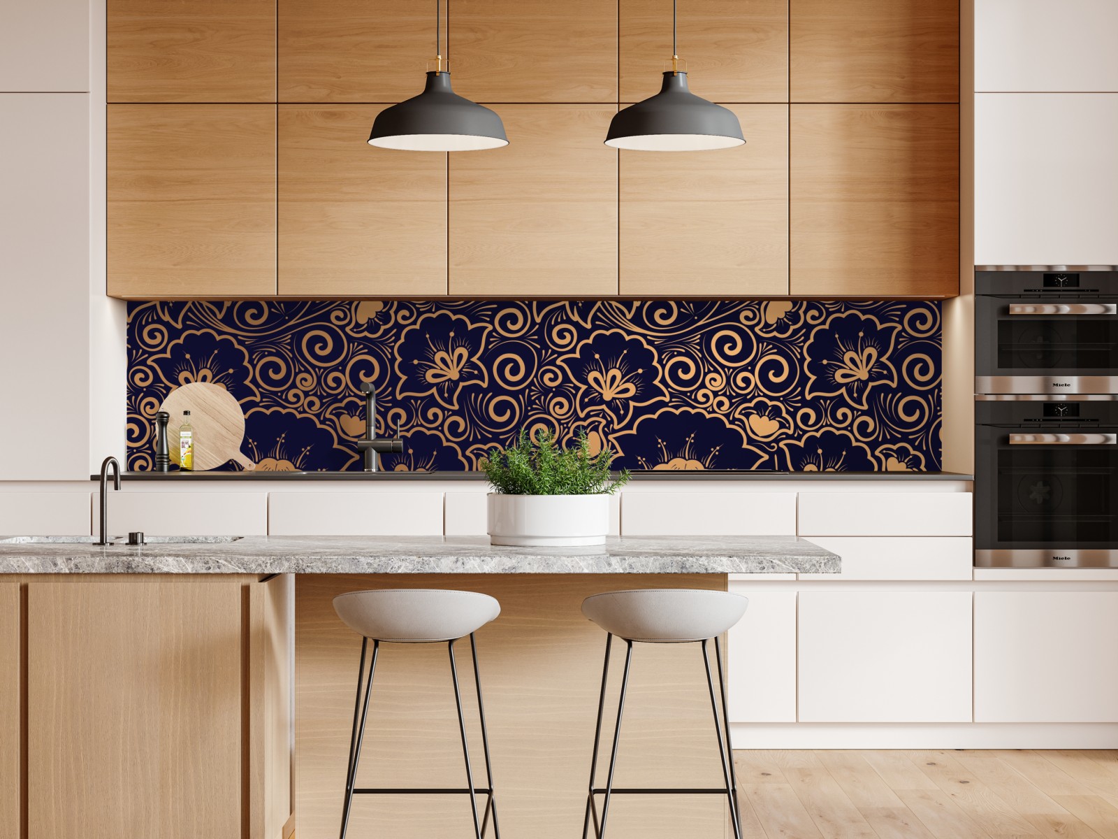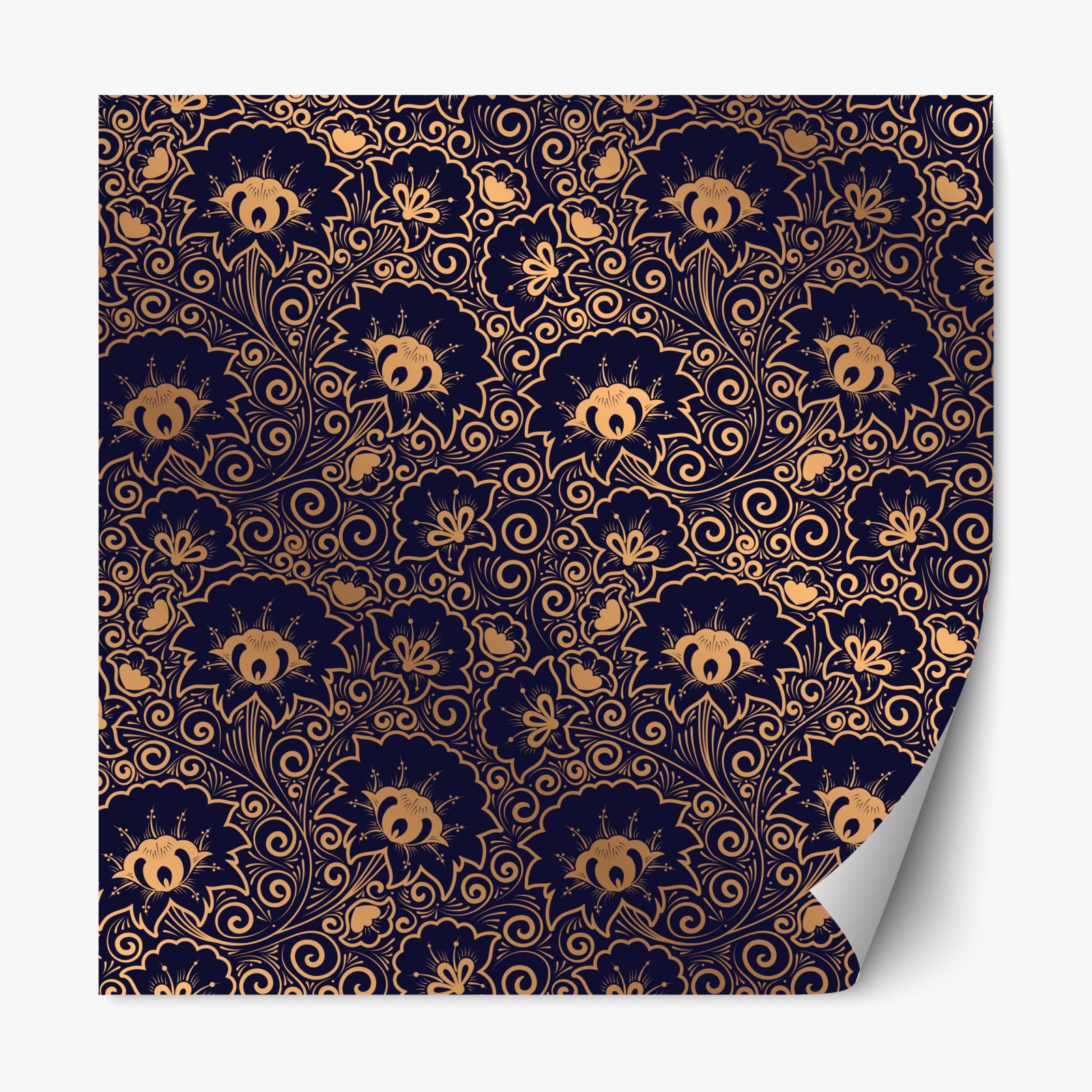 Elegantes goldenes Blumenmuster auf tiefem Dunkelblau verleiht Räumen einen luxuriösen, dekorativen Charakter; ideal für hochwertige Einrichtung und Textilien.