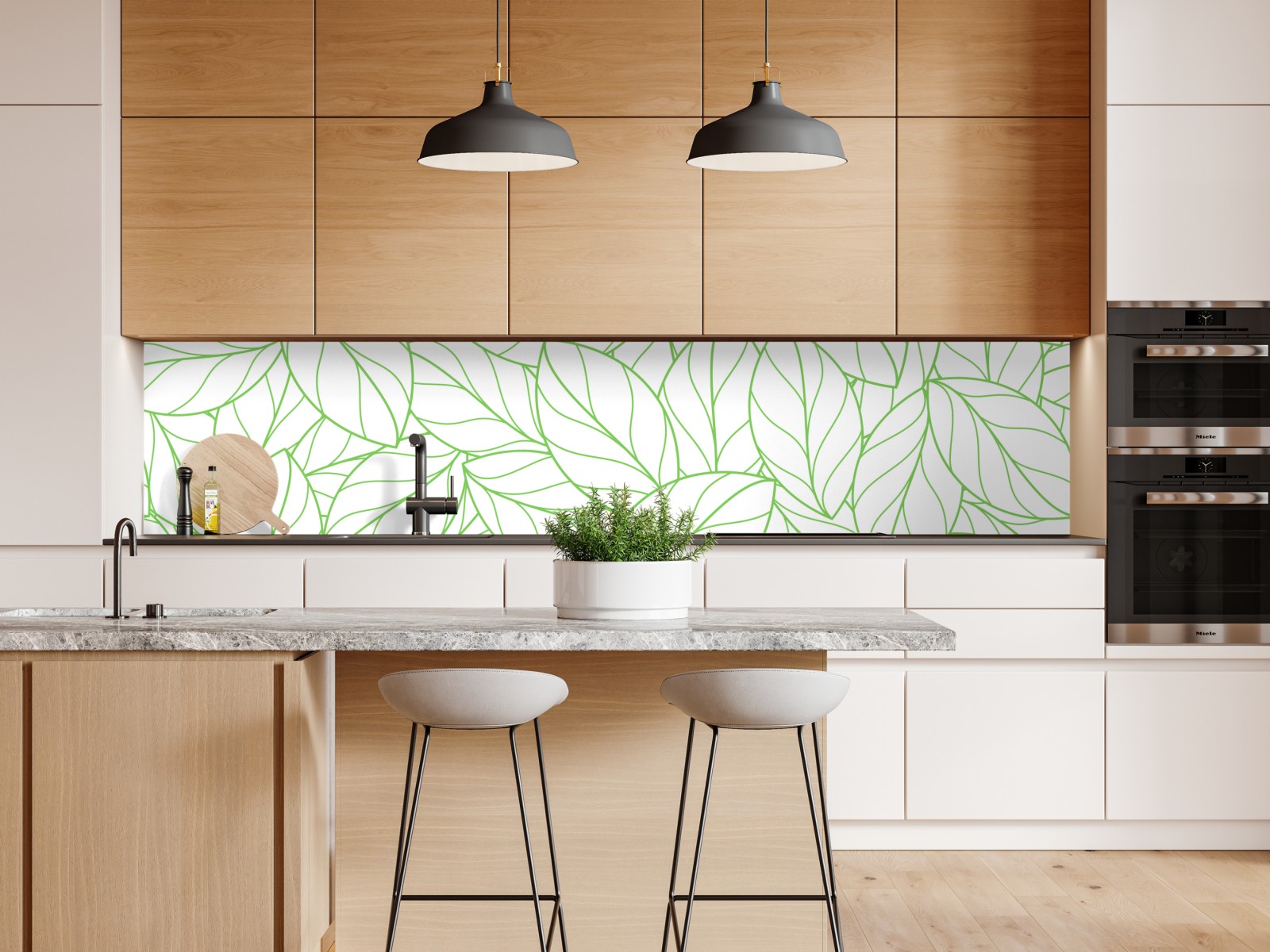 Ein zartes grünes Blattlinienmuster auf weißem Hintergrund verleiht dem Raum eine frische, beruhigende botanische Atmosphäre.