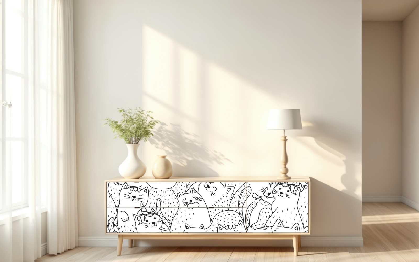 Verspieltes schwarz-weißes Katzenmuster als nahtlose Illustration, ideal fürs Kinderzimmer oder als Ausmalvorlage zur persönlichen Gestaltung.