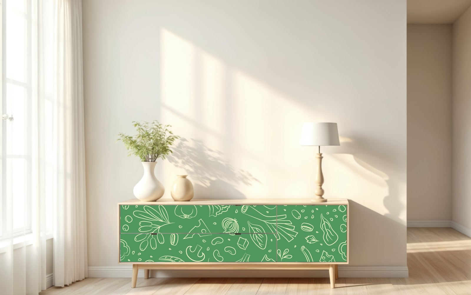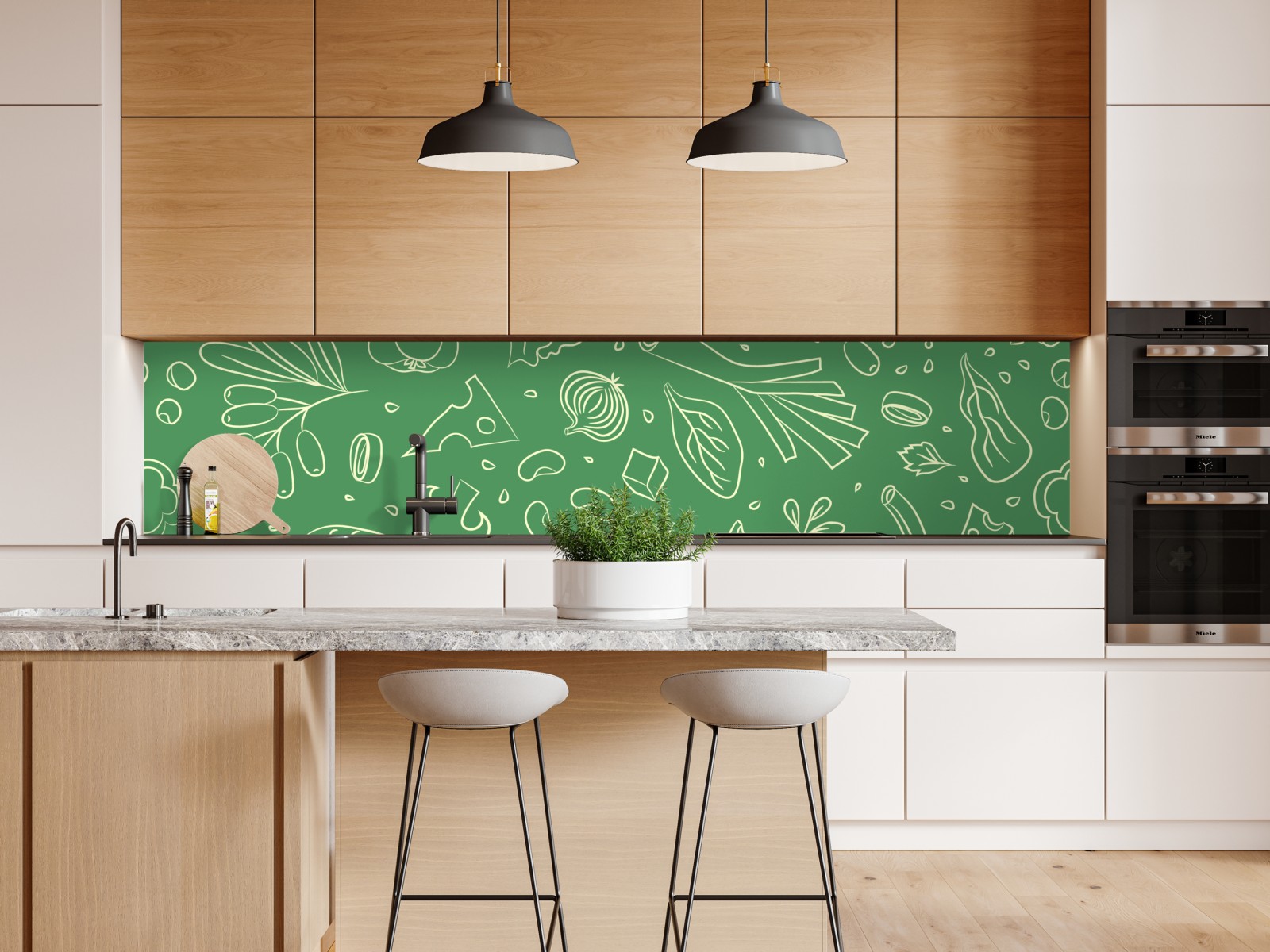 Verleihen Sie Ihrer Küche mit diesem handgezeichneten Gemüsemotiv in Grün einen frischen, minimalistischen Look, ideal für kulinarisch inspirierte Wohnräume.