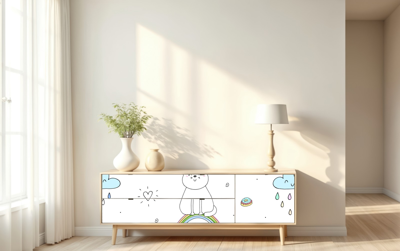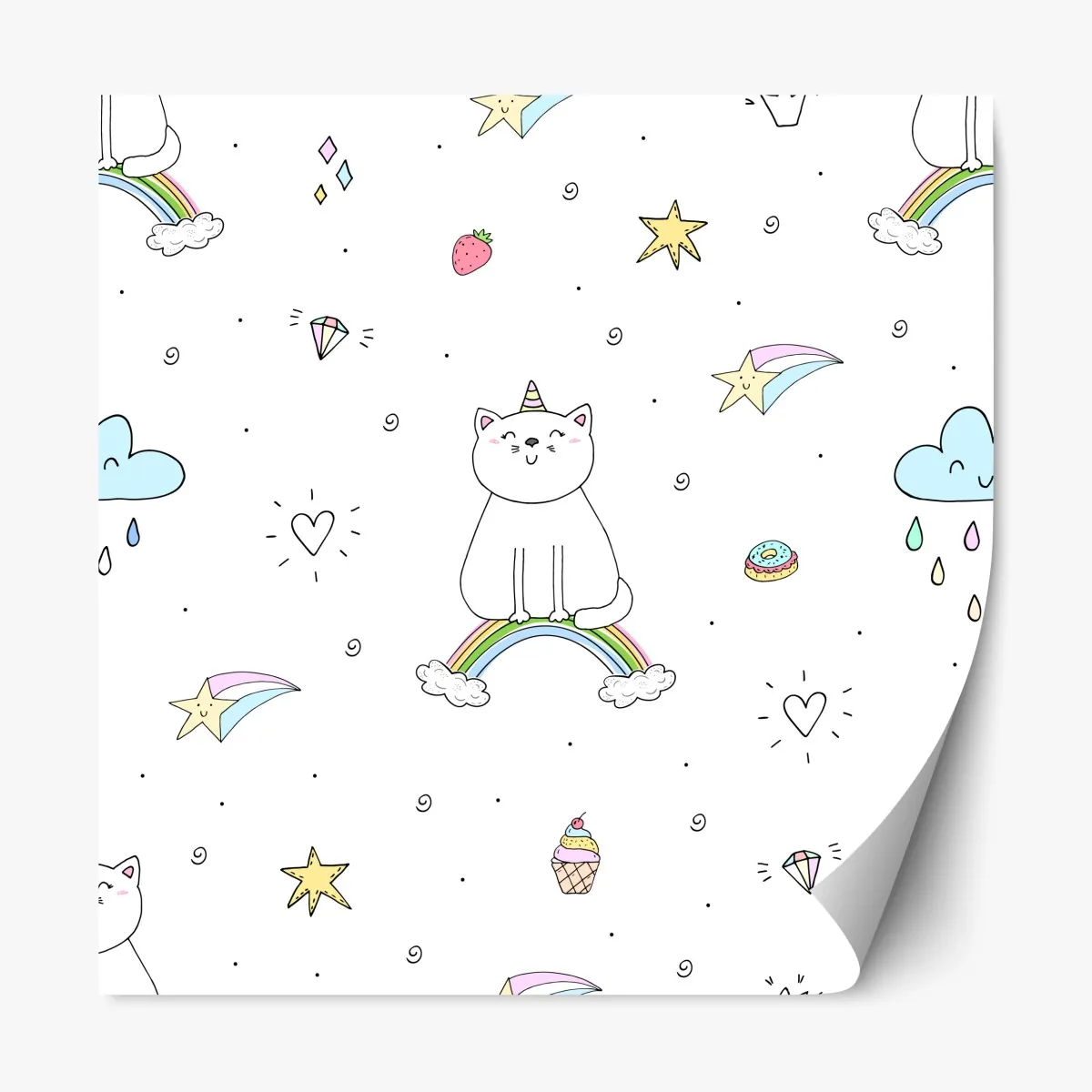 Charmante Pastellillustration mit lächelnden Einhornkatzen, Regenbögen und Süßigkeiten, die jedes Kinderzimmer aufhellt.