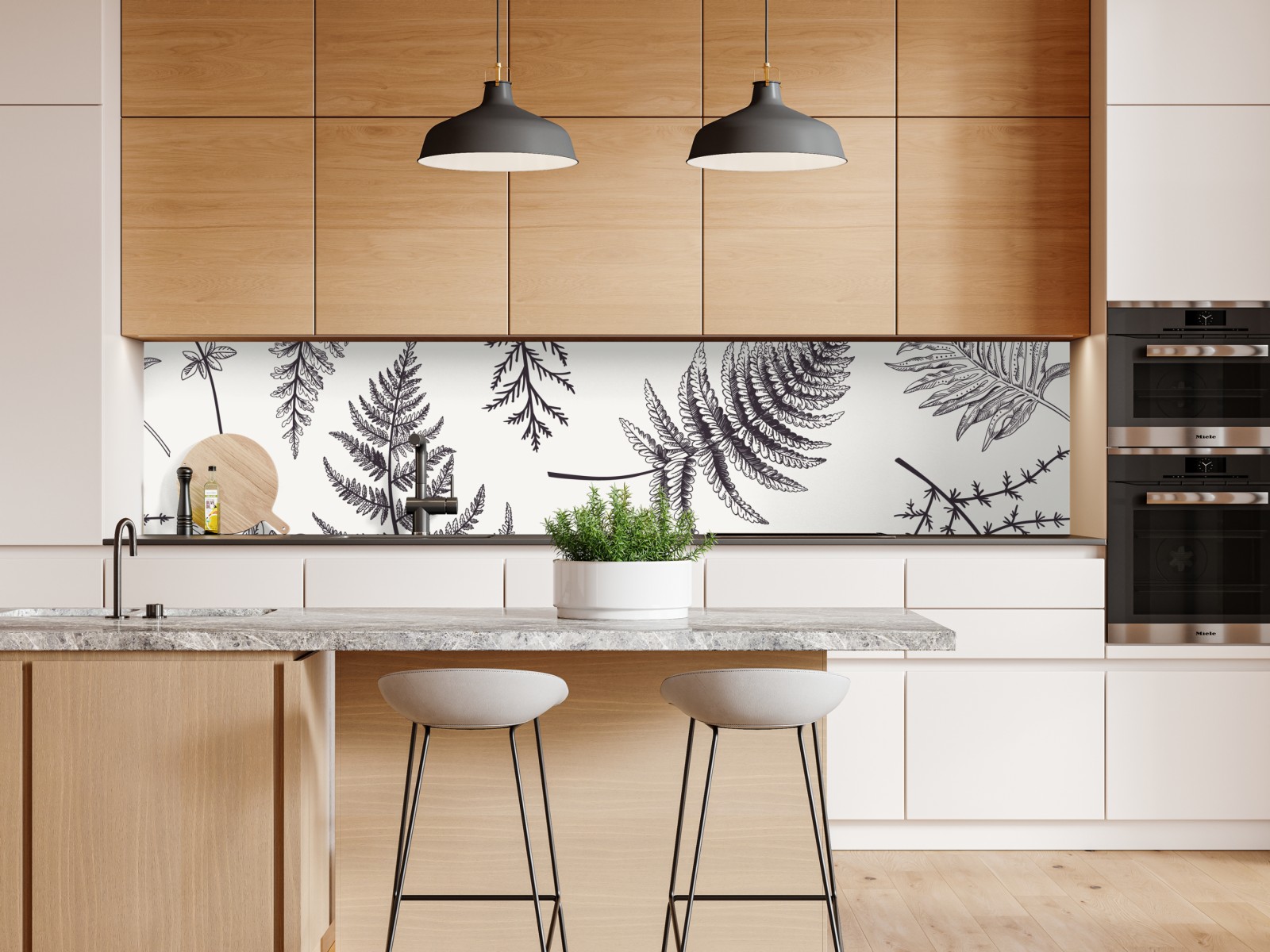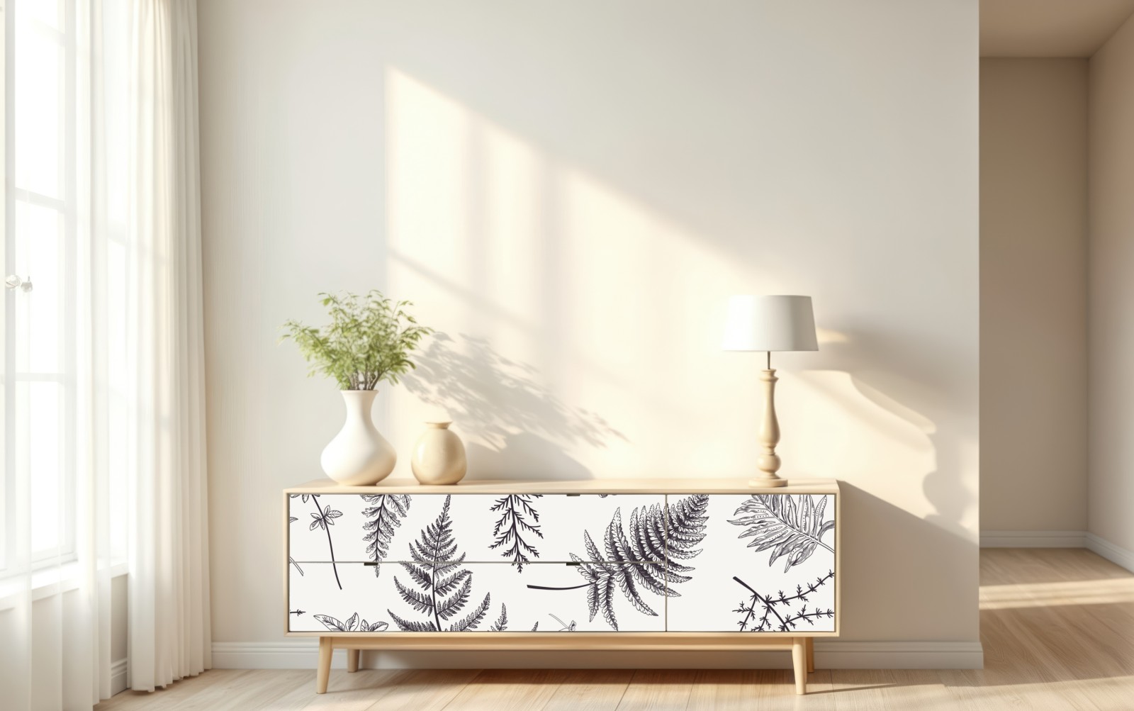 Elegante monochrome botanische Illustration mit Farnen, Blättern und dezenten Naturakzenten, ideal für moderne Wohnräume.