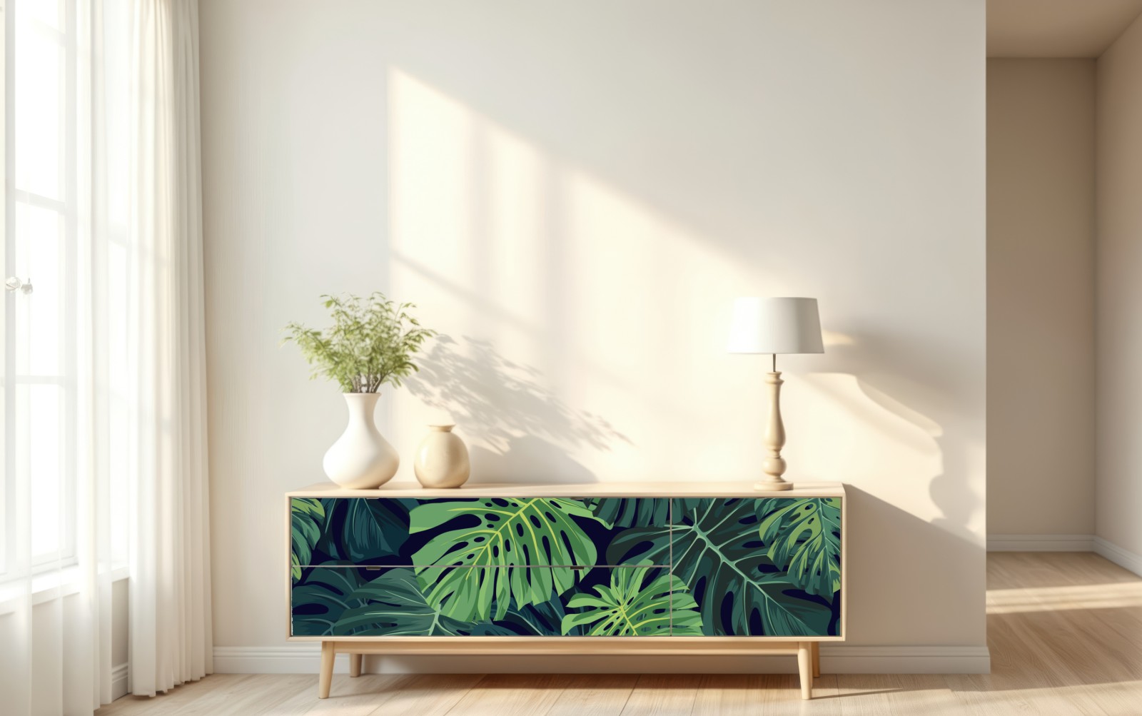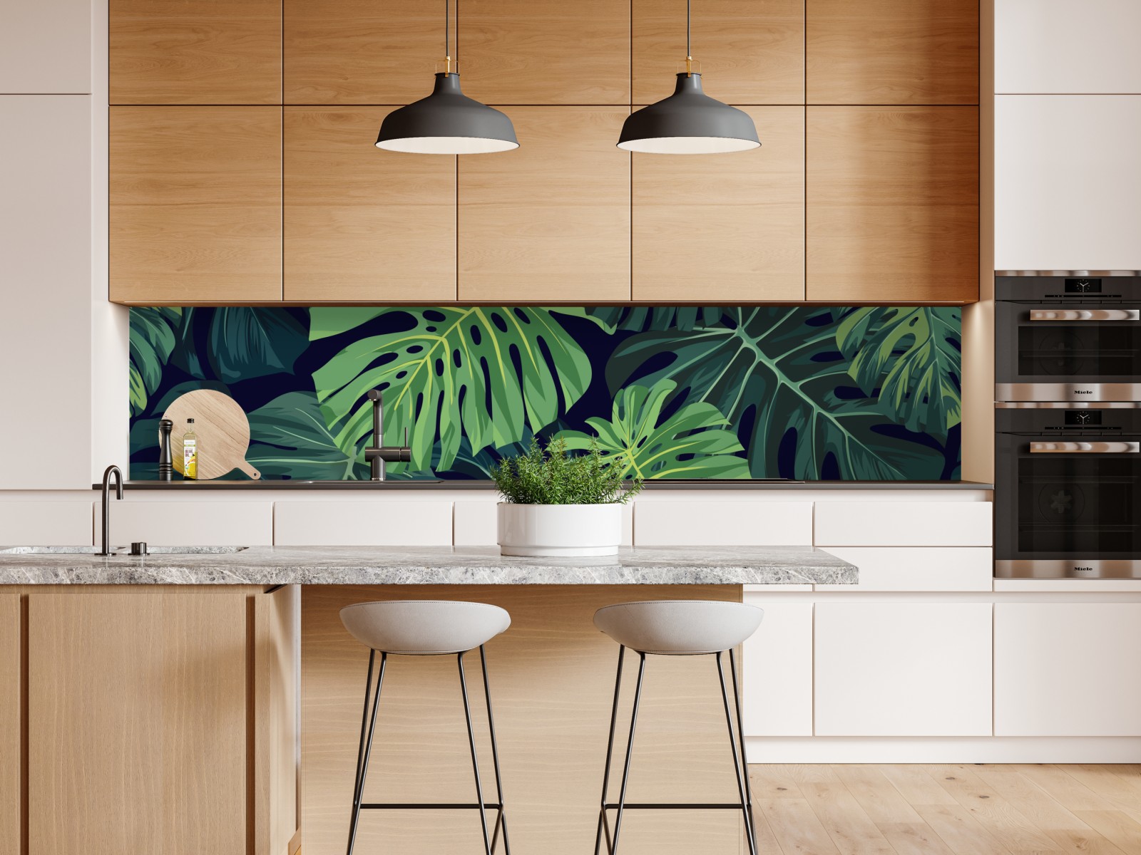 Üppiges Muster aus Monstera-Blättern bringt leuchtendes Grün und natürliche Atmosphäre in jeden Raum und eignet sich ideal als biophiles Highlight.