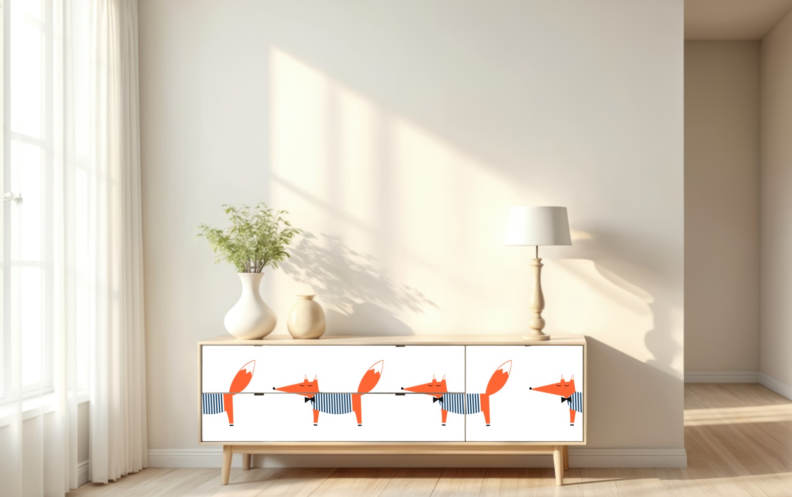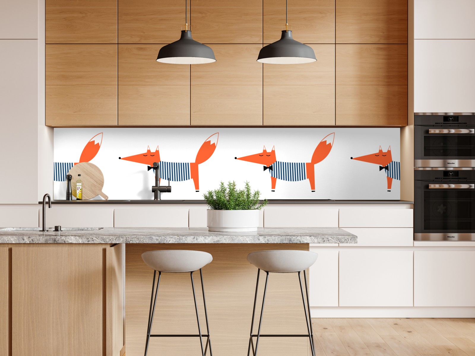 Verspieltes gestreiftes Fuchsmuster in kräftigem Orange und Navy auf weißem Hintergrund, ideal für Kinderzimmer.
