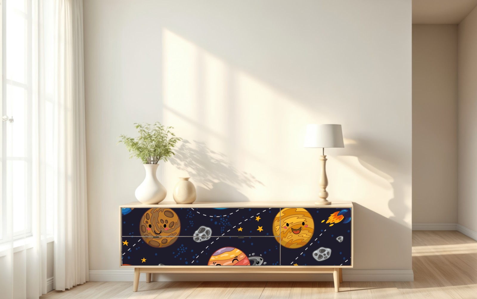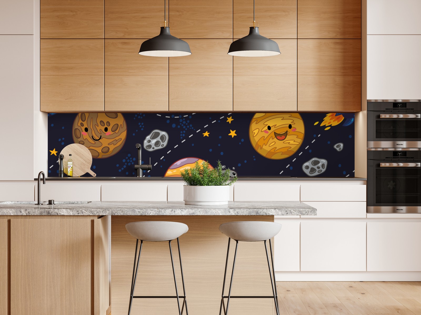 Bunte und fröhliche Illustration lächelnder Planeten und Sterne, perfekt zur Dekoration von Kinderzimmern mit Weltraumthema.