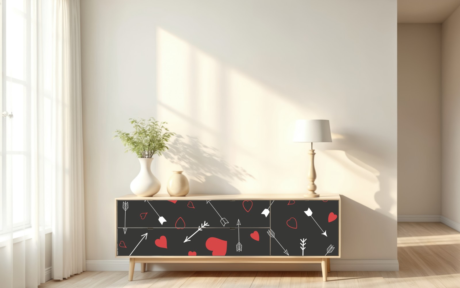 Verspieltes Muster aus Herzen und Pfeilen in Rot und Weiß auf dunkelgrauem Hintergrund verleiht jedem Raum einen romantischen, modernen Akzent.