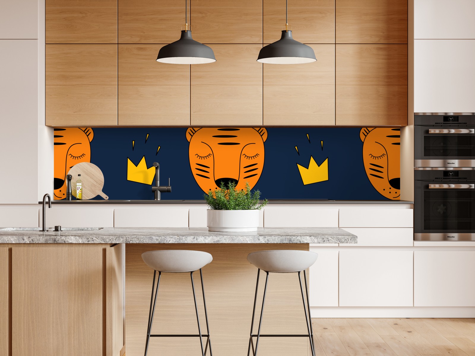 fröhliches wiederholendes tiger-muster in kräftigem orange auf dunkelblauem grund, ideal für kinderzimmer und kinderbereiche.