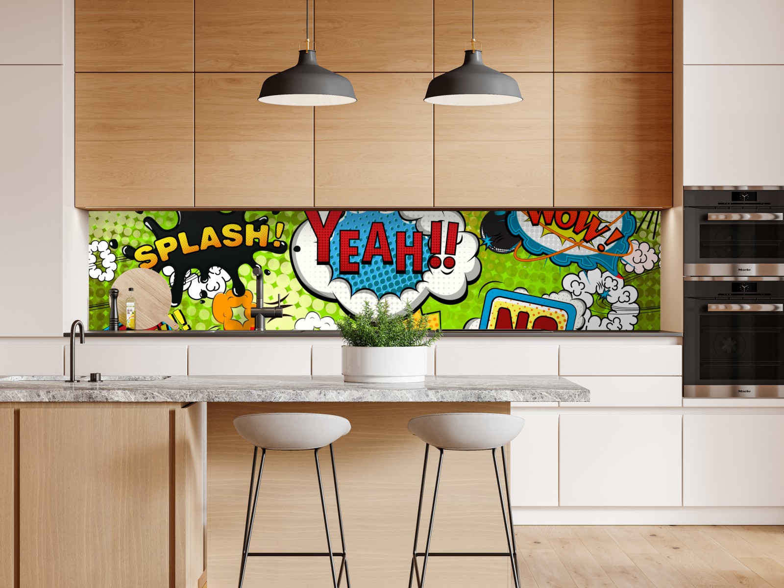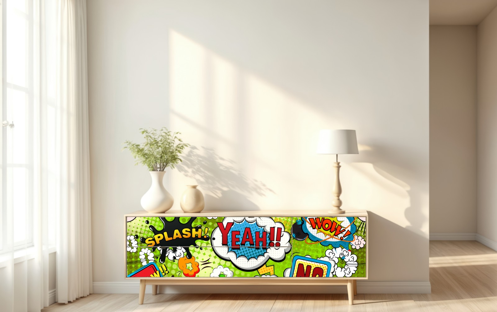 lebhafte pop-art-comic-collage mit bunten sprechblasen und dynamischen raster-explosionen, die jeden raum belebt.