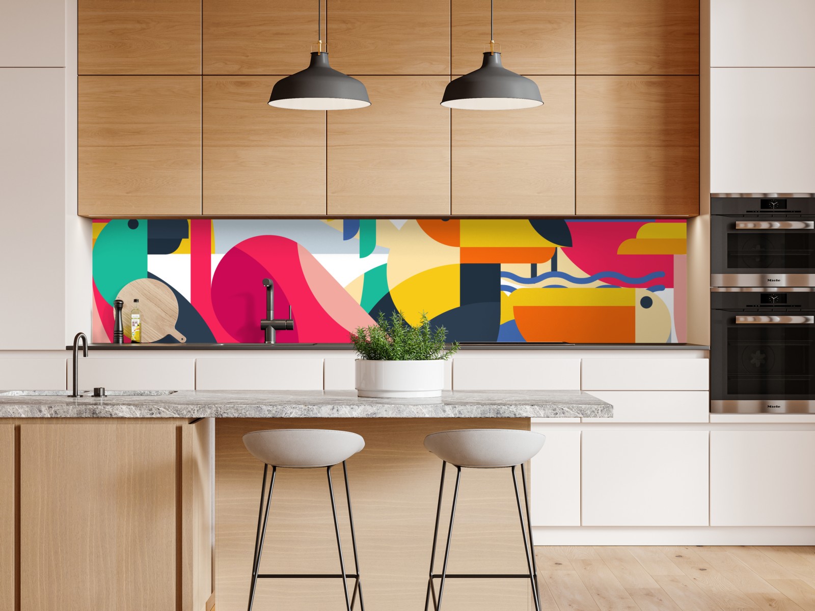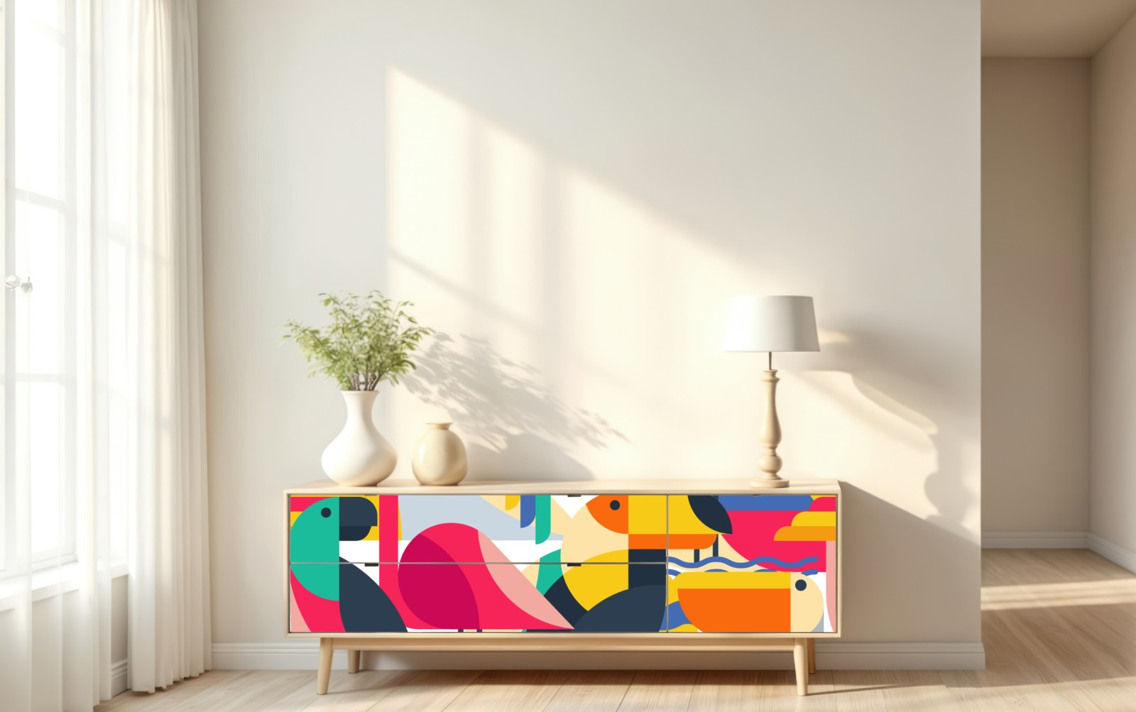 Lebendiges geometrisches Muster tropischer Vögel bringt fröhliche Farben und modernen Charme in jeden Raum.