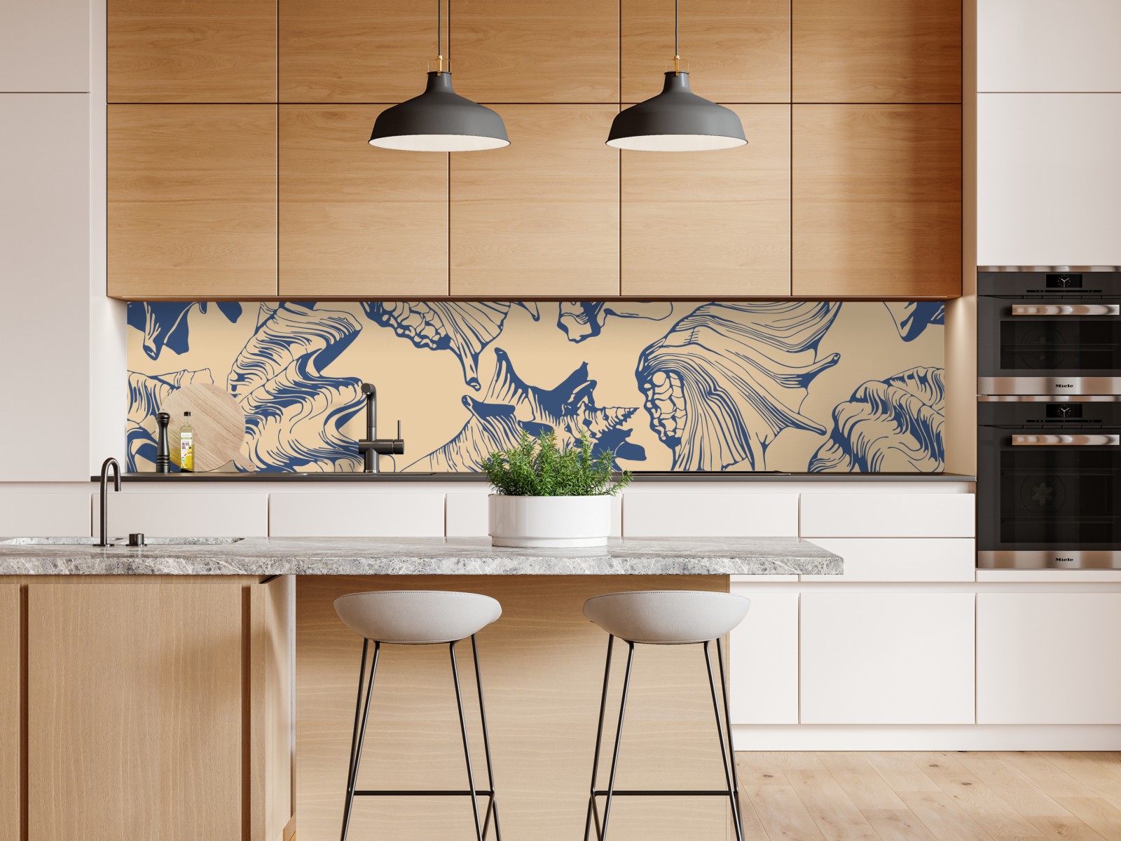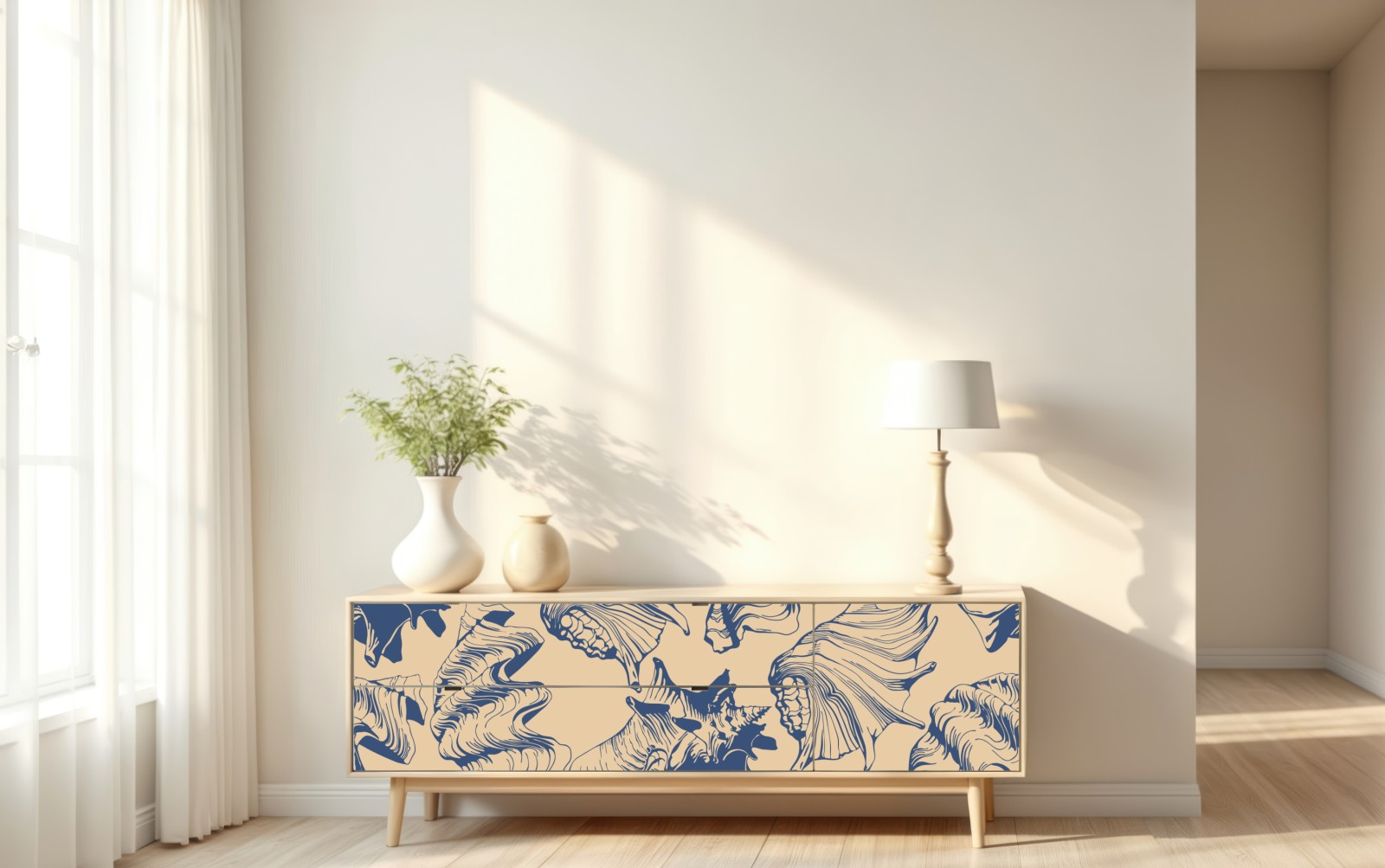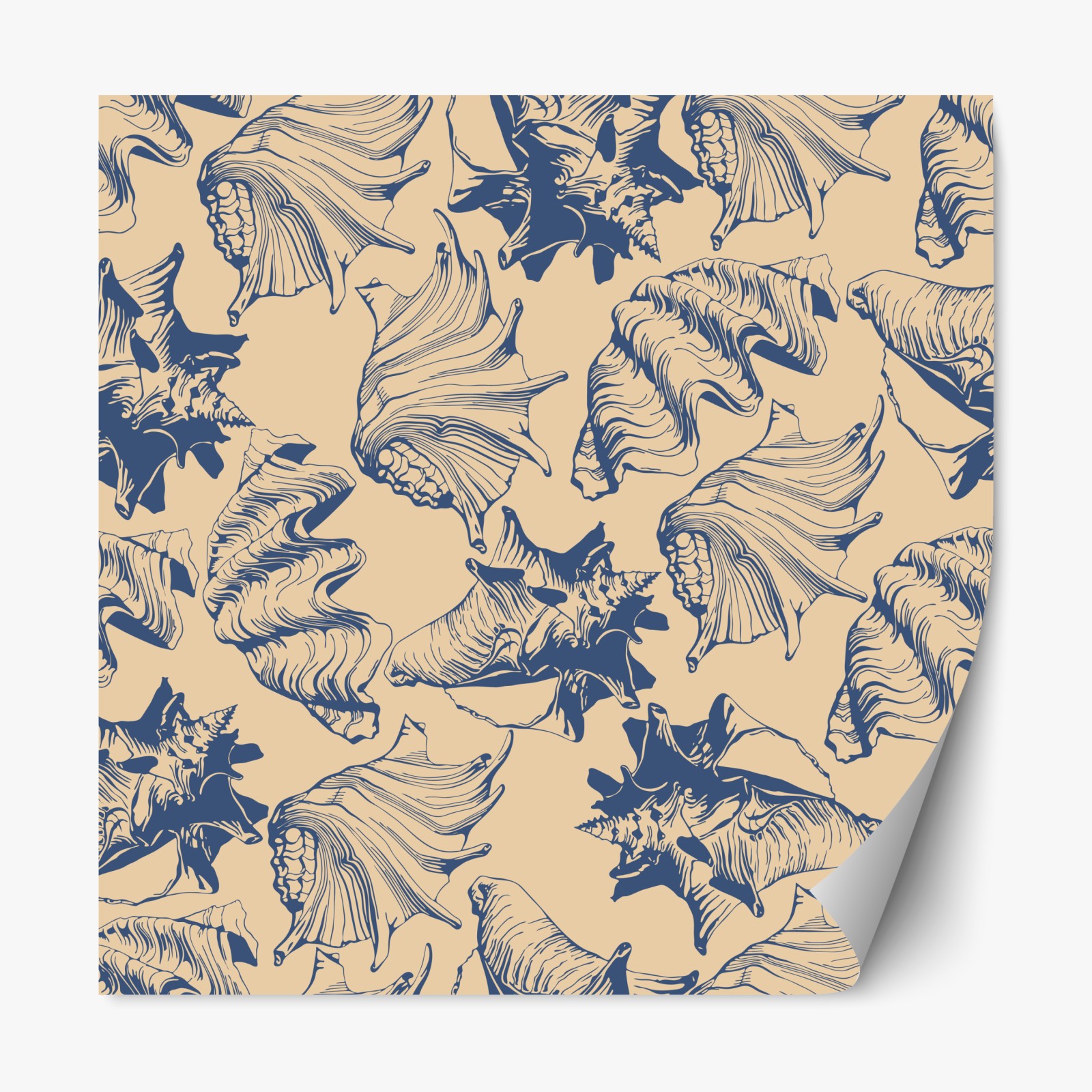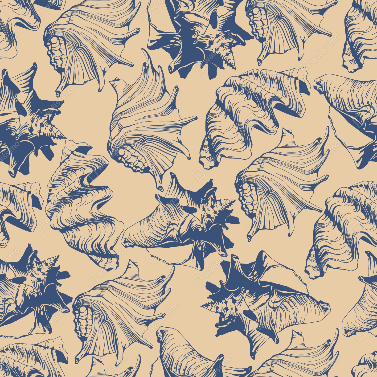 Elegantes Muschelmuster in Blau und Beige verleiht Räumen maritimes Flair und eignet sich perfekt als dekoratives Element für Wände und Stoffe.
