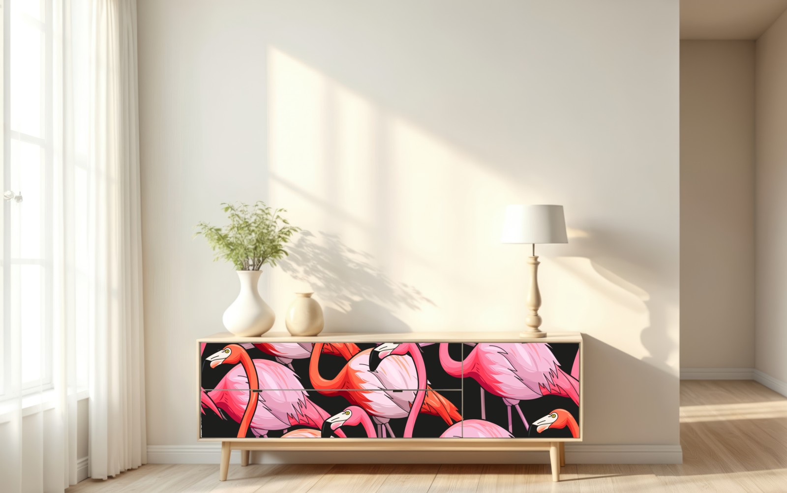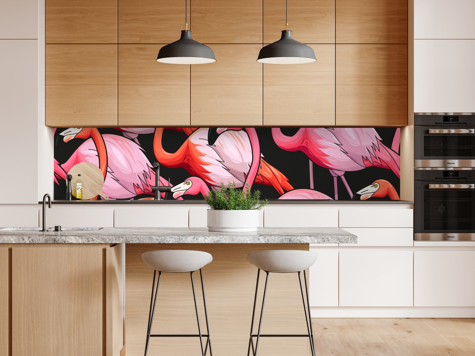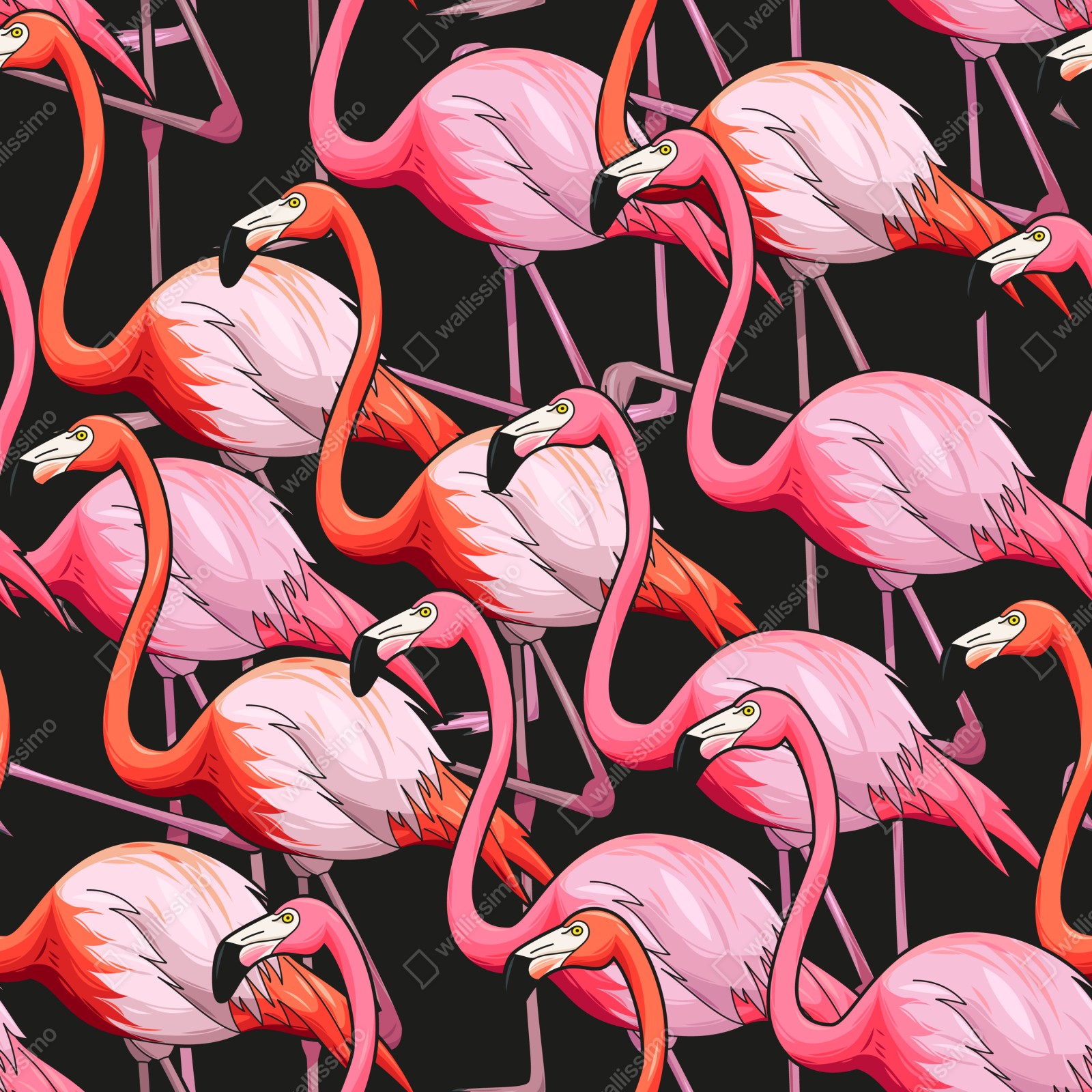 Lebhaftes nahtloses Flamingo-Muster in kräftigen Rosa- und Orange-Tönen auf schwarzem Hintergrund, perfekt für verspielte und tropisch inspirierte Wohnräume.