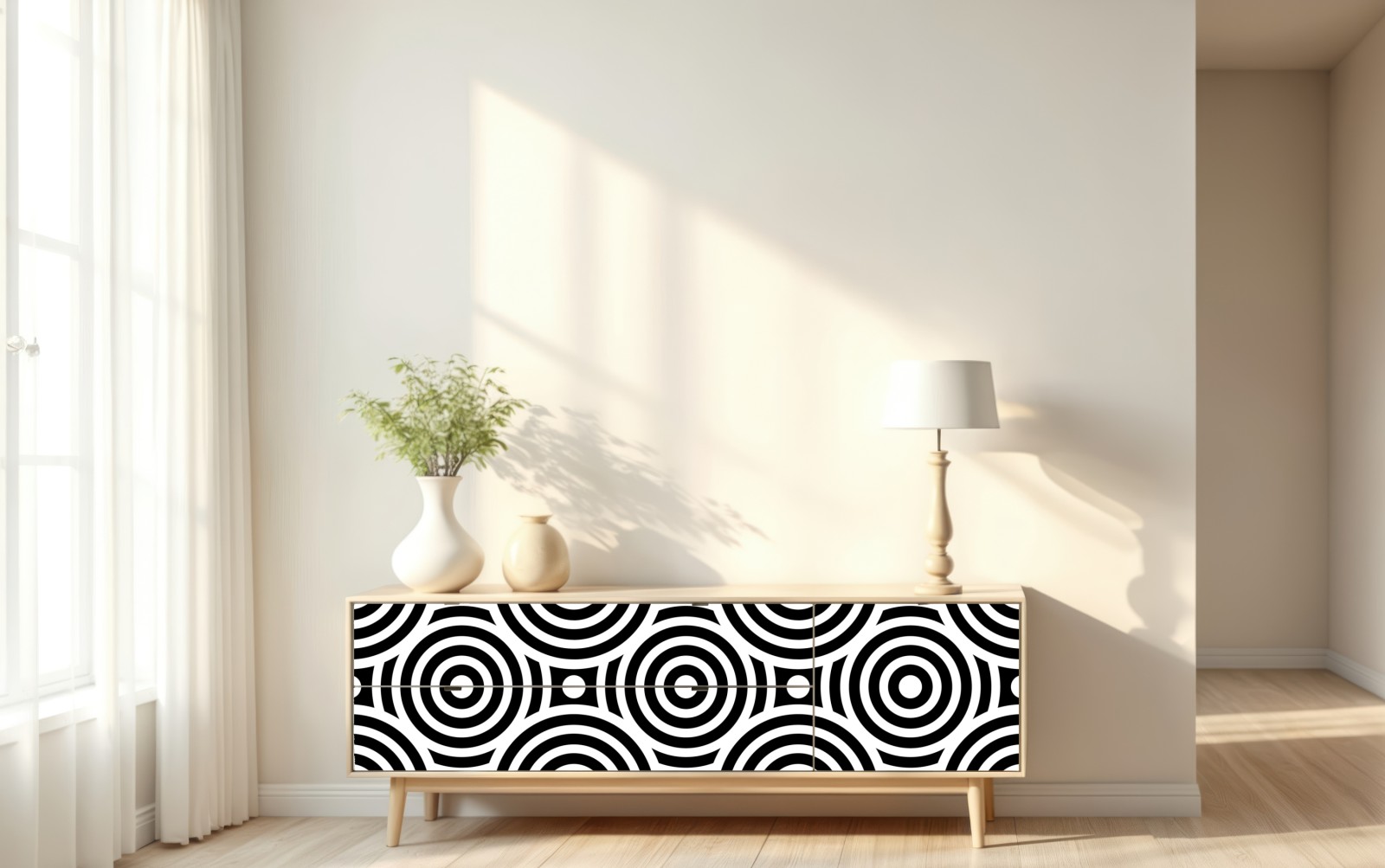 Markantes schwarz-weißes Muster aus konzentrischen Kreisen verleiht jedem Raum eine moderne, grafische Note.