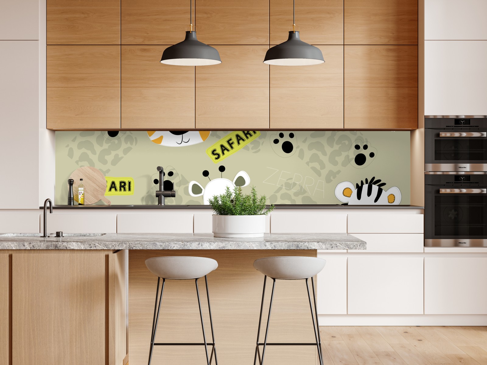 Verspieltes Safari-Tiermuster mit Zebra, Tiger, Giraffe und Löwe auf weichem beigen Hintergrund, ideal für Kinderzimmer.