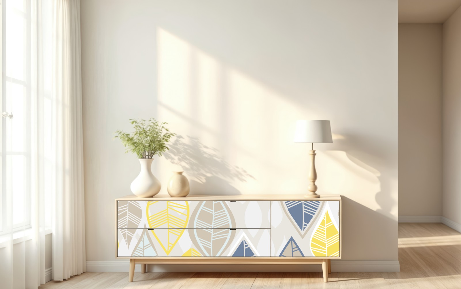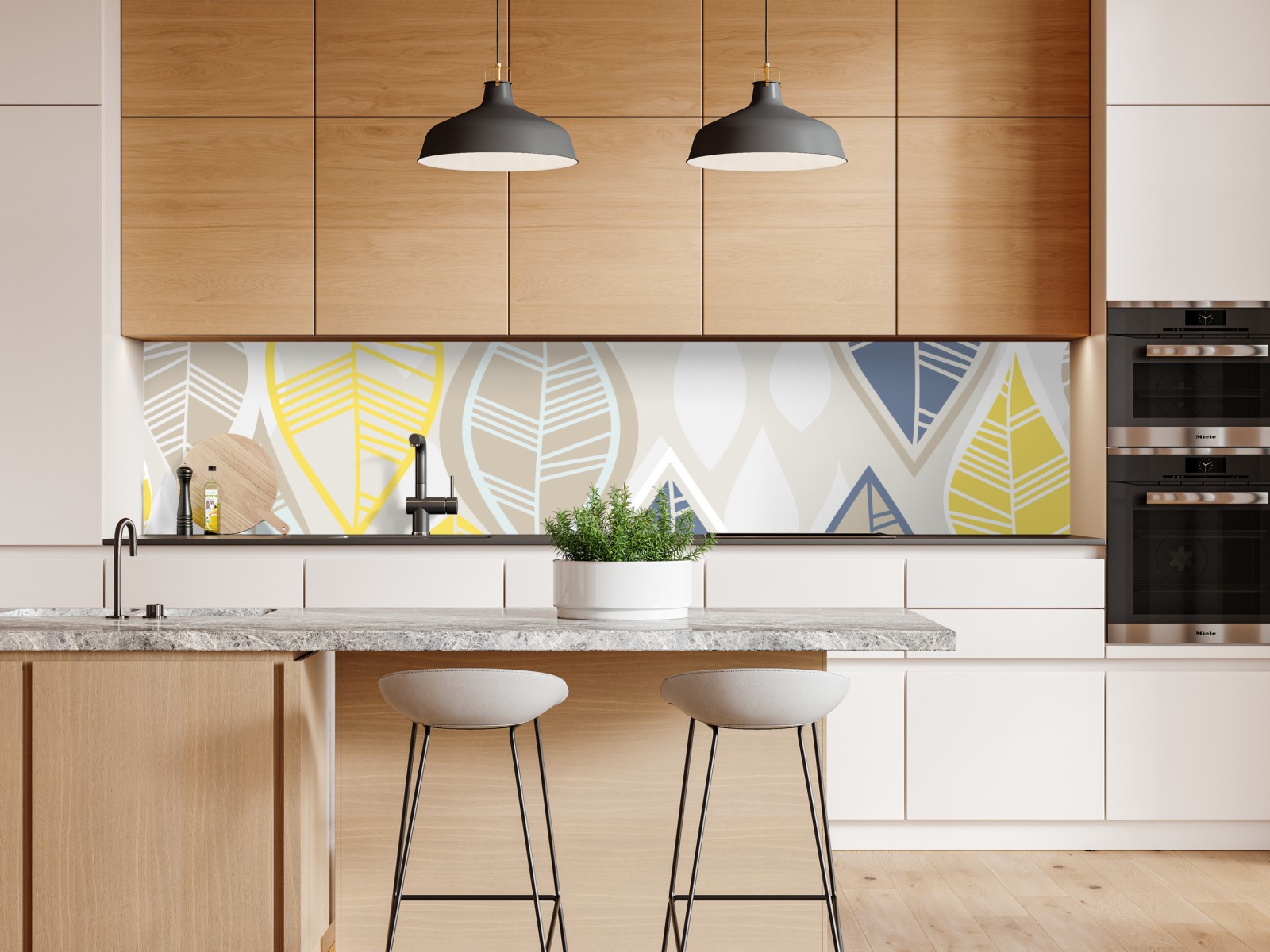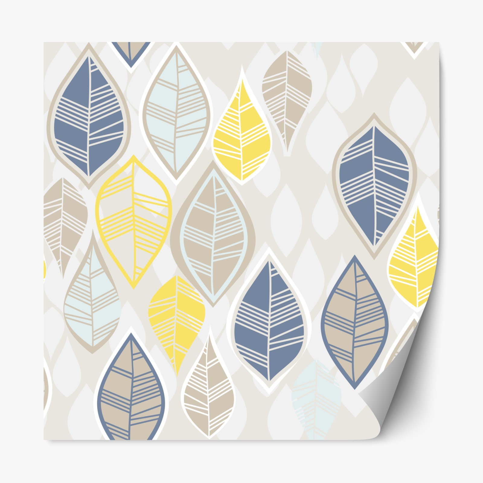 Verleihen Sie dem Raum einen ruhigen, modernen Akzent mit einem wiederholenden Blättermuster in sanften Beige-, Blau- und Gelbtönen.