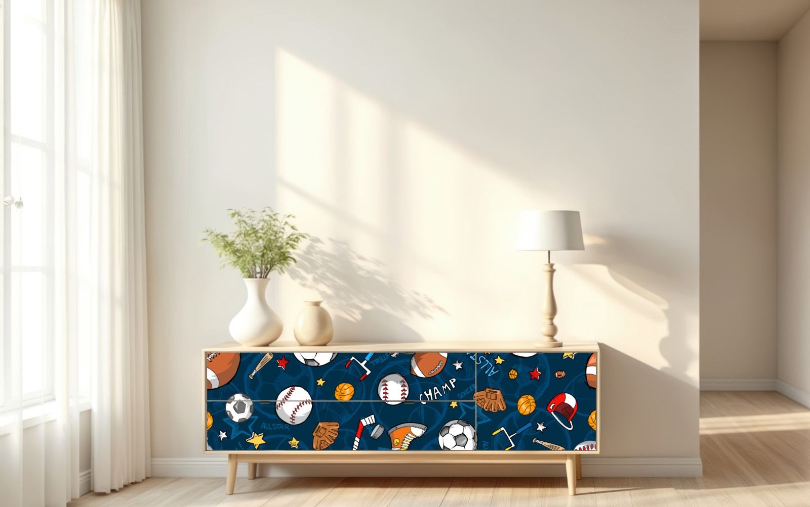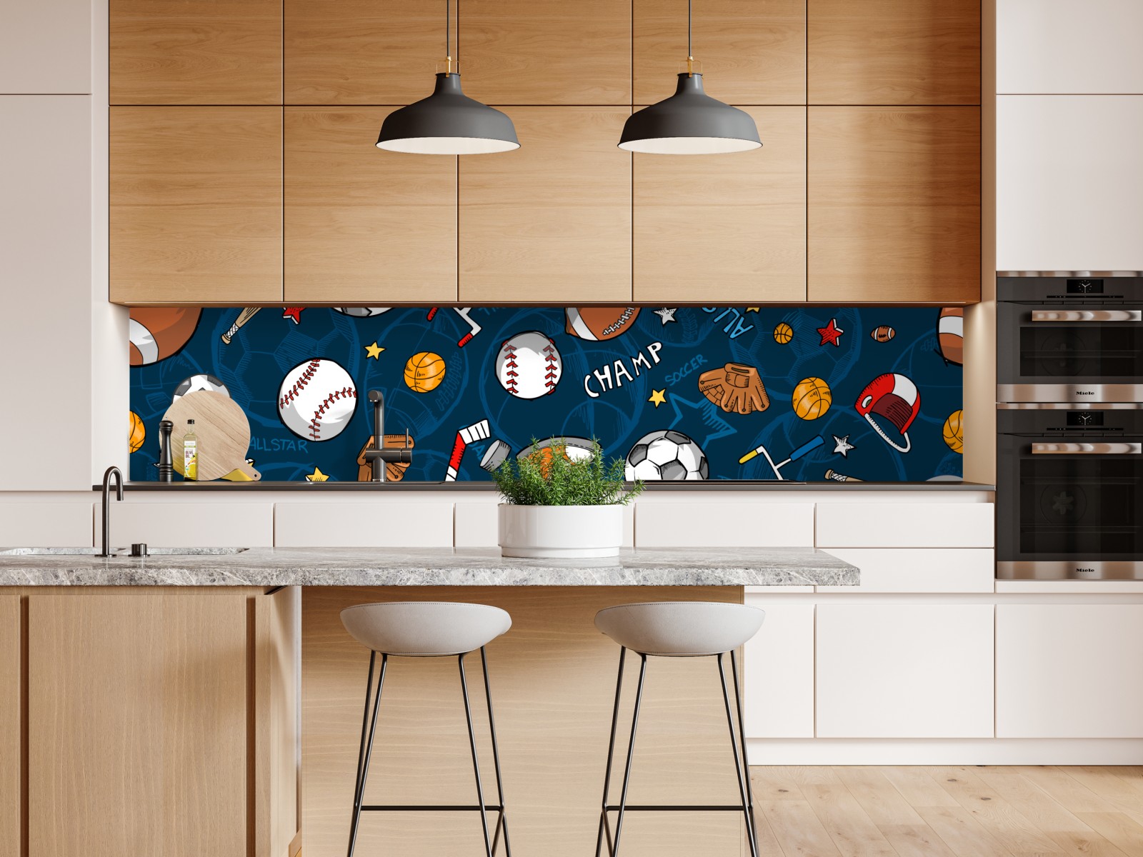 Lebendiges nahtloses Sportmuster mit Motiven aus Fußball, Basketball, Baseball und American Football auf dunklem Blau, ideal zur Belebung von Kinderzimmern und Spielbereichen.