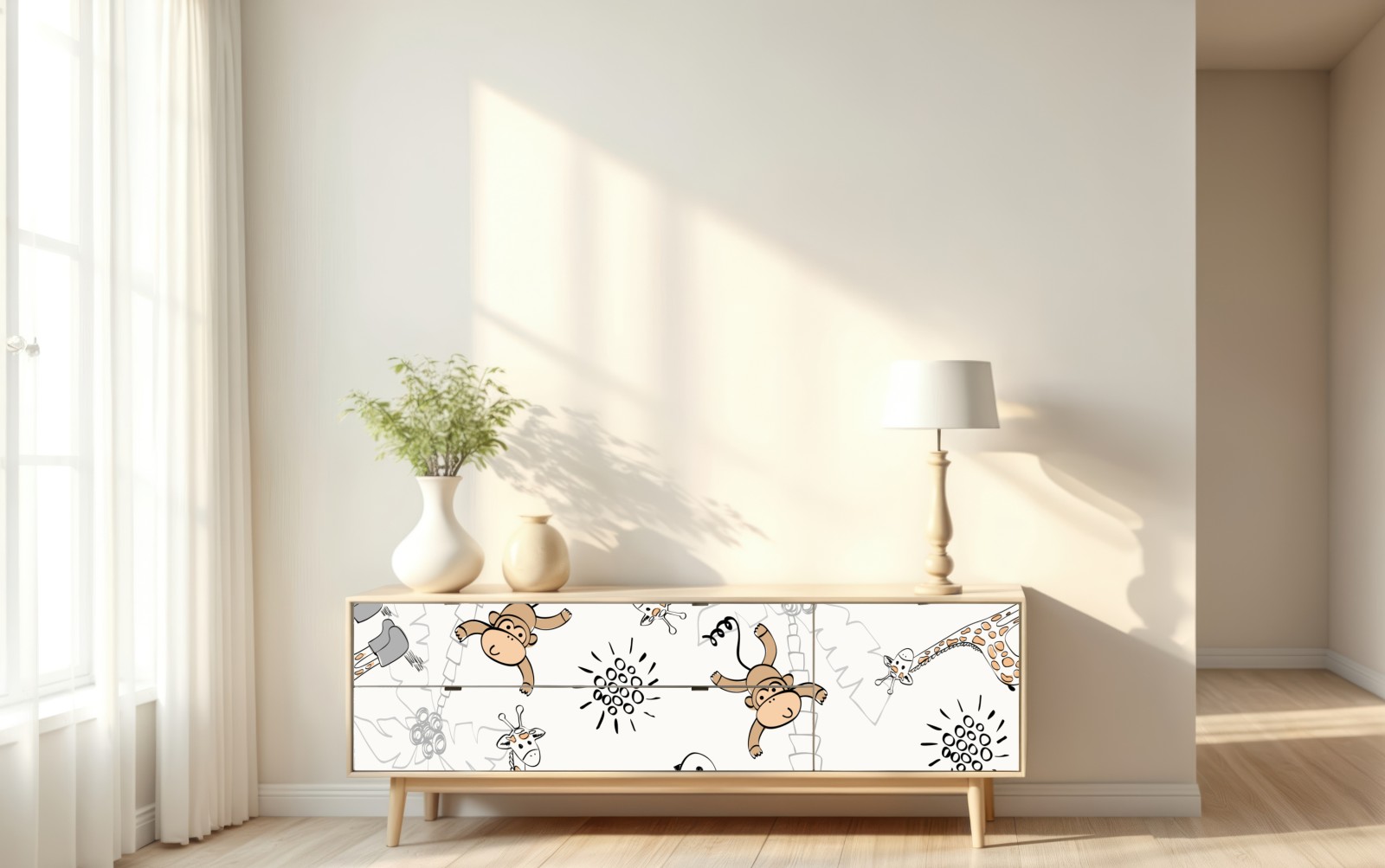 verspieltes dschungelmuster mit affen, giraffen und vögeln bringt fröhlichkeit ins kinderzimmer.