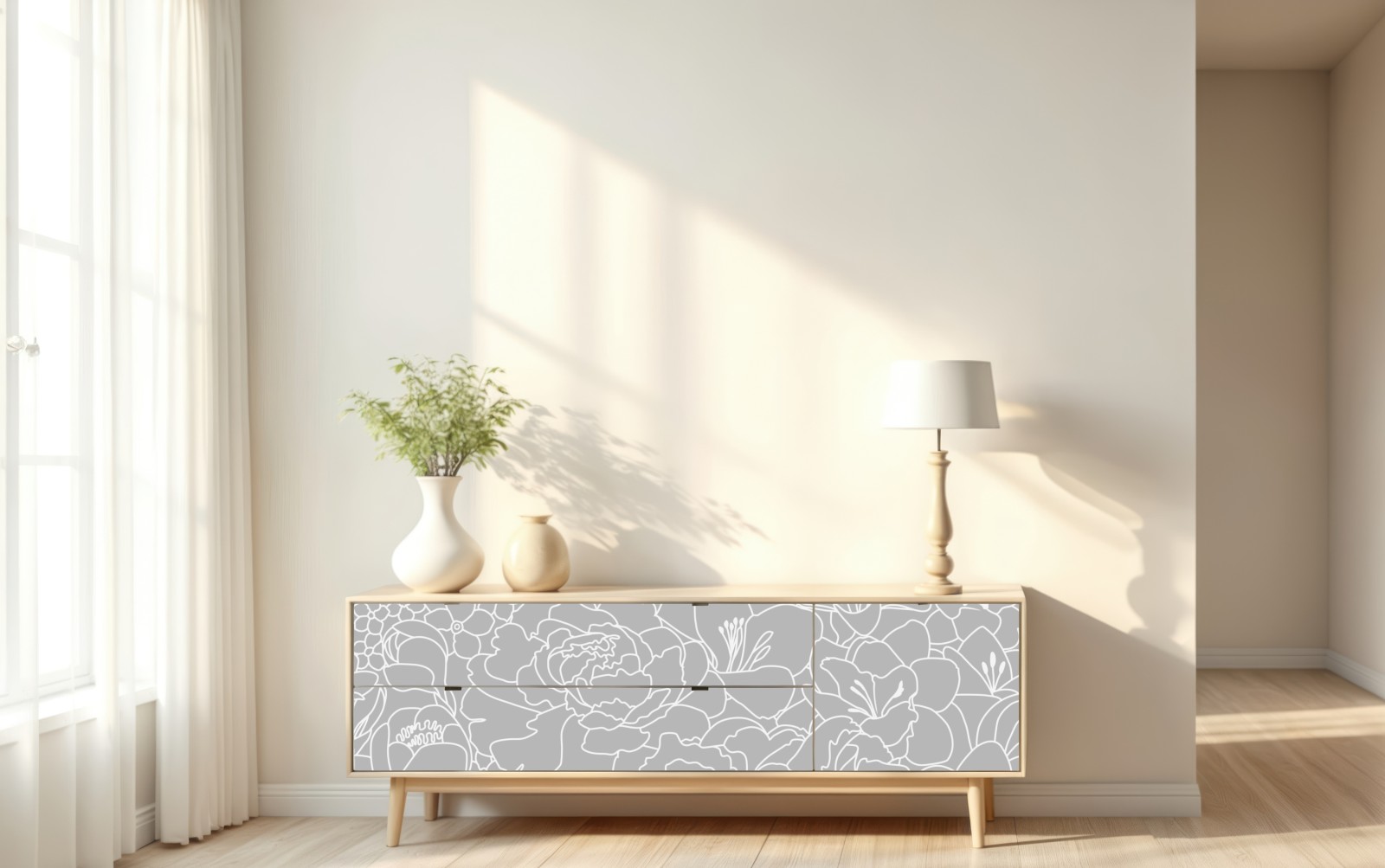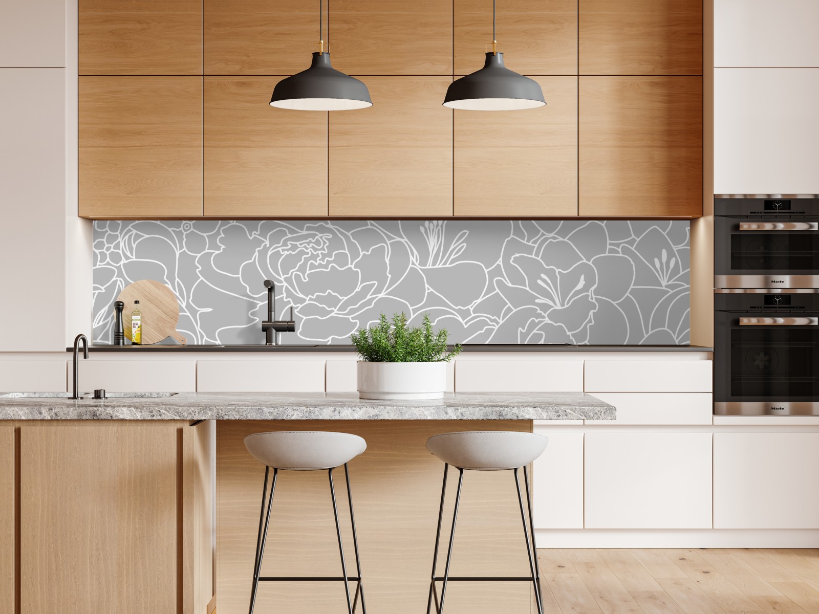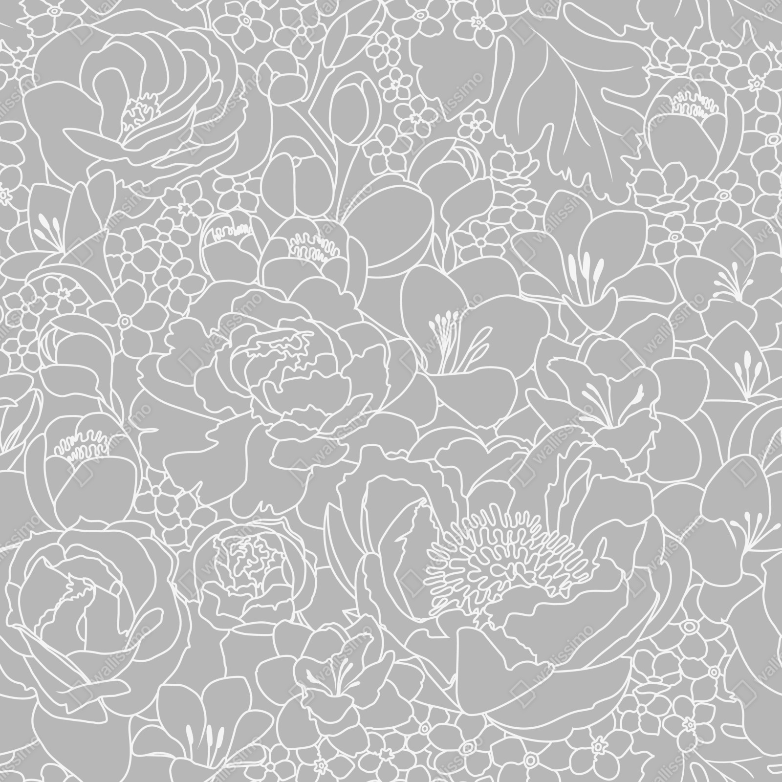 Elegantes monochromes Blumenmuster mit feinen weißen Konturen auf grauem Hintergrund, ideal um einem Raum eine ruhige, moderne Note zu verleihen.