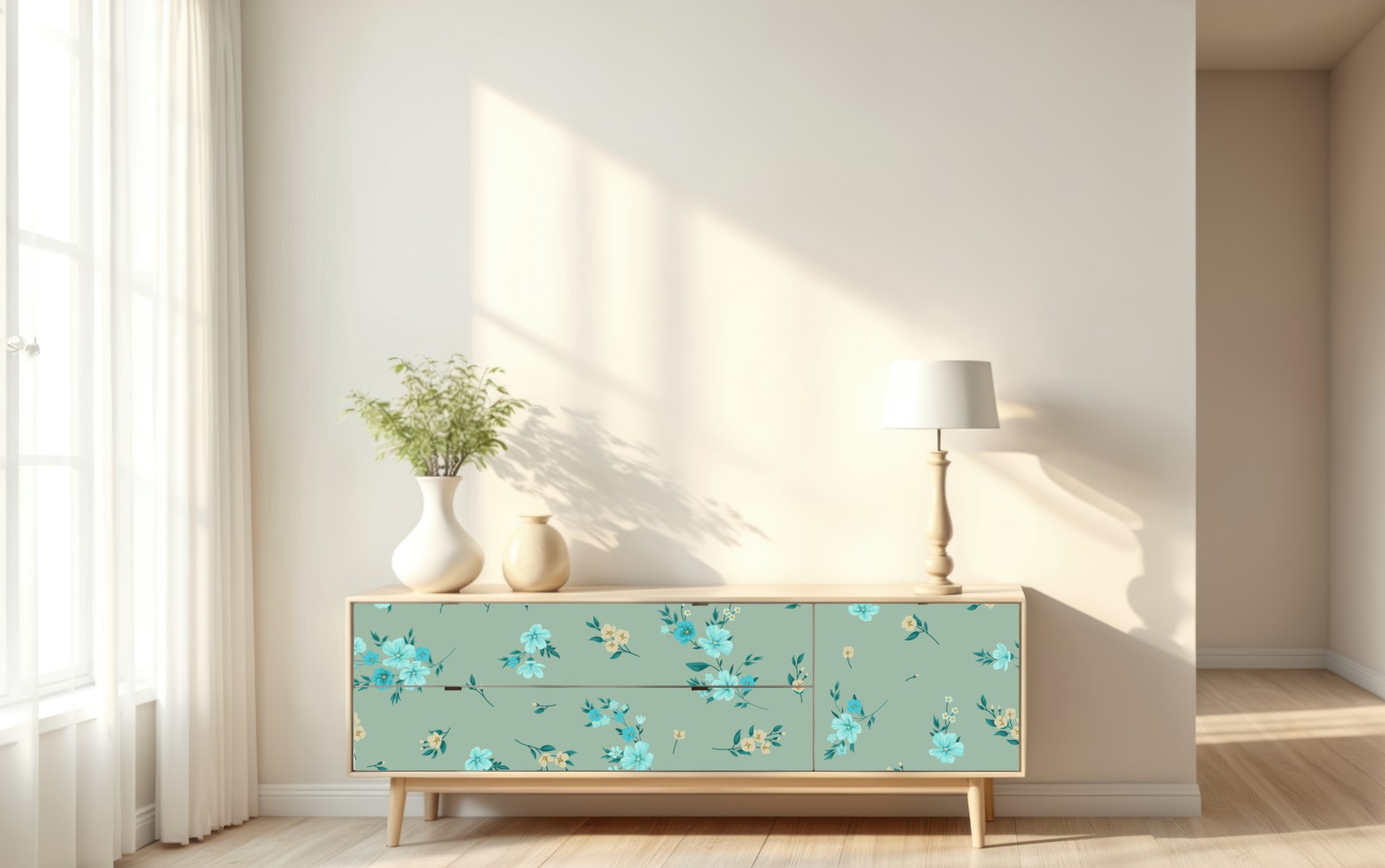 zarte türkis- und cremefarbene blüten auf sanftem salbeigrünem hintergrund bringen eine beruhigende botanische atmosphäre in jeden raum.