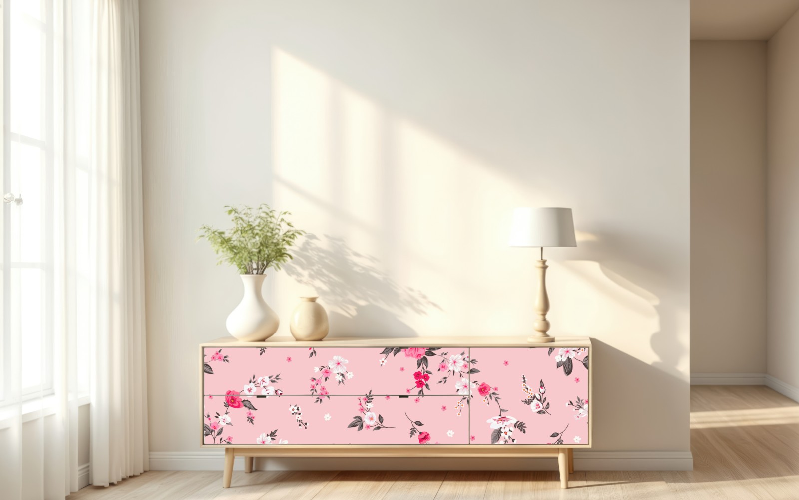 Sanfte Pastellblumen schaffen eine zarte, romantische Atmosphäre, ideal für Schlafzimmer oder Kinderzimmer.