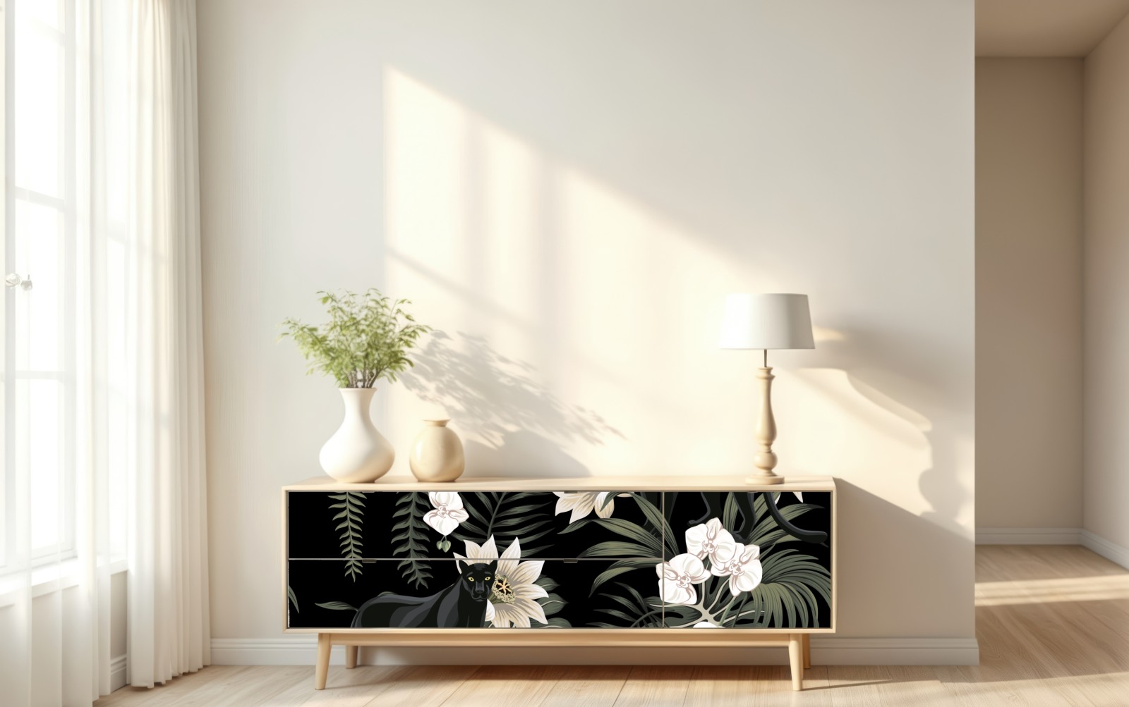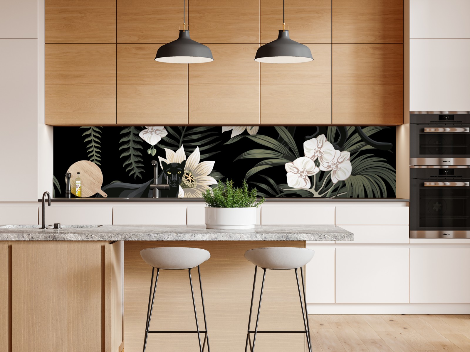 Ein kräftiges botanisches Motiv mit schwarzen Panthern und cremefarbenen Orchideen auf tiefschwarzem Hintergrund, ideal, um jedem Raum tropische Dramatik zu verleihen.
