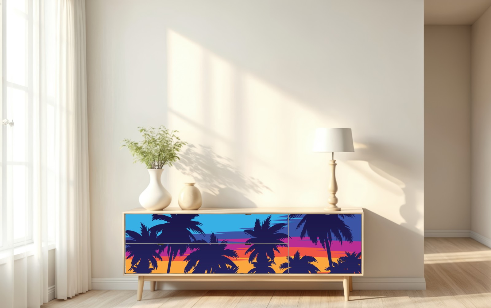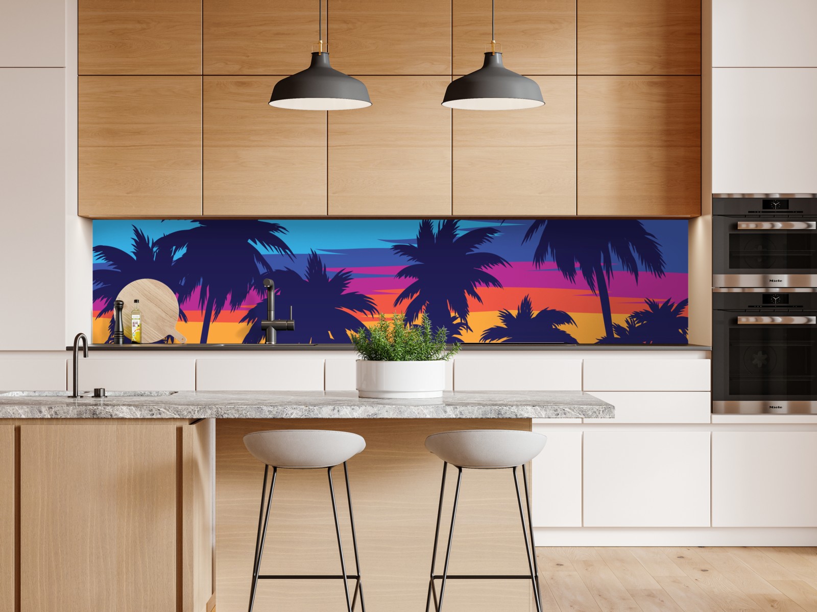 Lebhafte retro-palmen vor einem farbenfrohen sonnenuntergang schaffen eine tropische atmosphäre für jeden raum.