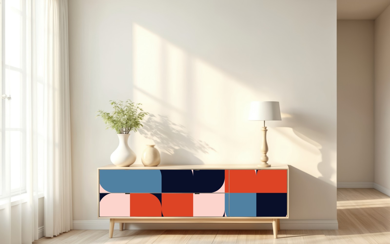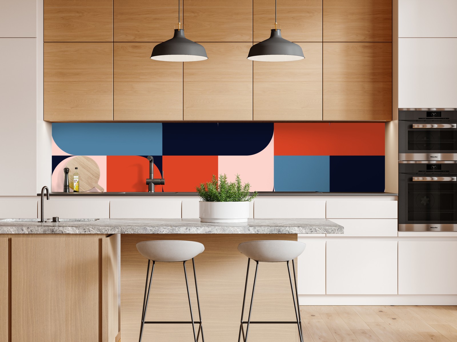 Ein kräftiges retro-inspiriertes geometrisches Motiv in Marineblau, Rot und Rosé, das modernen Charakter in jeden Raum bringt.