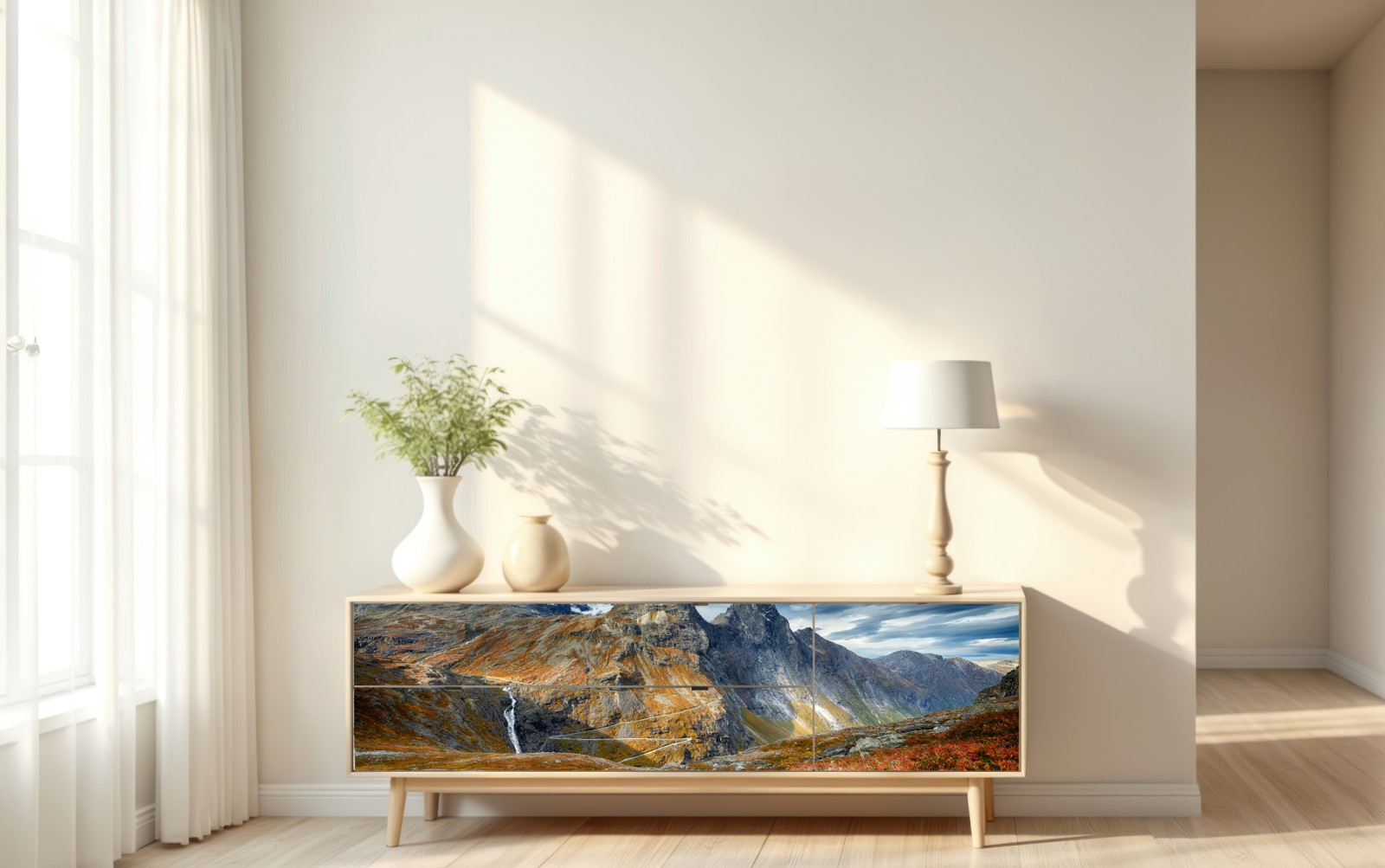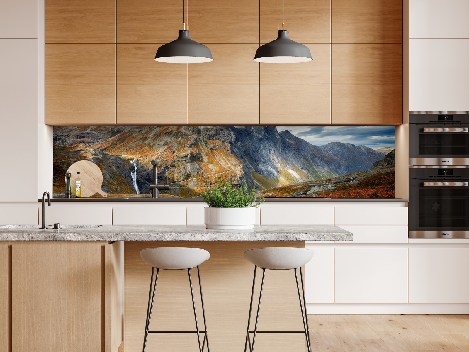 Dramatische herbstliche Bergszenerie mit leuchtenden Rot- und Orangetönen, schroffen Gipfeln und einer gewundenen Straße am Wasserfall, ideal um Ihrem Raum Wärme und Abenteuer zu verleihen.
