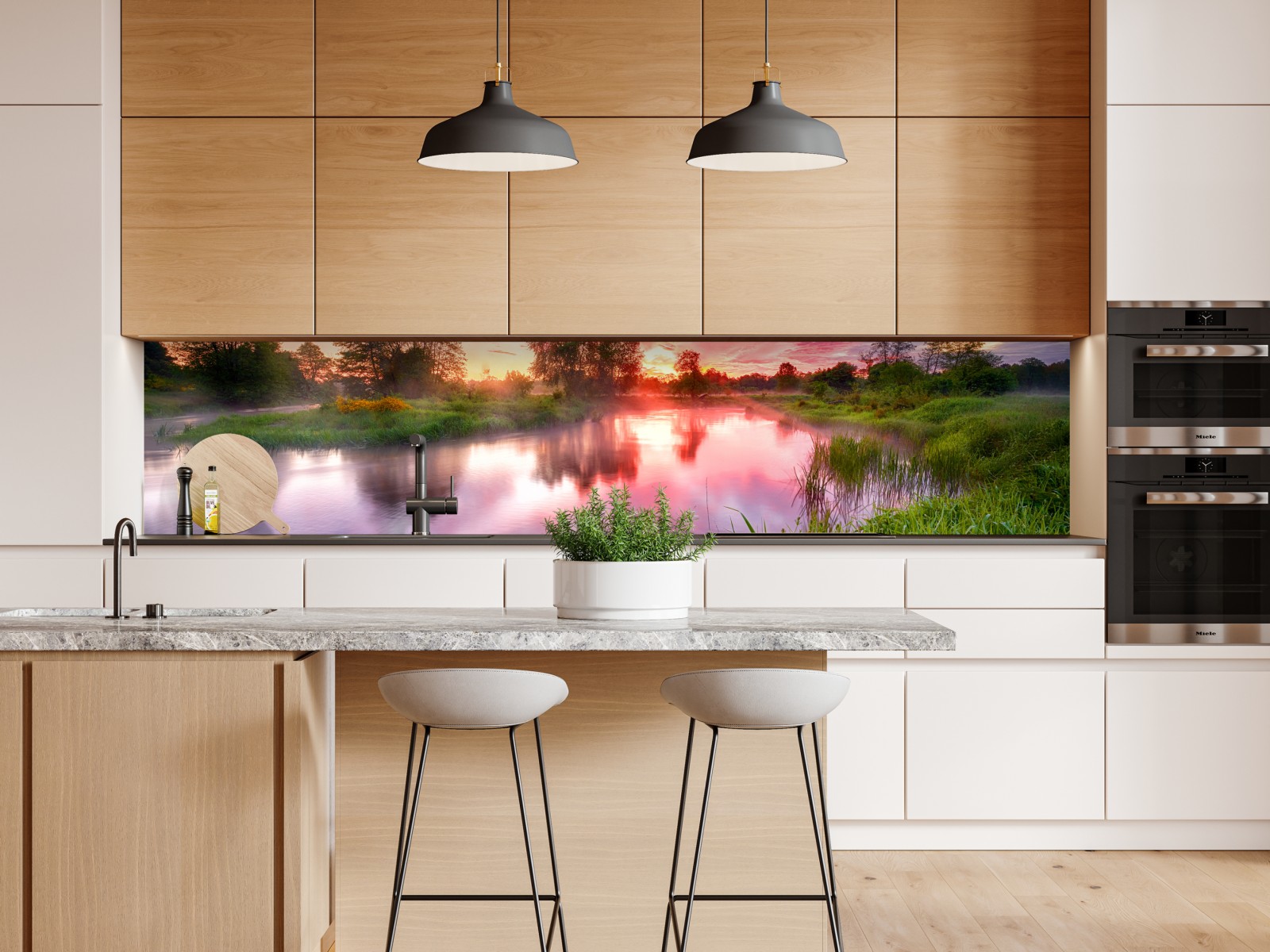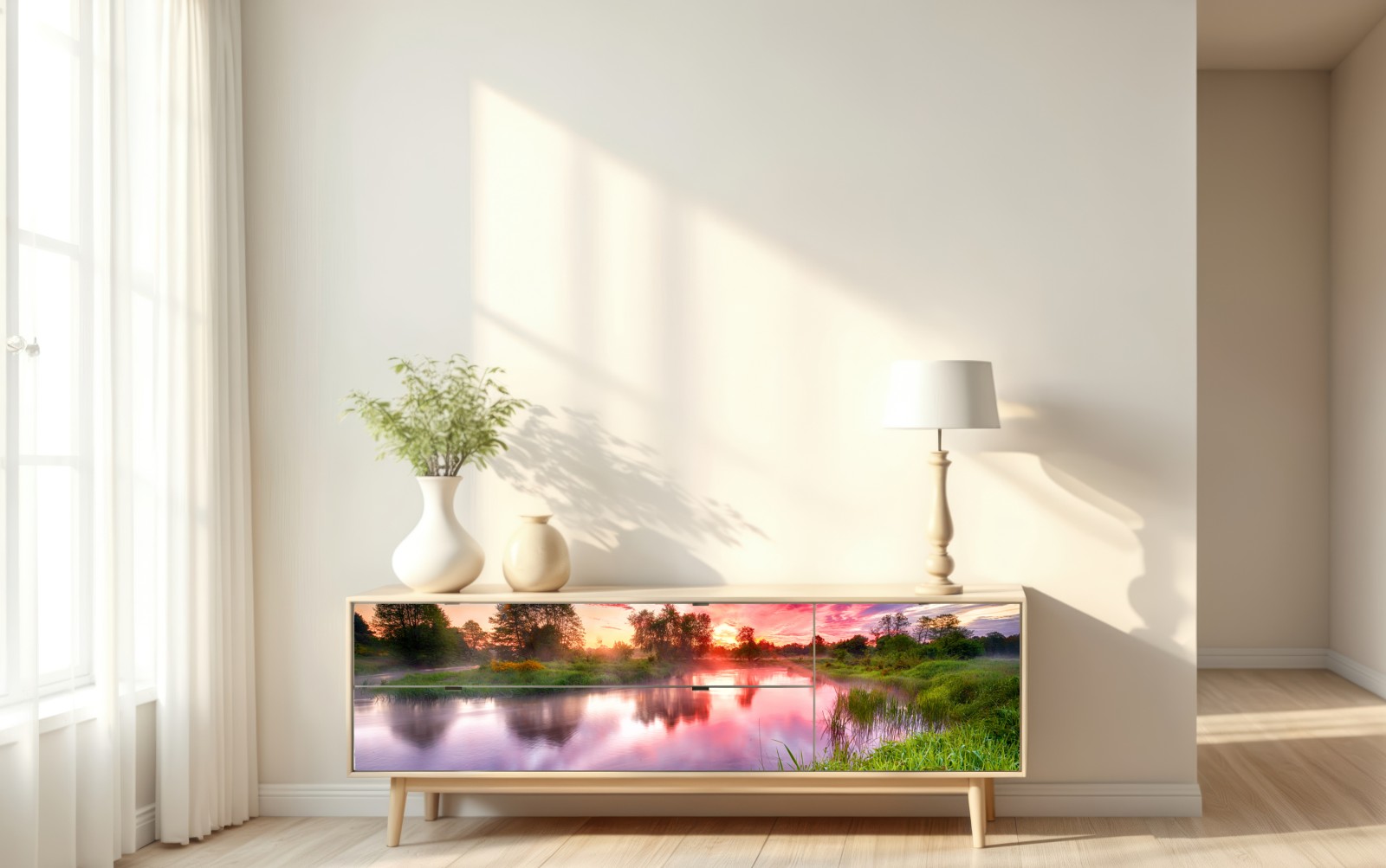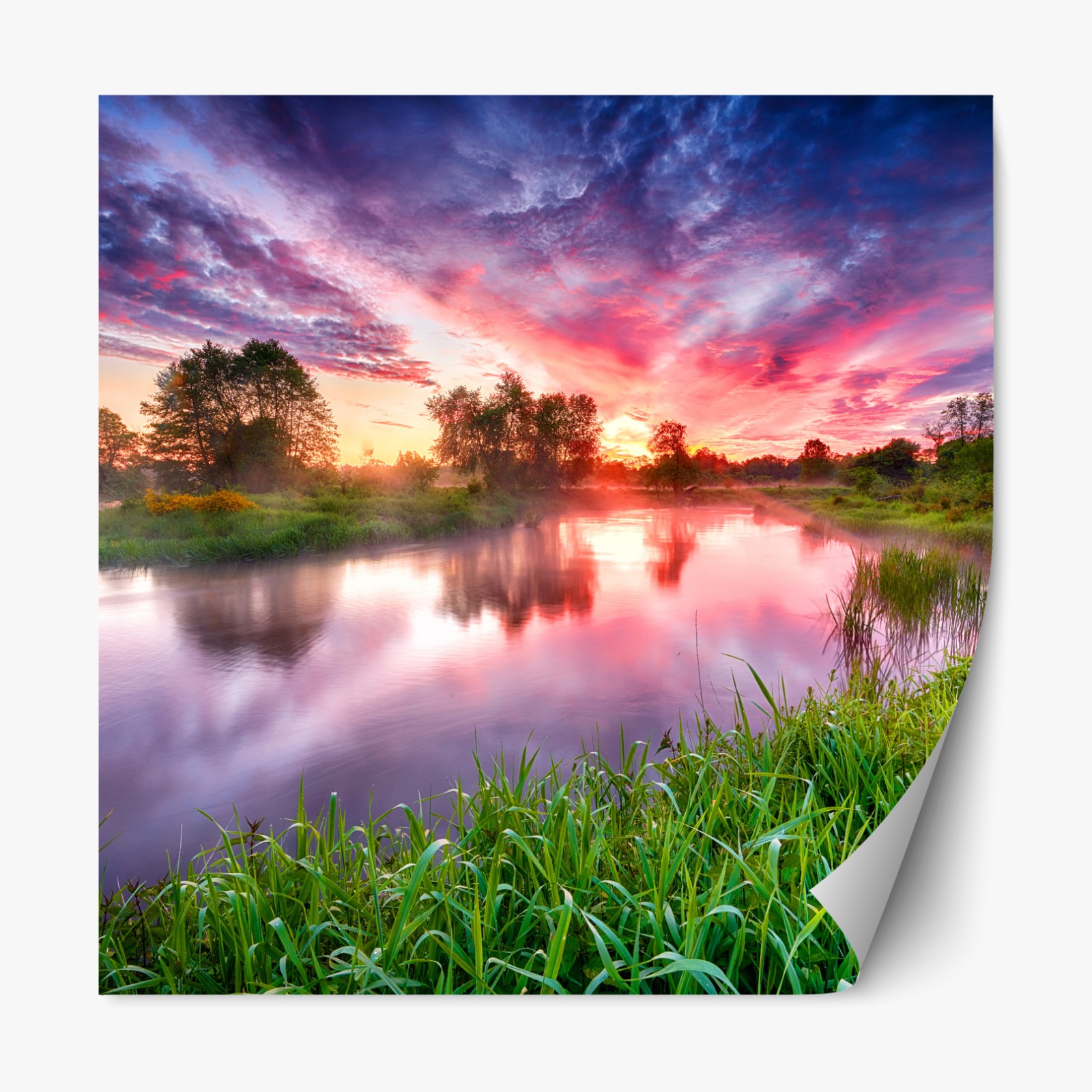 Erleben Sie die ruhige Stimmung eines sommerlichen Sonnenaufgangs am Fluss, lebendige Farben und natürliche Harmonie für jeden Raum.