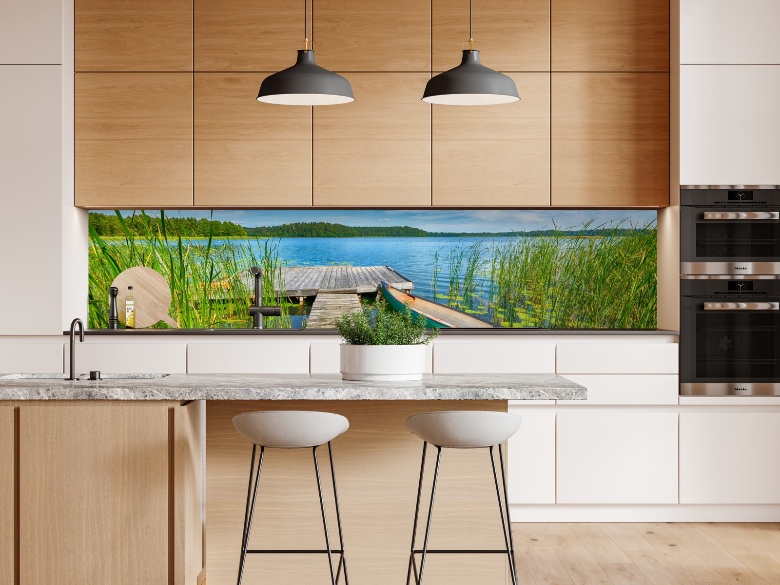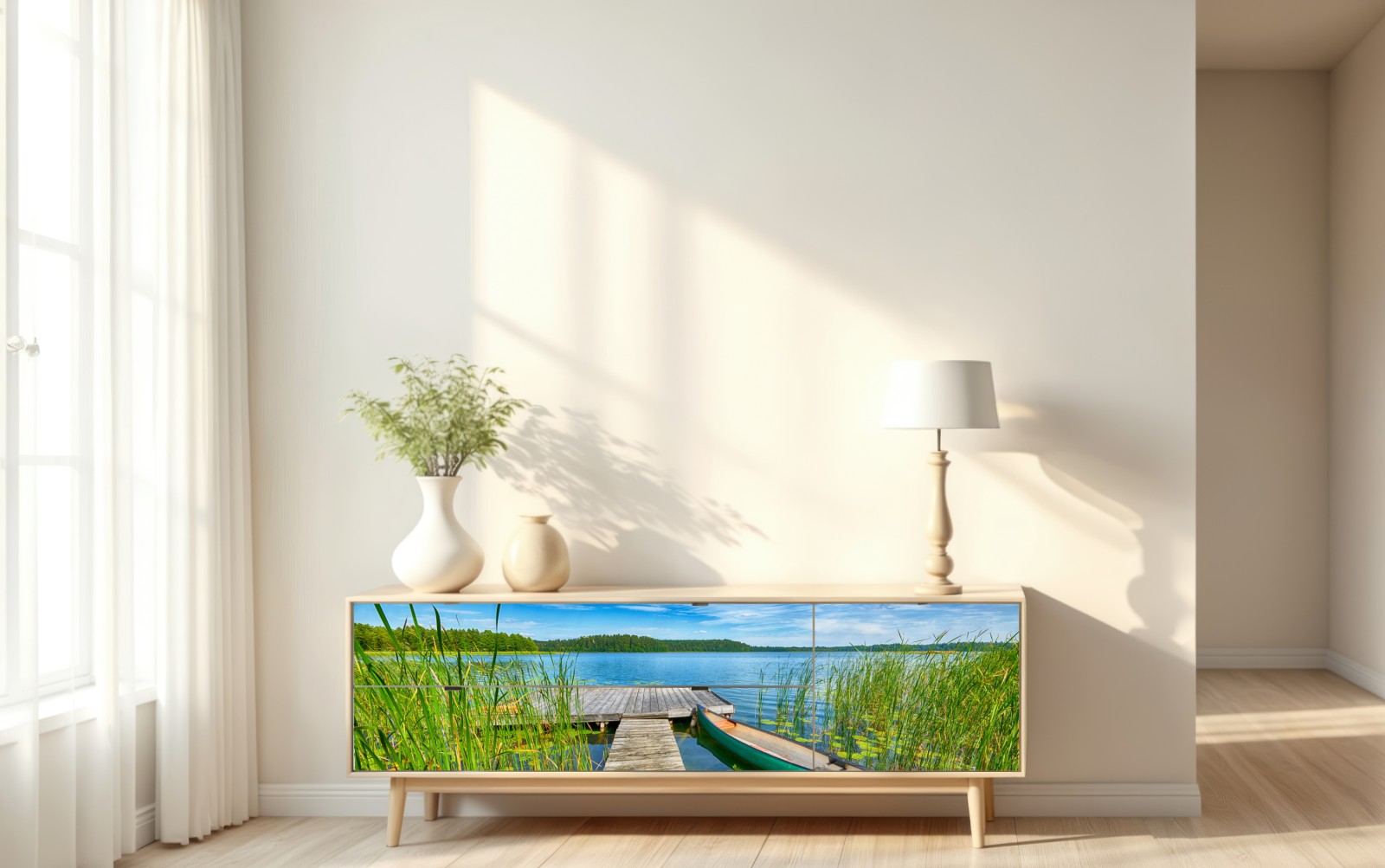 Heller Sommerblick auf einen ruhigen Masurensee mit Holzsteg und Kanu, ideal um natürliche Ruhe in Ihr Zuhause zu bringen.