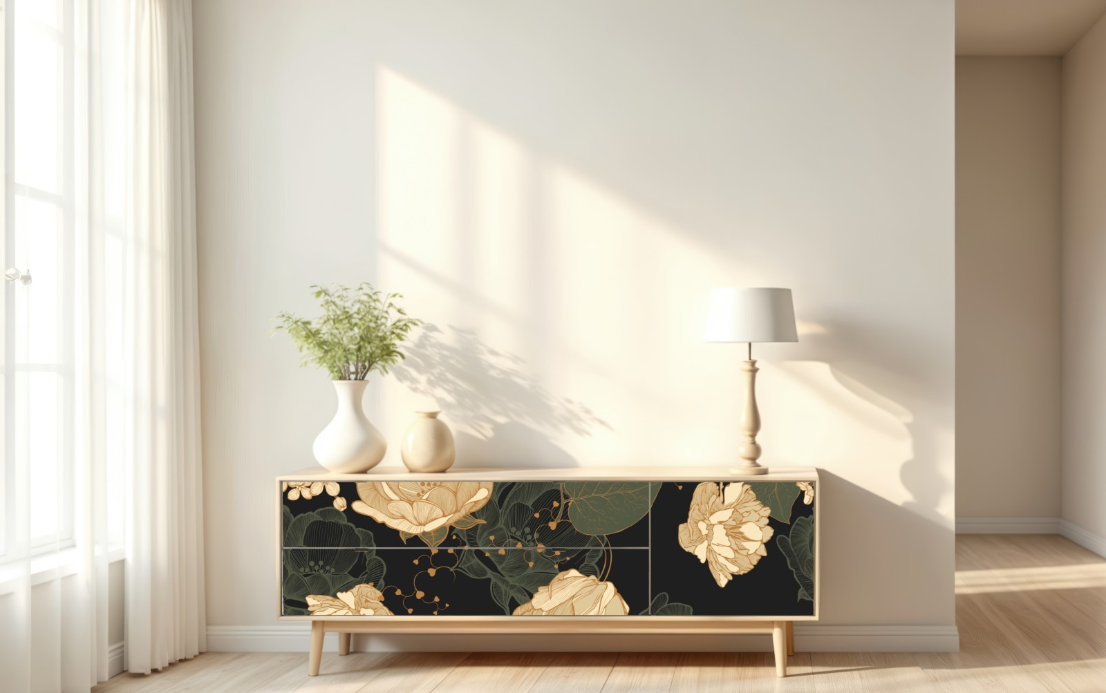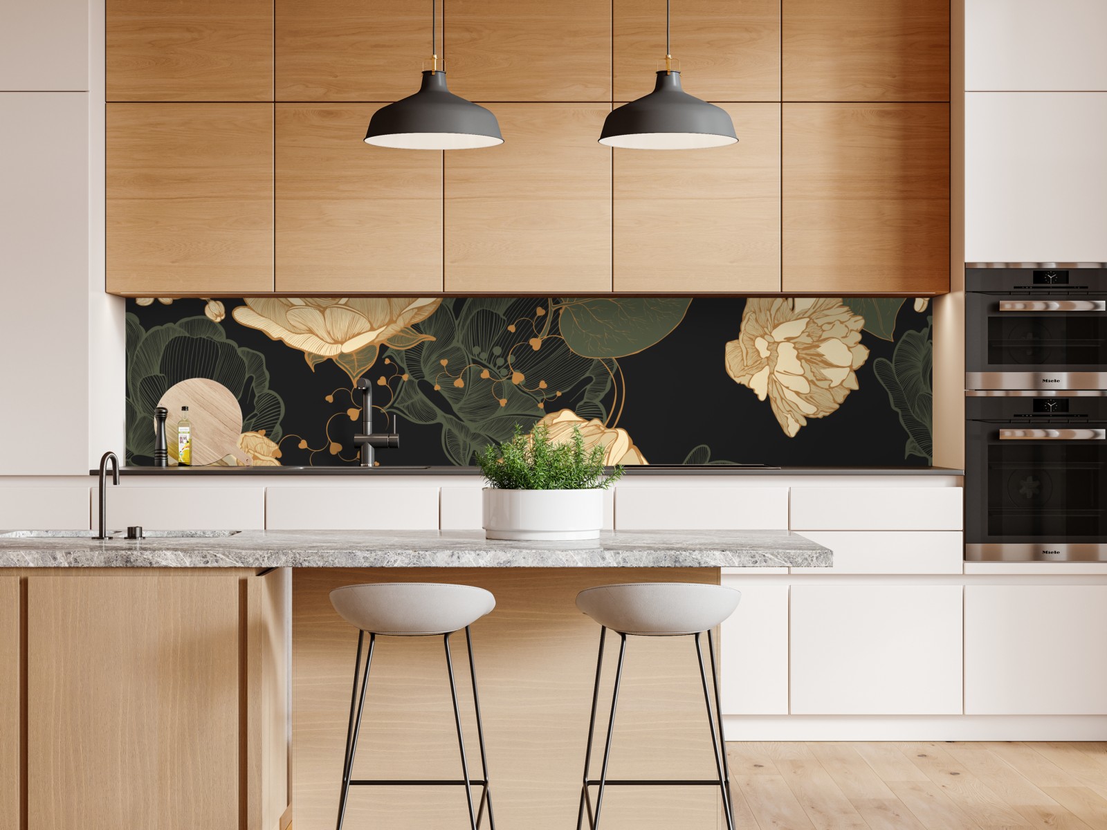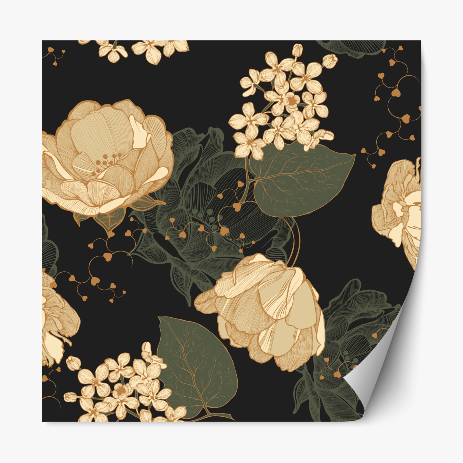 Elegantes, vom Vintage-Stil inspiriertes Blumenmuster in goldenen Tönen auf dunklem Hintergrund, ideal für einen luxuriösen botanischen Akzent im Raum.