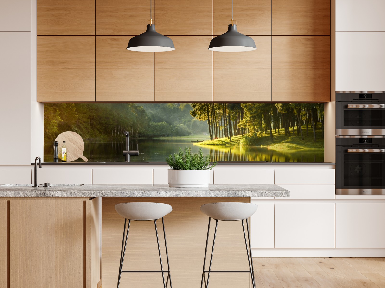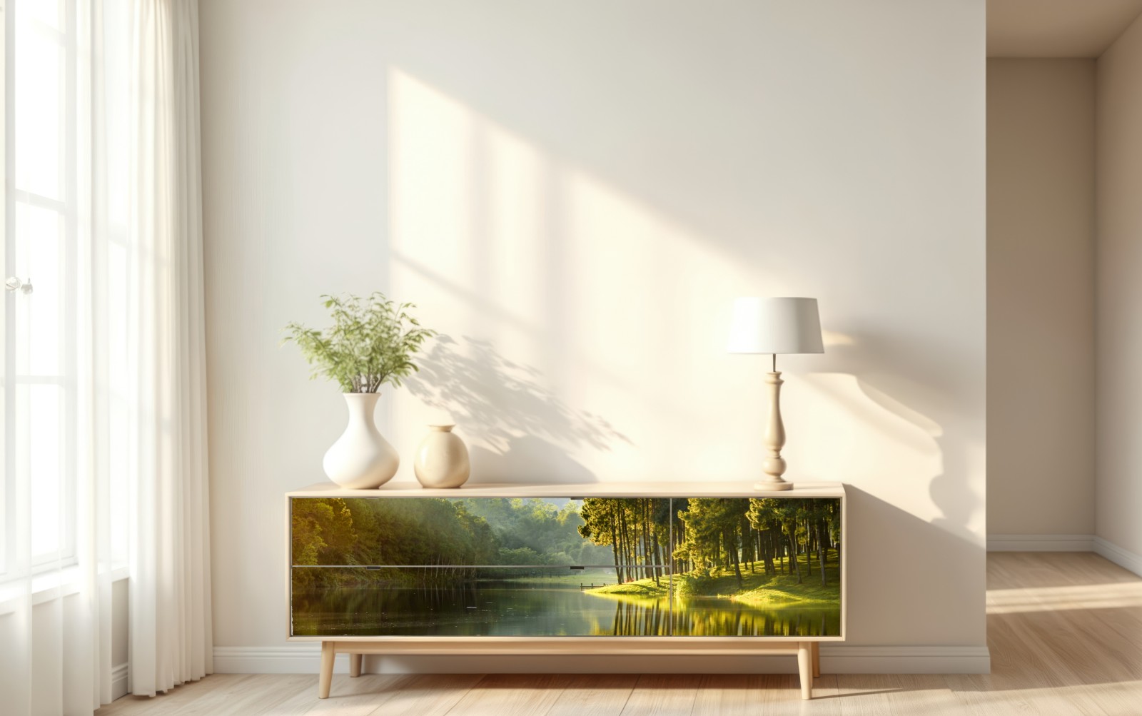 ein ruhiger blick auf kiefern, die sich im stillen stausee spiegeln, und bringt naturverbundenheit und entspannte atmosphäre in jeden raum.