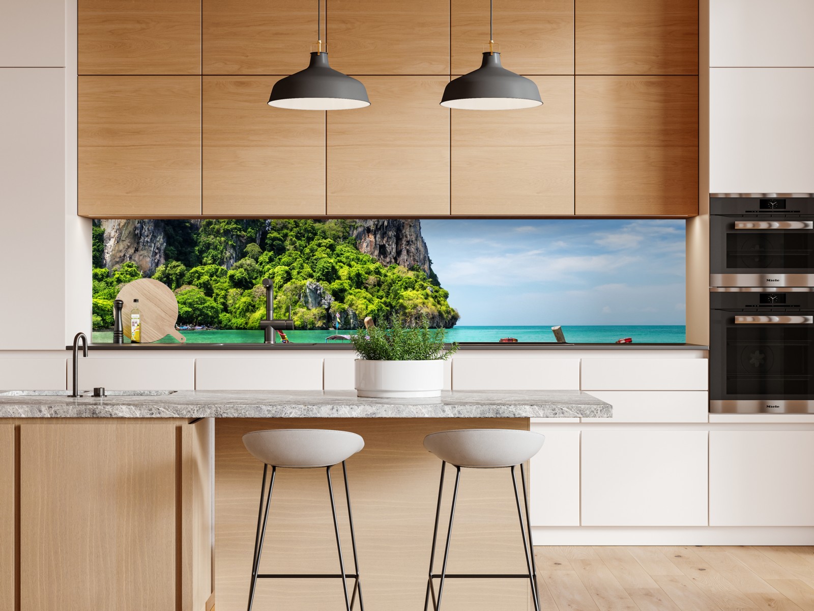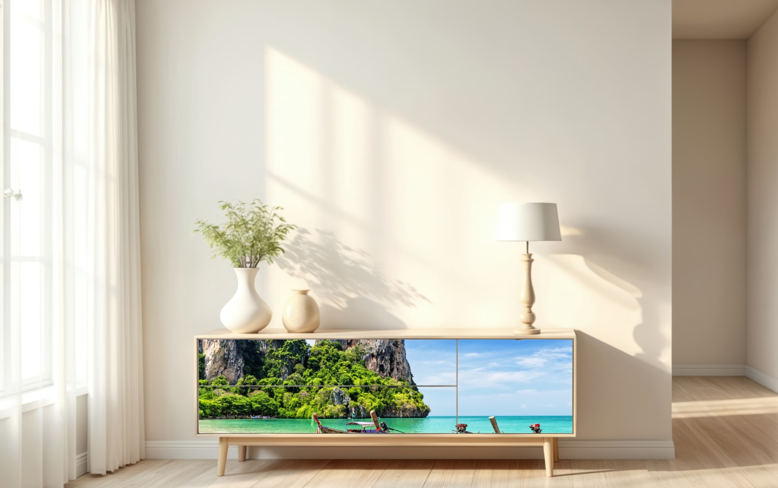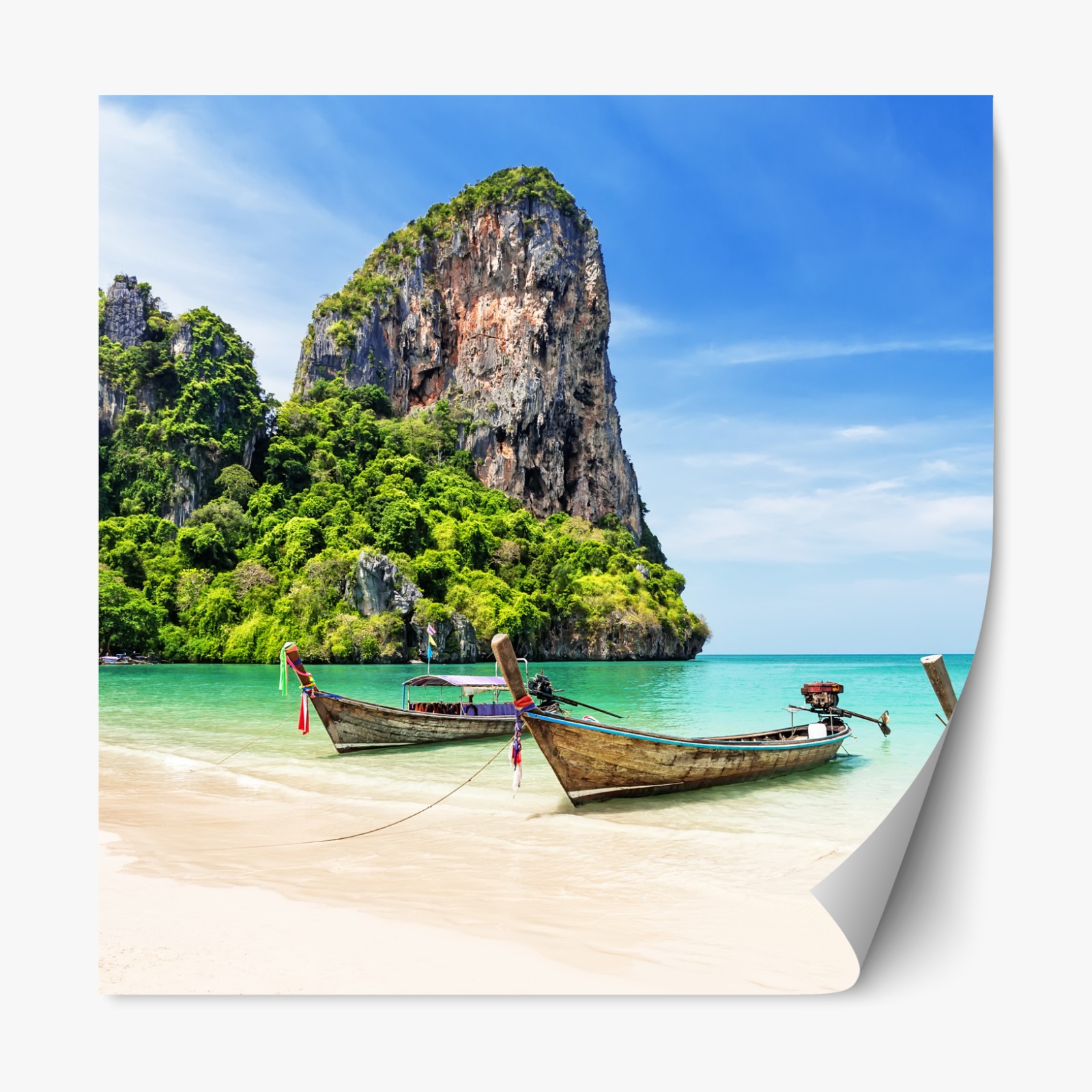Beeindruckende Ansicht von Longtail-Booten am Strand von Railay mit türkisfarbenem Wasser und imposanten Kalksteinfelsen, perfekt, um tropische Ruhe an Ihre Wand zu bringen.