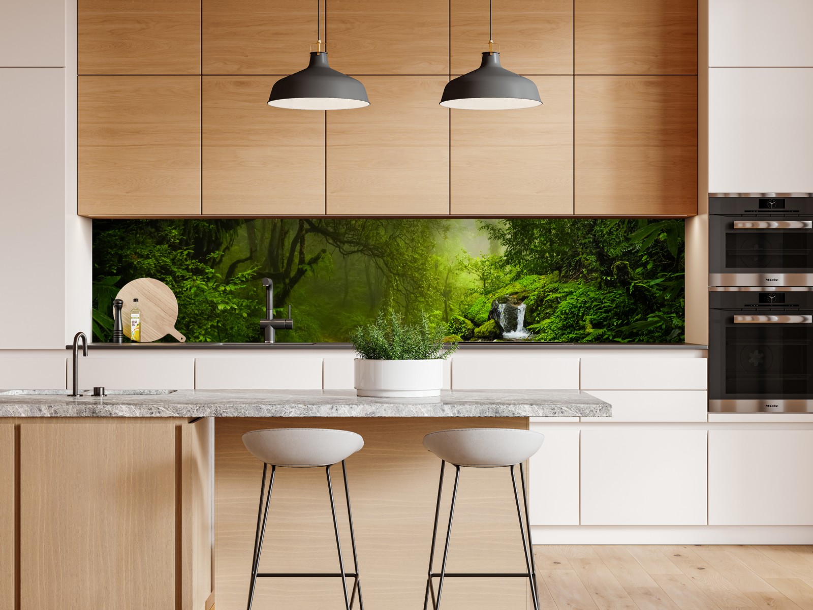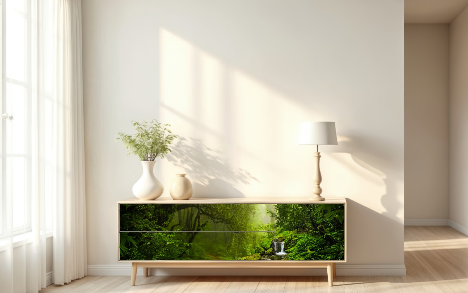 bringen sie natur in ihr zuhause mit einem lebendigen nebligen waldwasserfall, der entspannendes grün und tiefe an jede wand bringt.