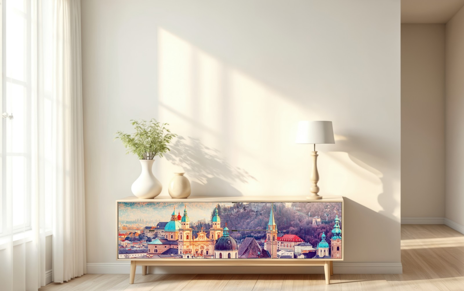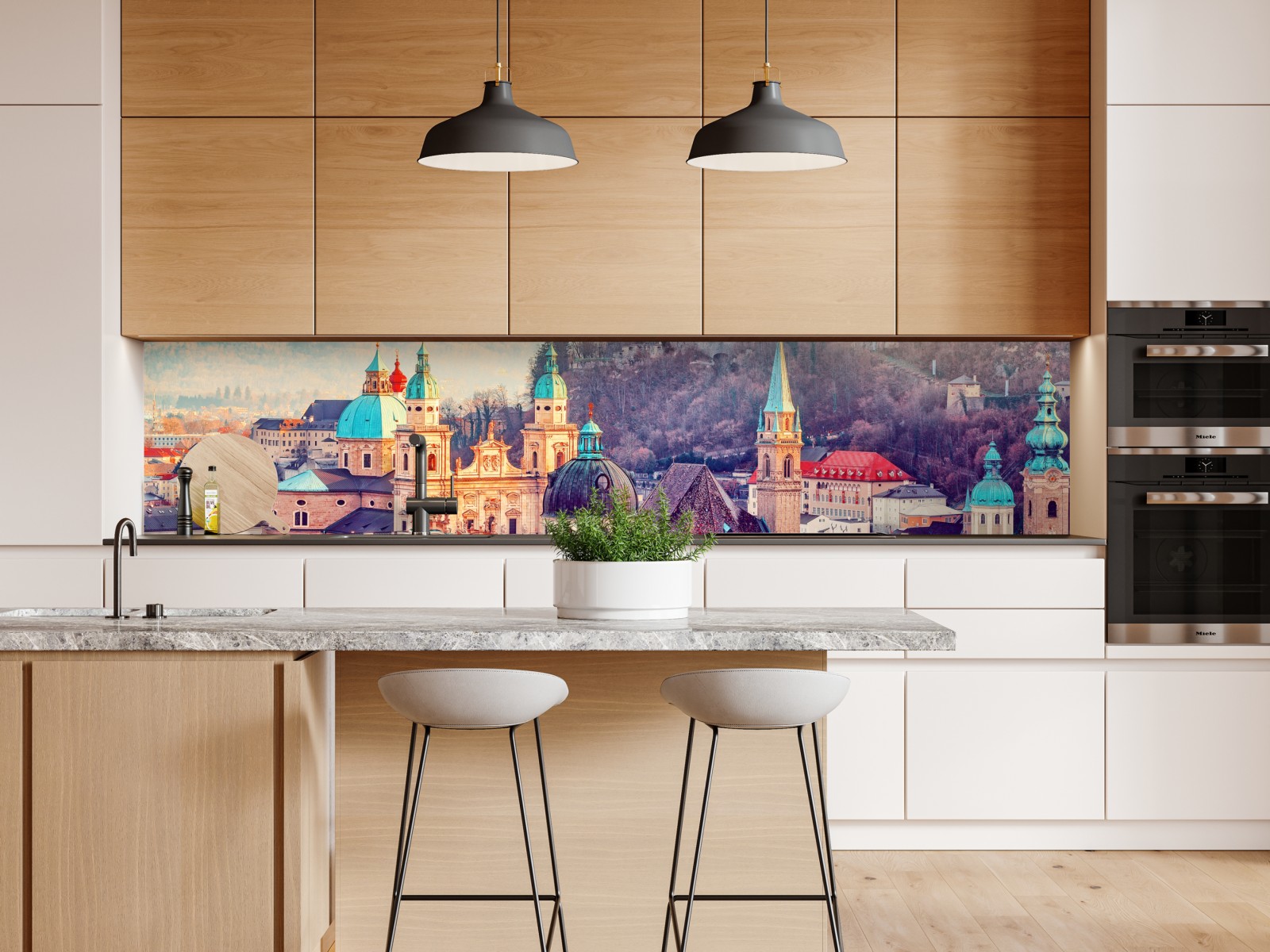 Romantische Panoramaansicht der historischen Skyline von Salzburg mit Festung und Alpenkulisse, perfekt zur Verschönerung jedes Interieurs.