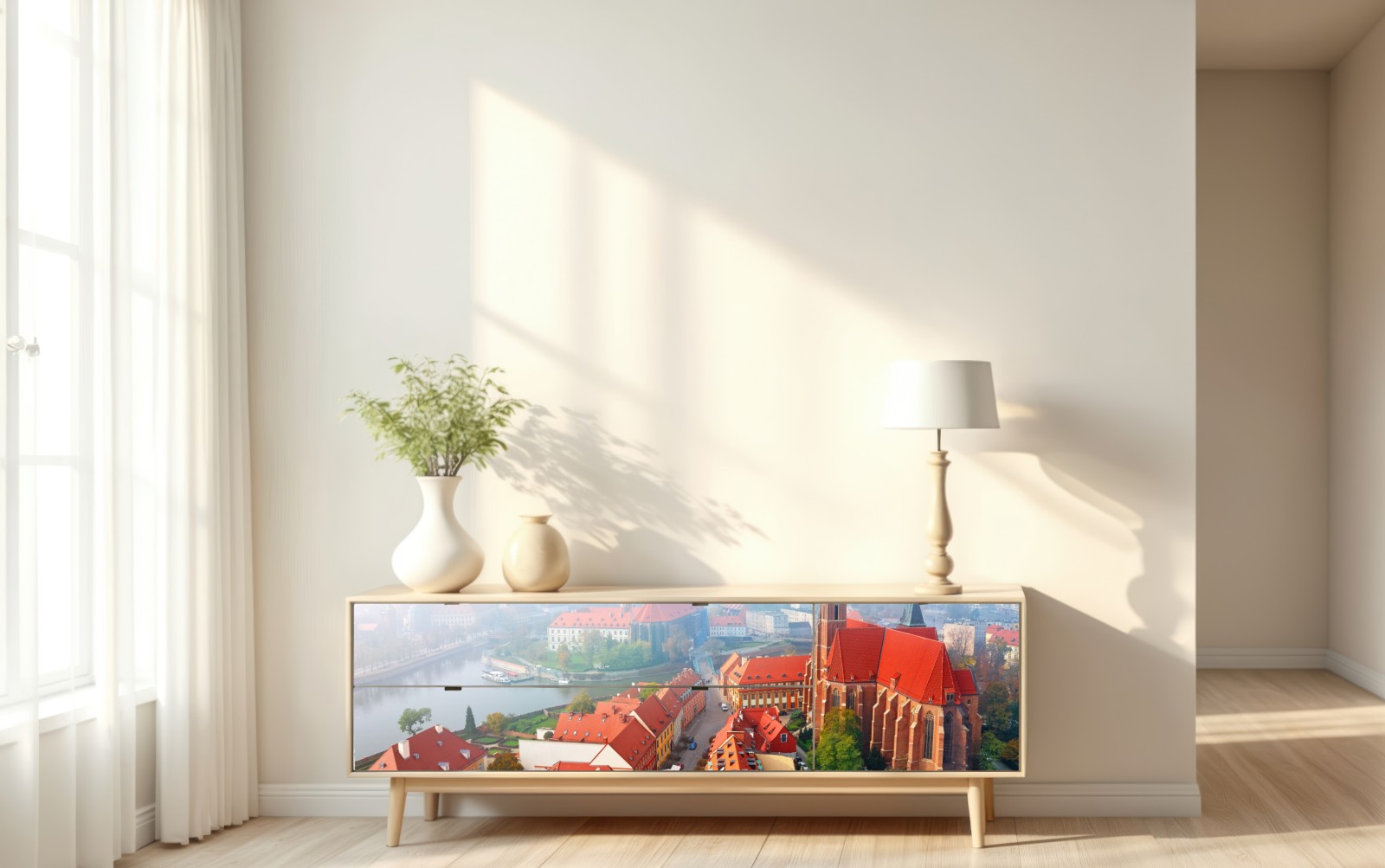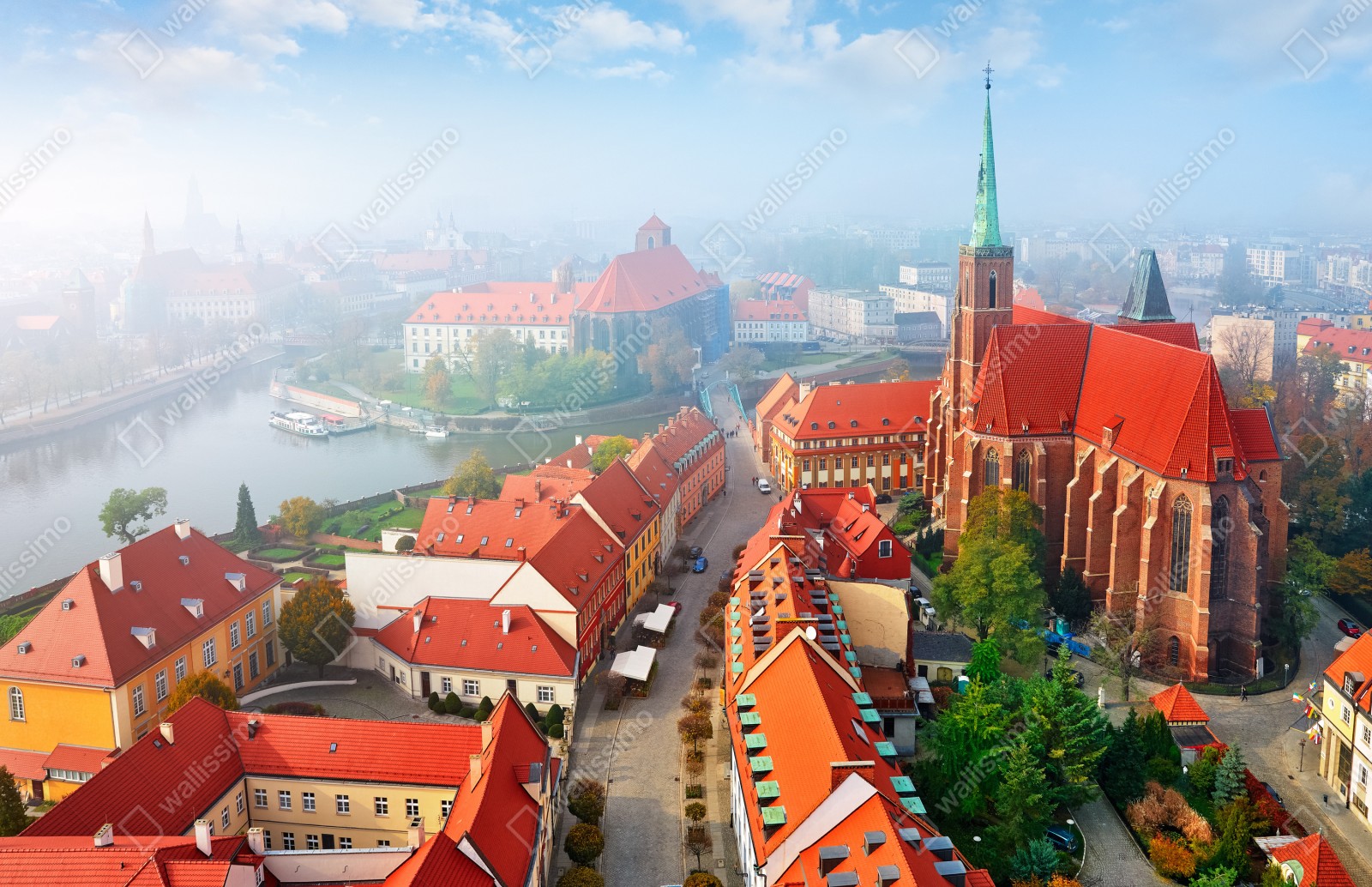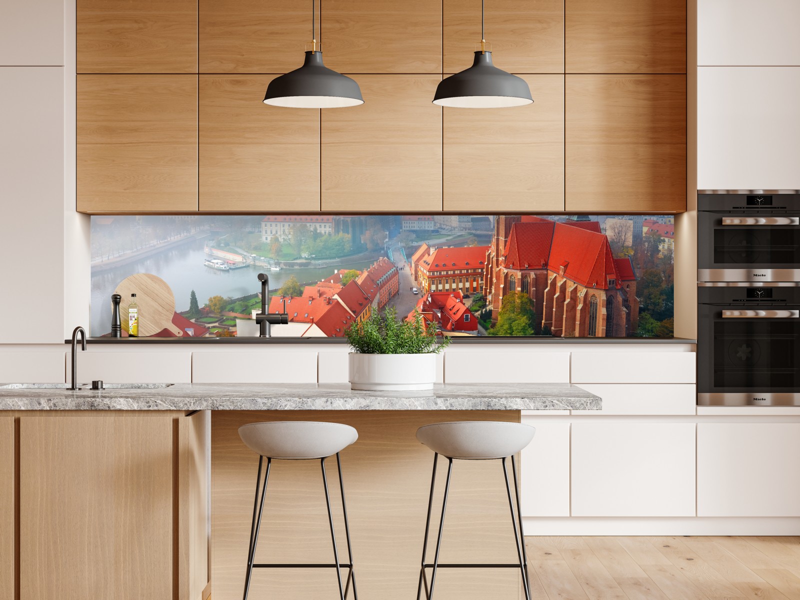 Beeindruckende Luftaufnahme einer historischen europäischen Stadt mit leuchtend roten Dächern und einer markanten Kirchturmspitze, ideal zur Aufwertung moderner Wohnräume mit urbanem Flair.
